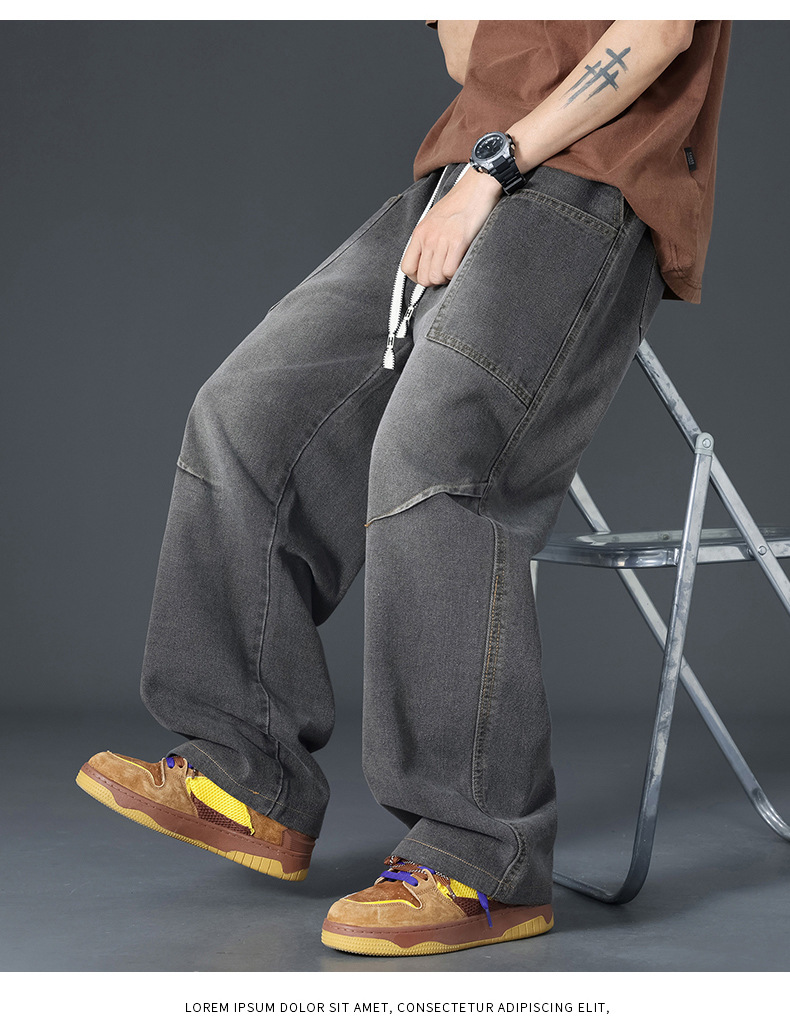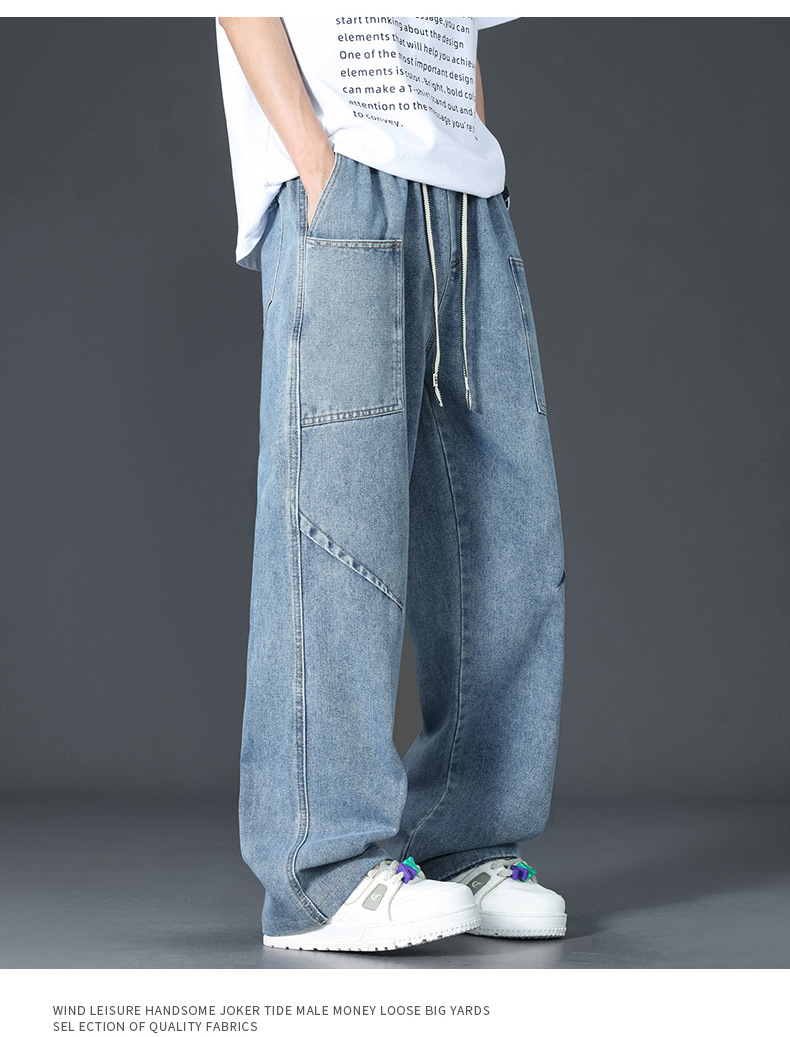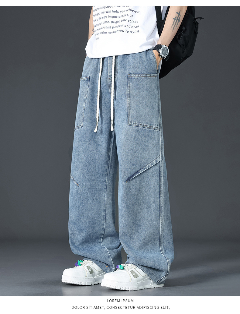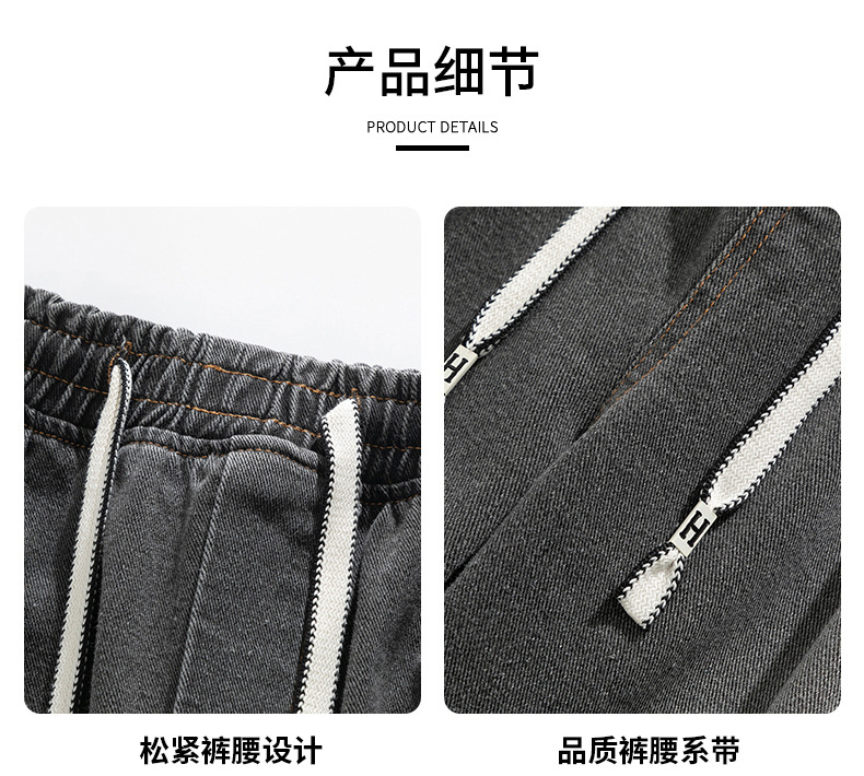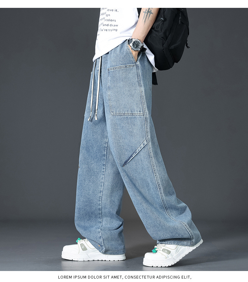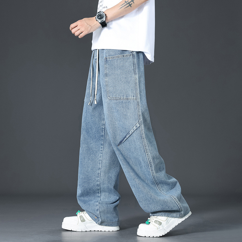 美式复古解构裤子男夏款抽绳松紧腰软牛仔裤多口袋水洗做旧微喇裤