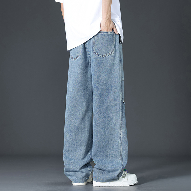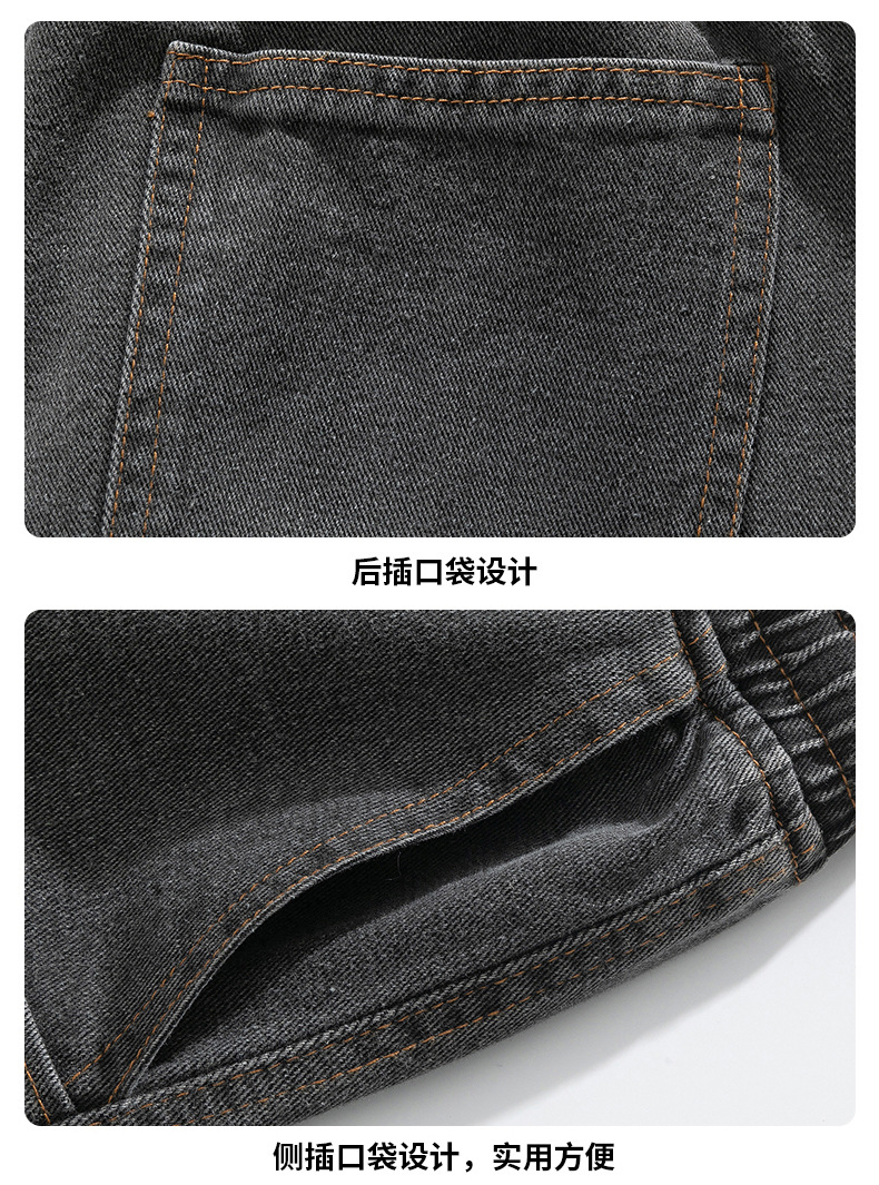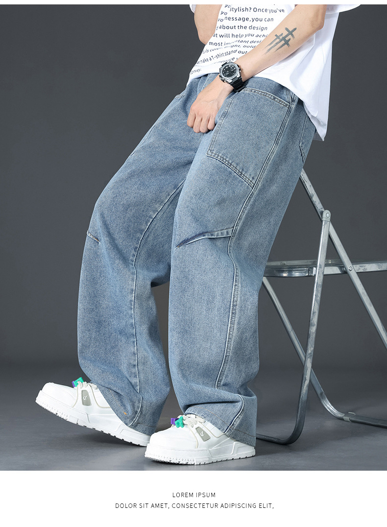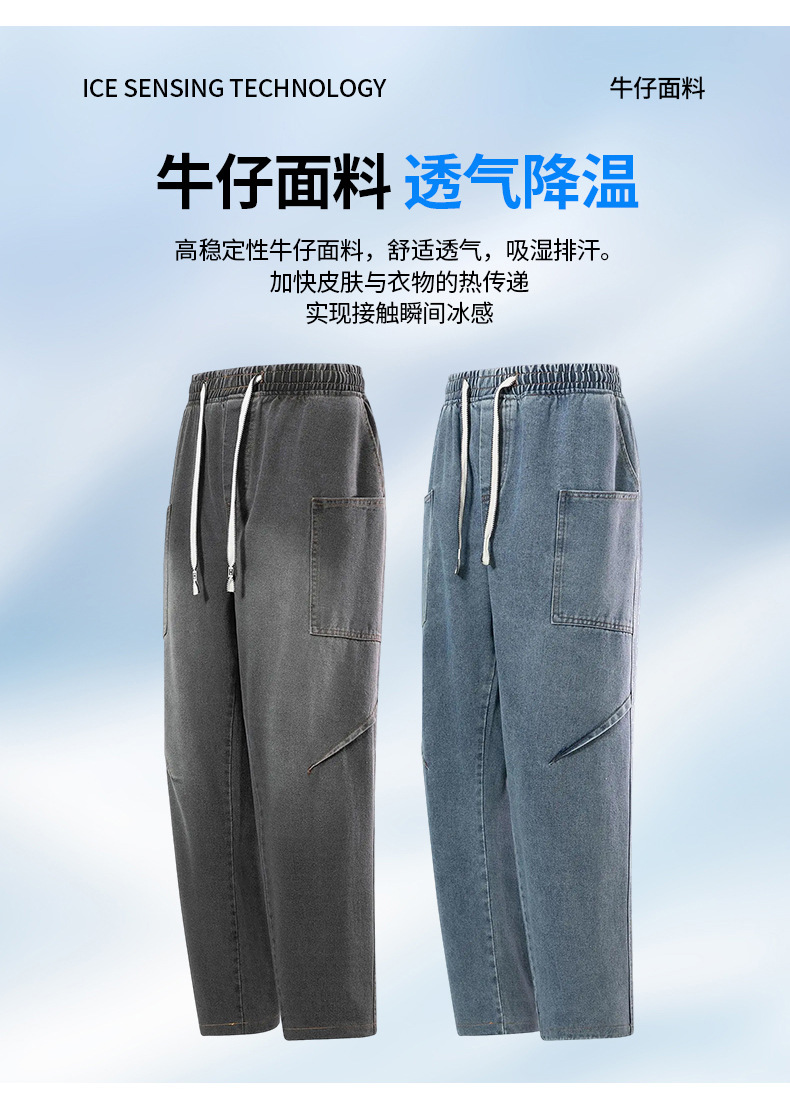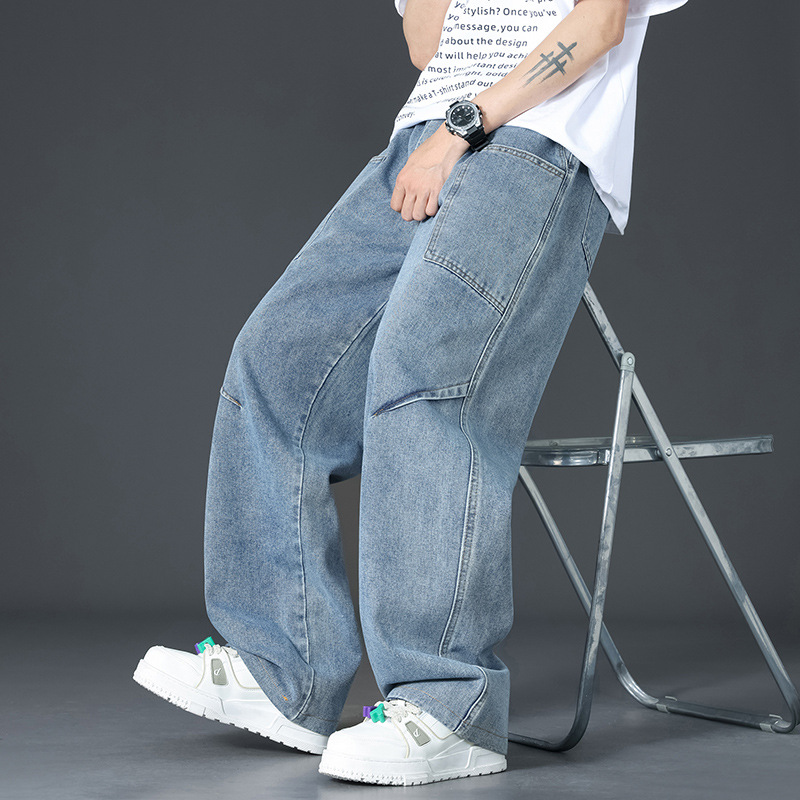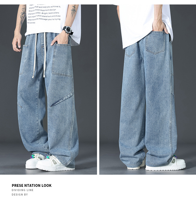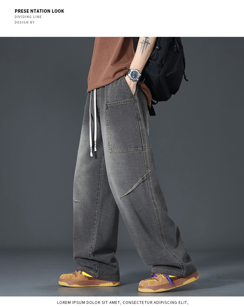 美式复古解构裤子男夏款抽绳松紧腰软牛仔裤多口袋水洗做旧微喇裤