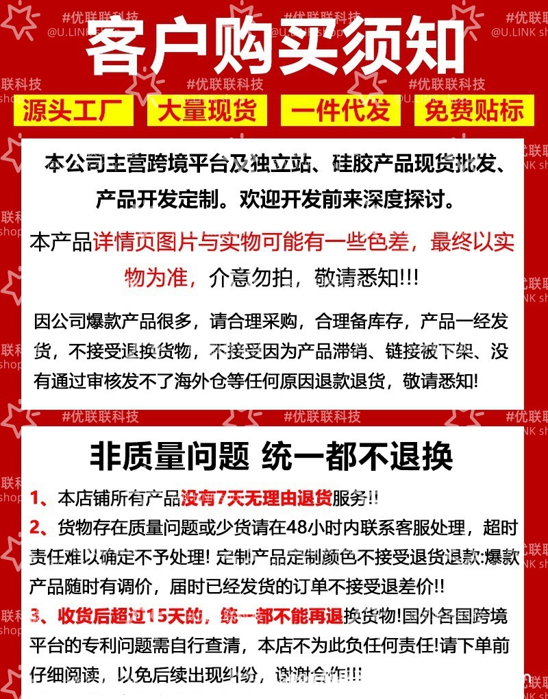 1、爆款产品不支持退货!!!介意者慎拍!避免纠纷大货请下样品单确认!产品一经发出概不接受任何理由退货,有问题可以换货!(不支持七天无理由退货退款,产品有问题麻烦签收2天内联系客服如果逾期告知客服这边是不同意退款退货哦)