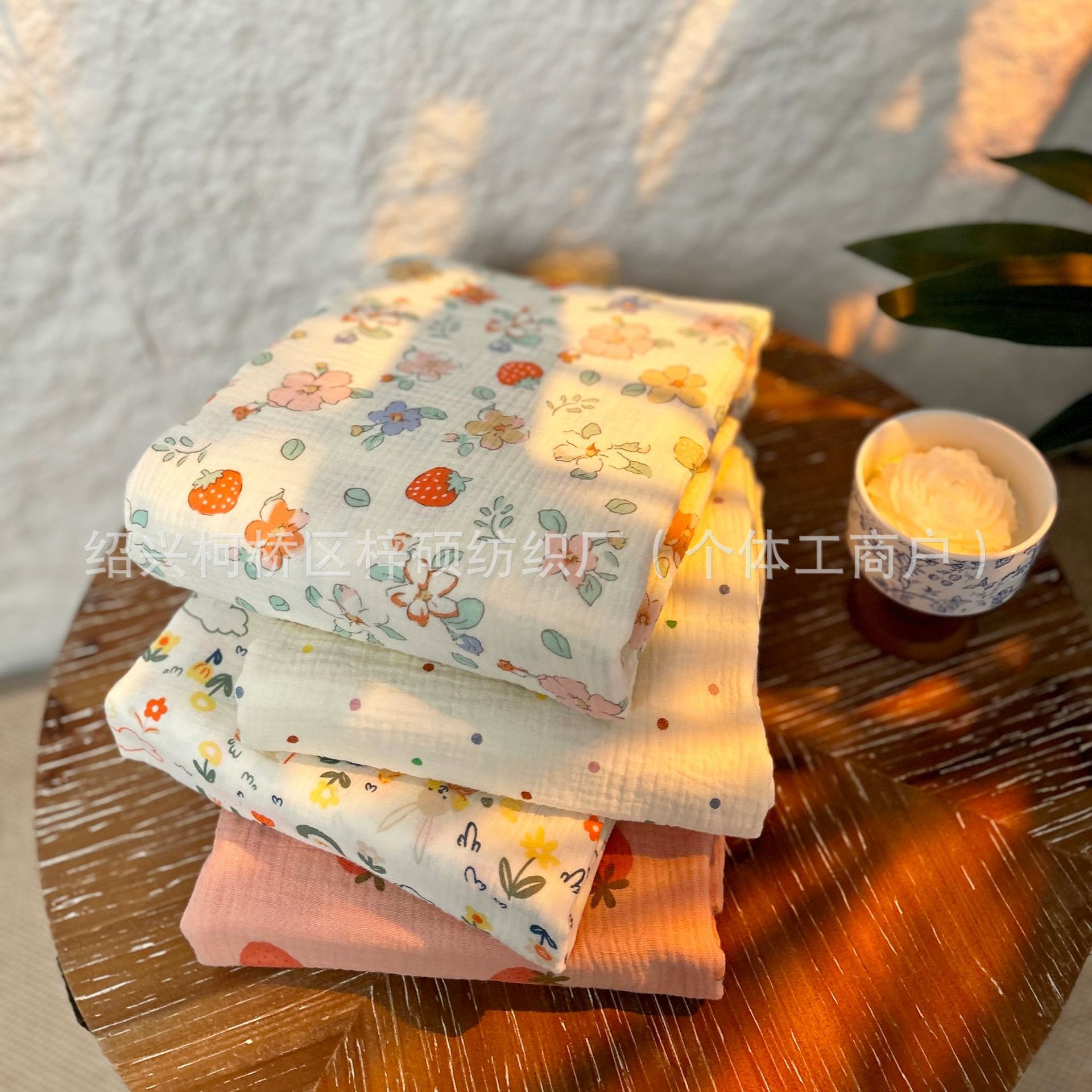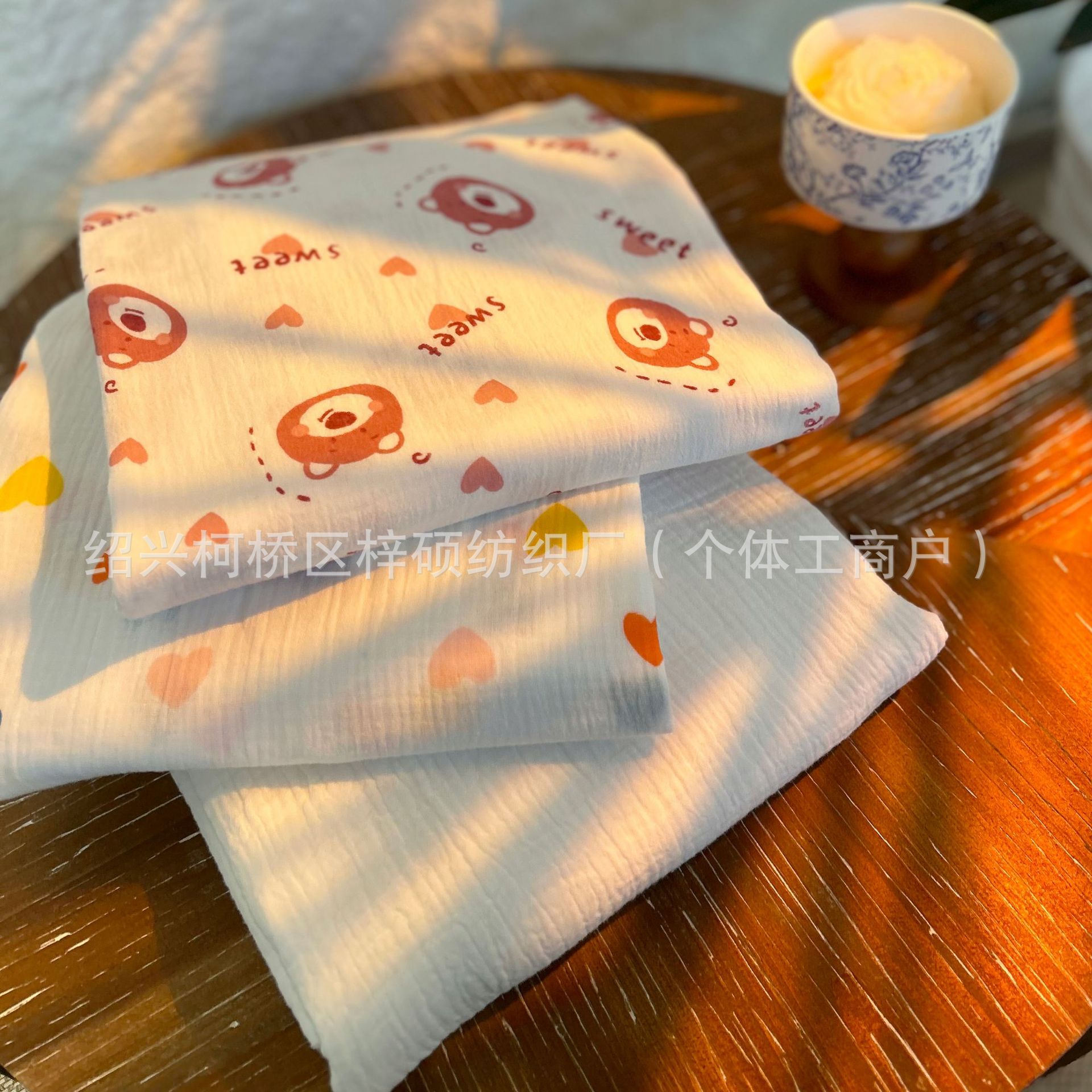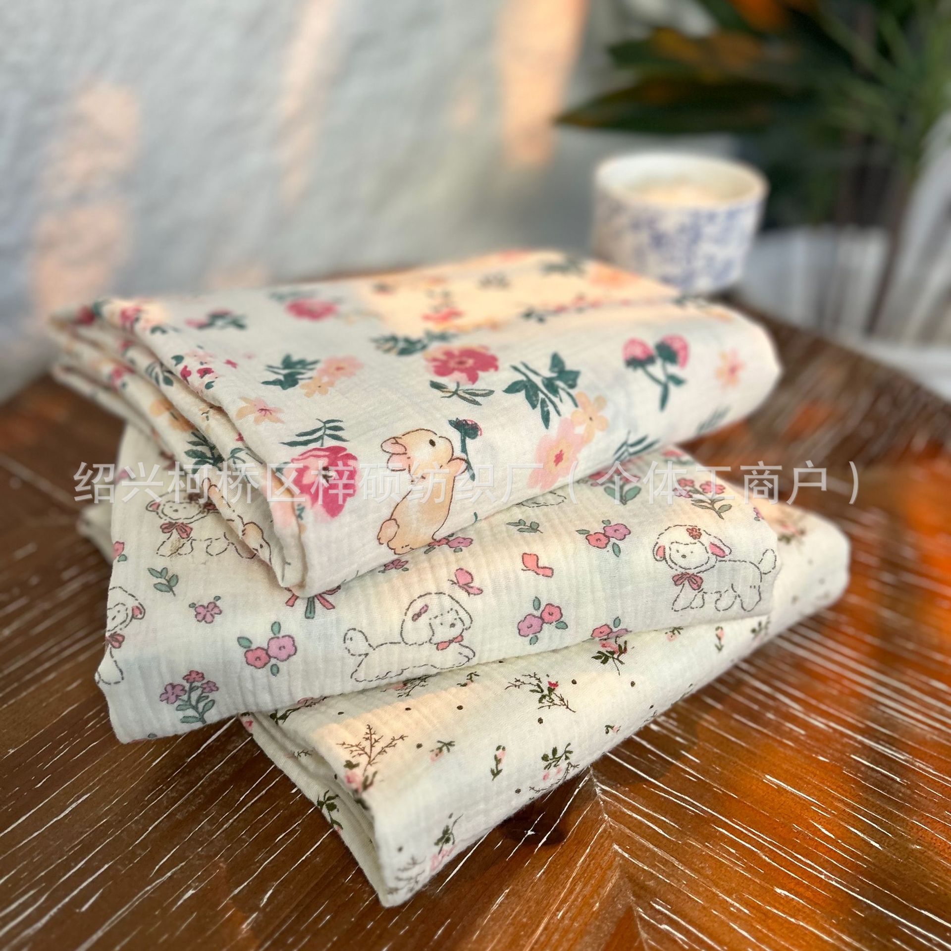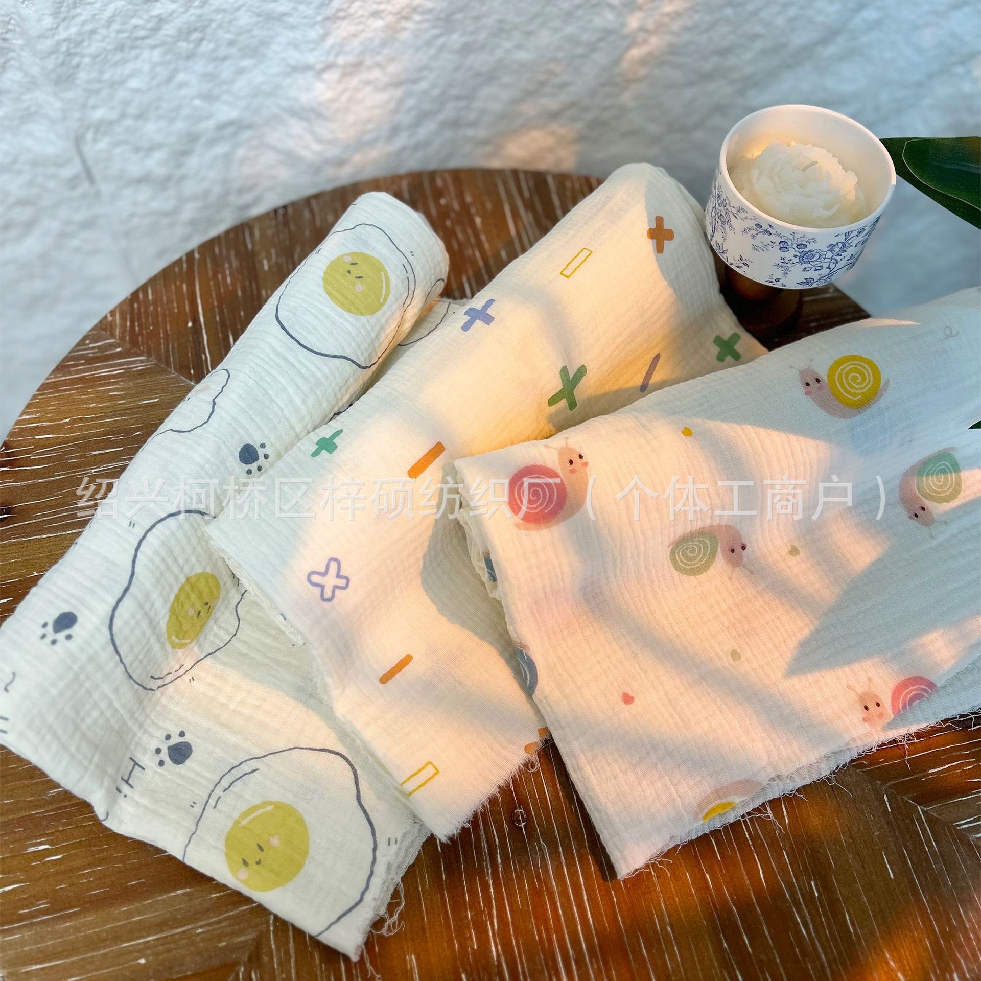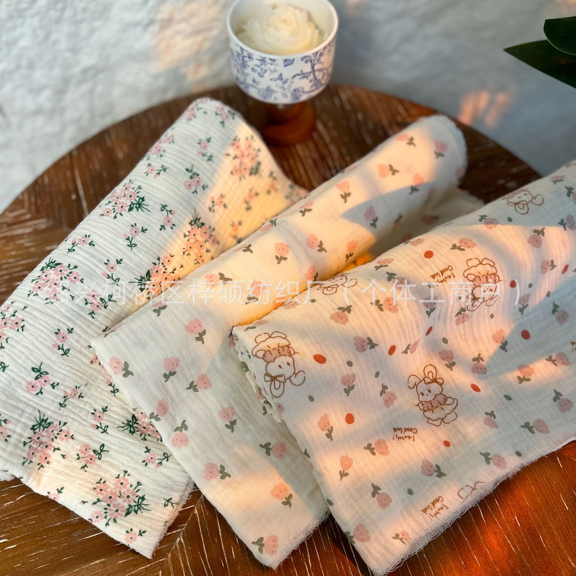 全棉薄款双层纱布绉布印花婴童服装口水巾家居睡衣面料家纺