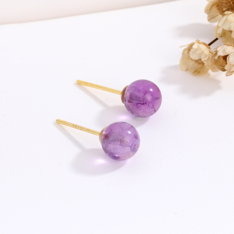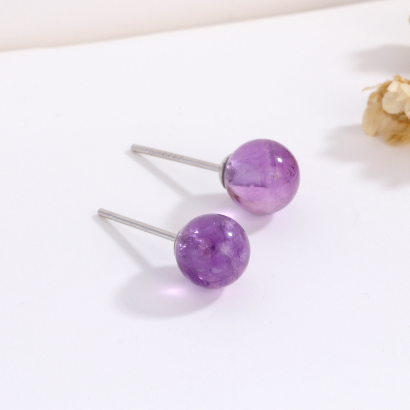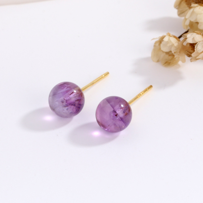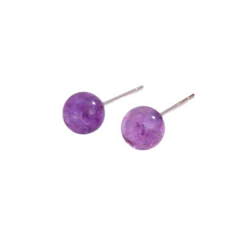 契爱 S925银天然紫晶耳钉女薰衣草紫玉髓耳饰紫水晶圆珠耳环跨境