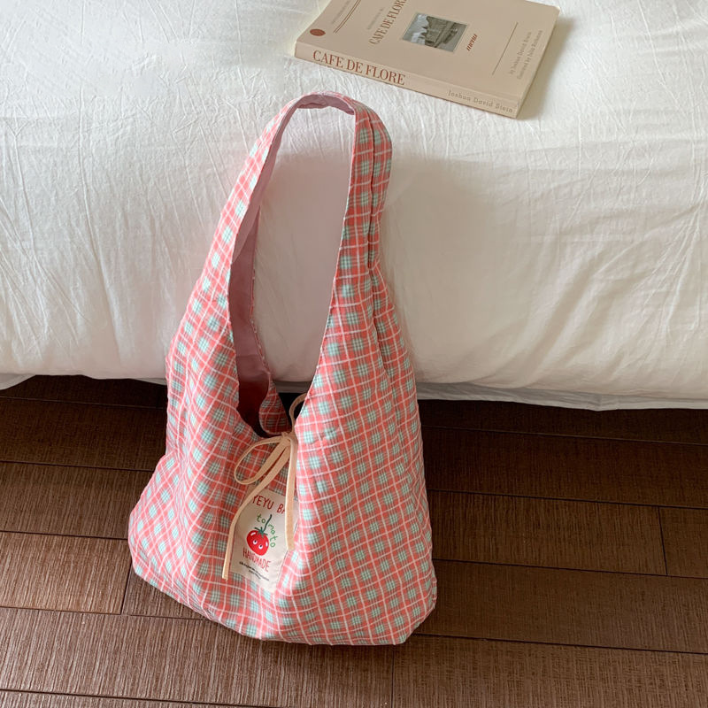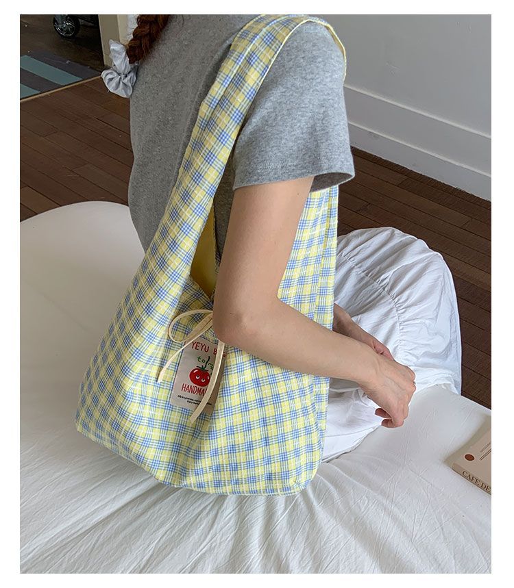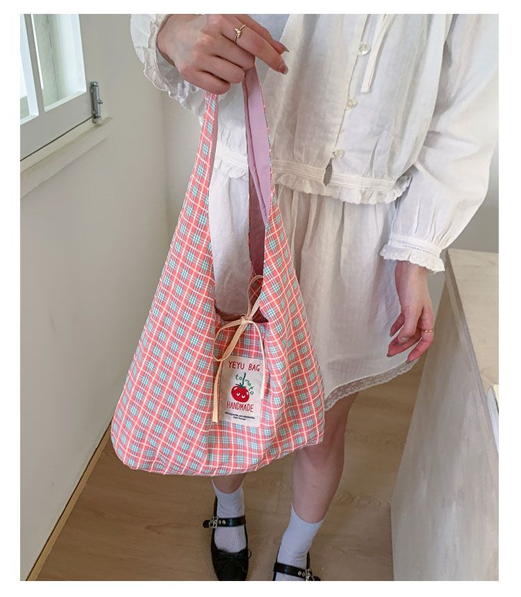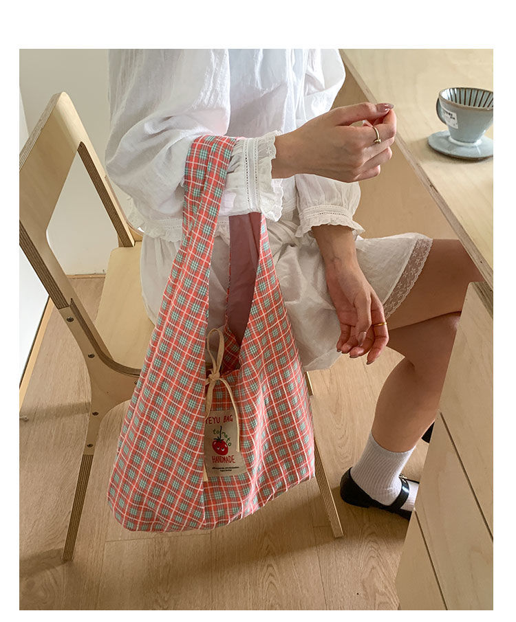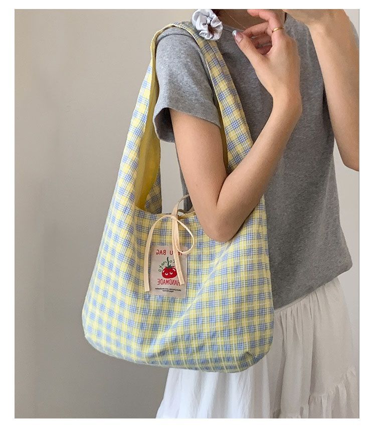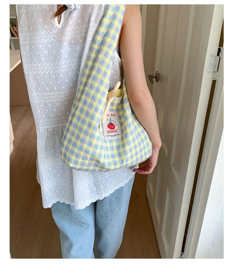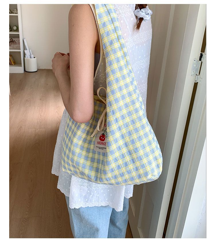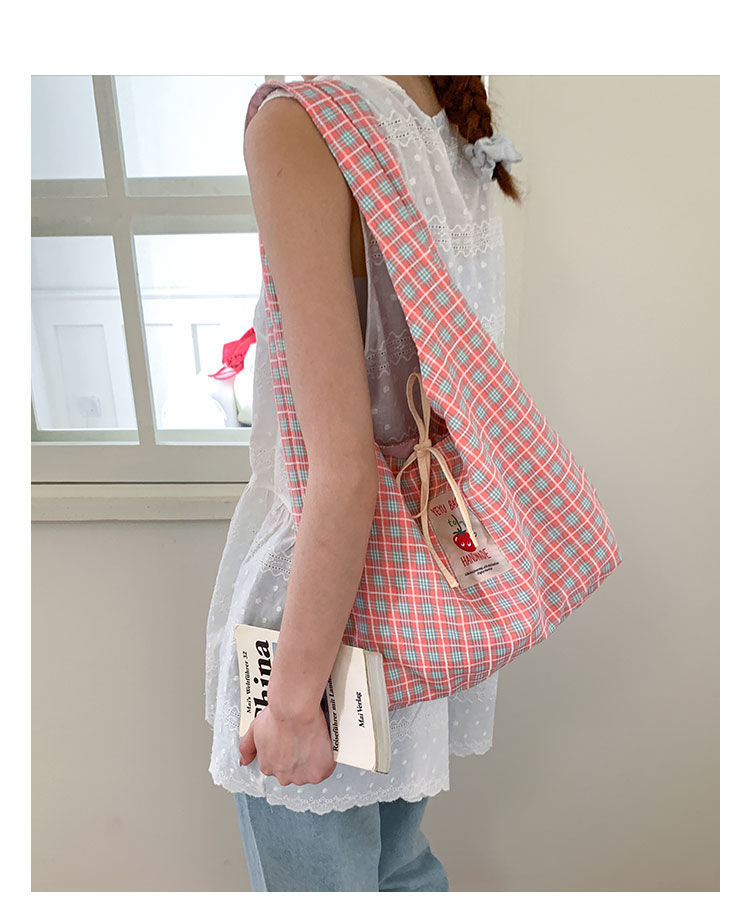 新款日系小清新格子时尚手提包学生大容量上课帆布包女便当包