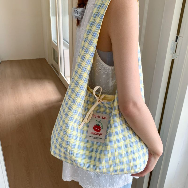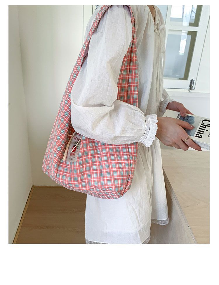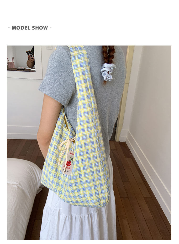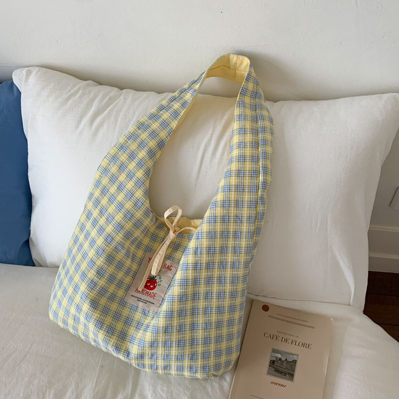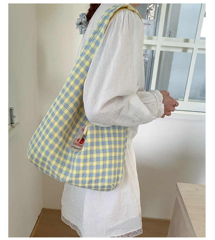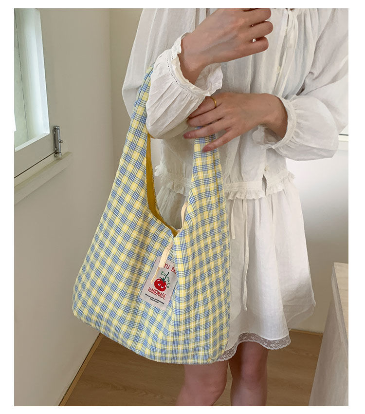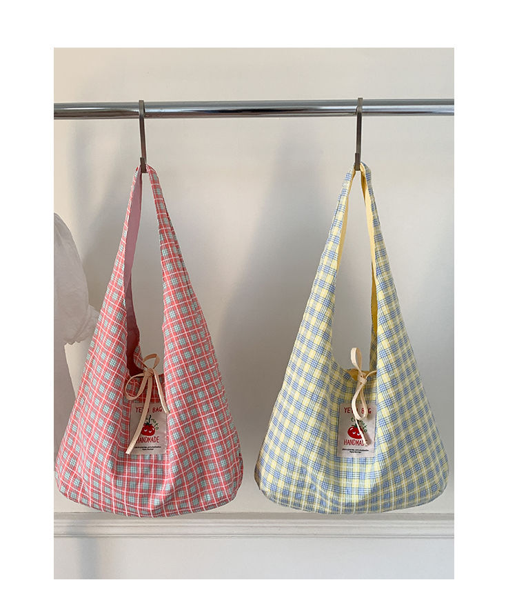 新款日系小清新格子时尚手提包学生大容量上课帆布包女便当包