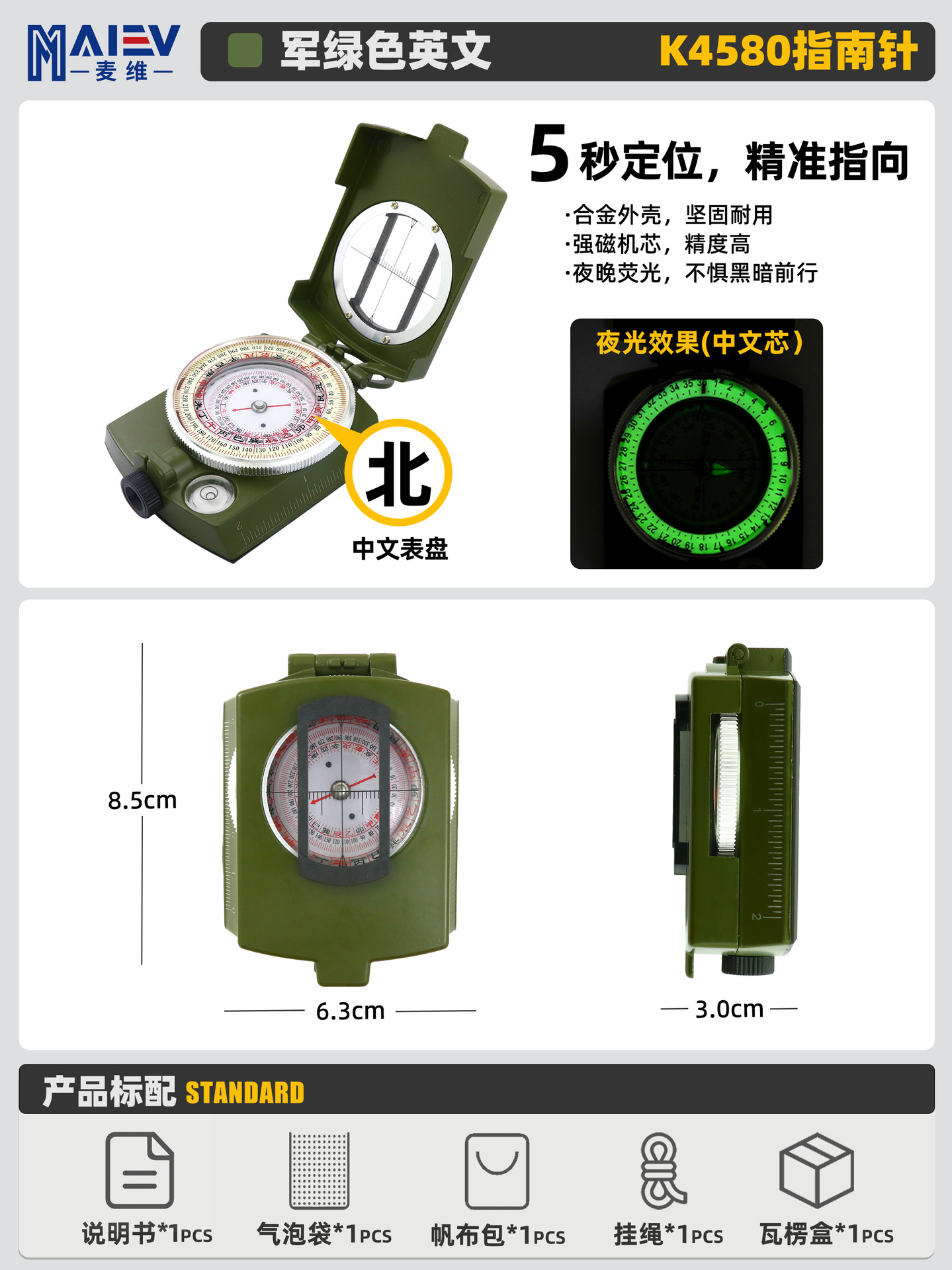 源头工厂K4580高精度美式多功能指南针指北针户外野营夜光指北针