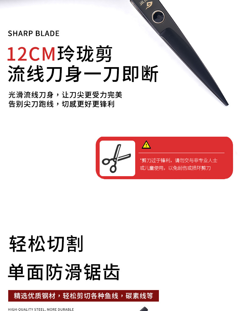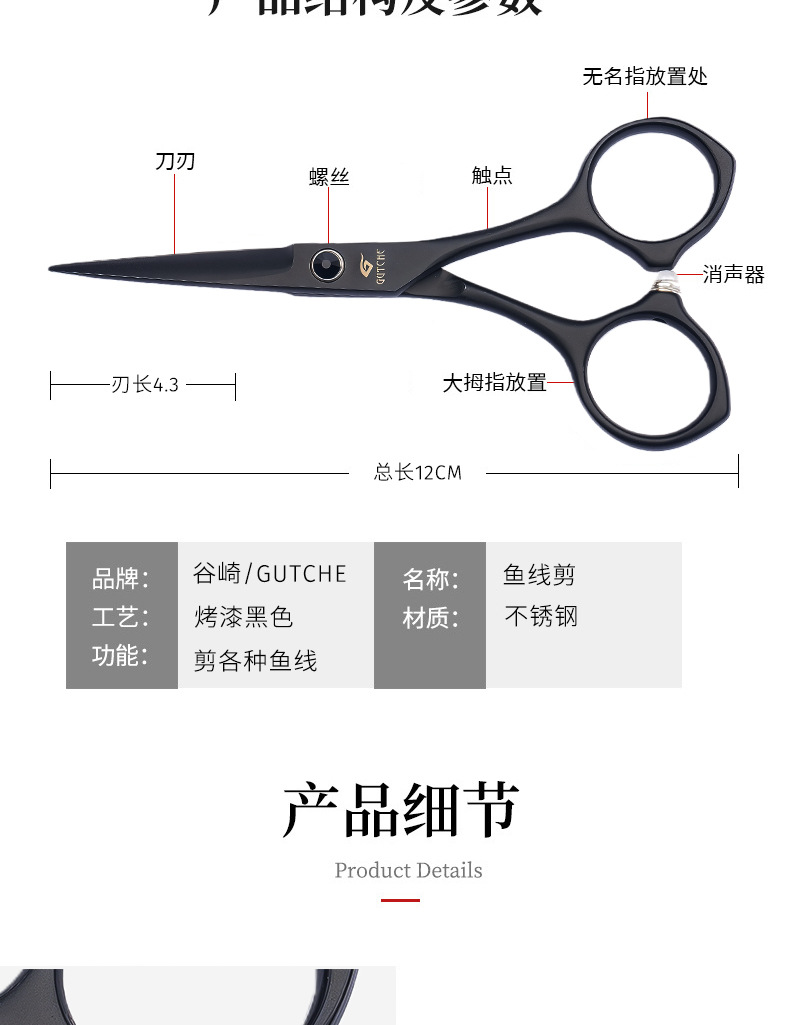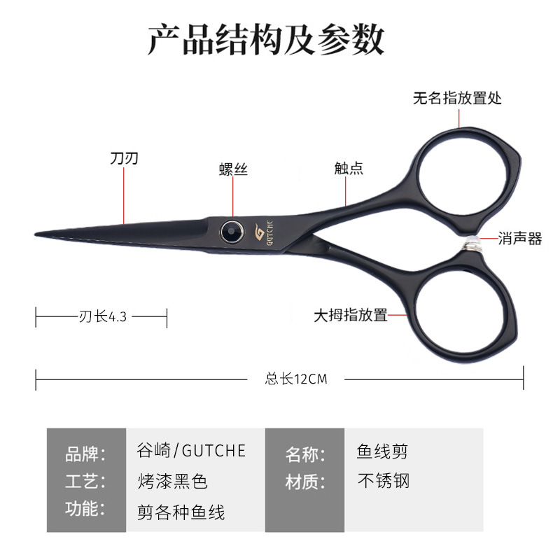 鱼线剪刀黑色金色银色不锈钢平剪带小齿4.5寸小剪刀垂钓用品钓鱼