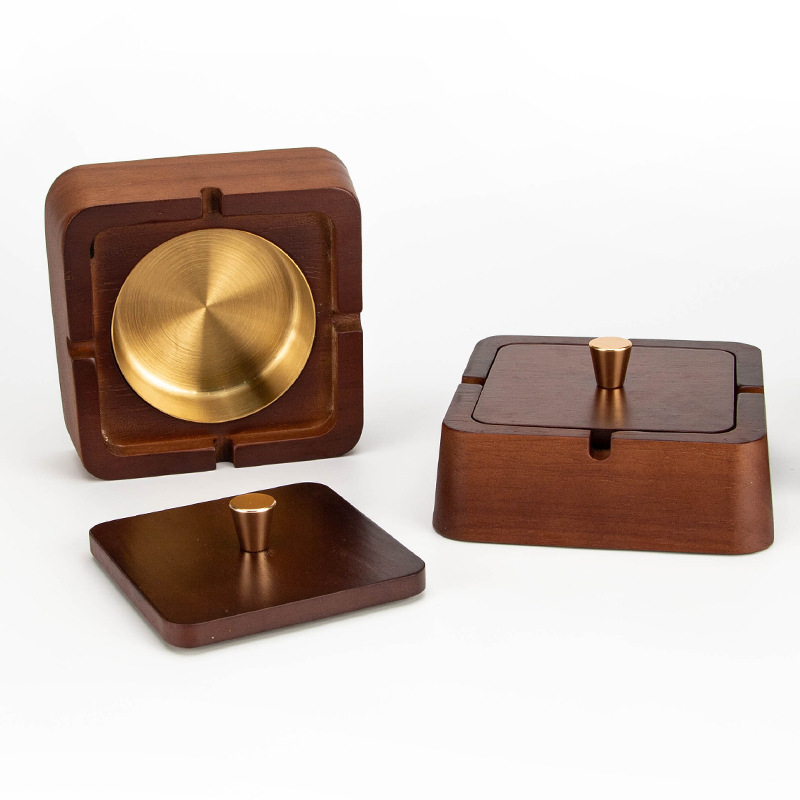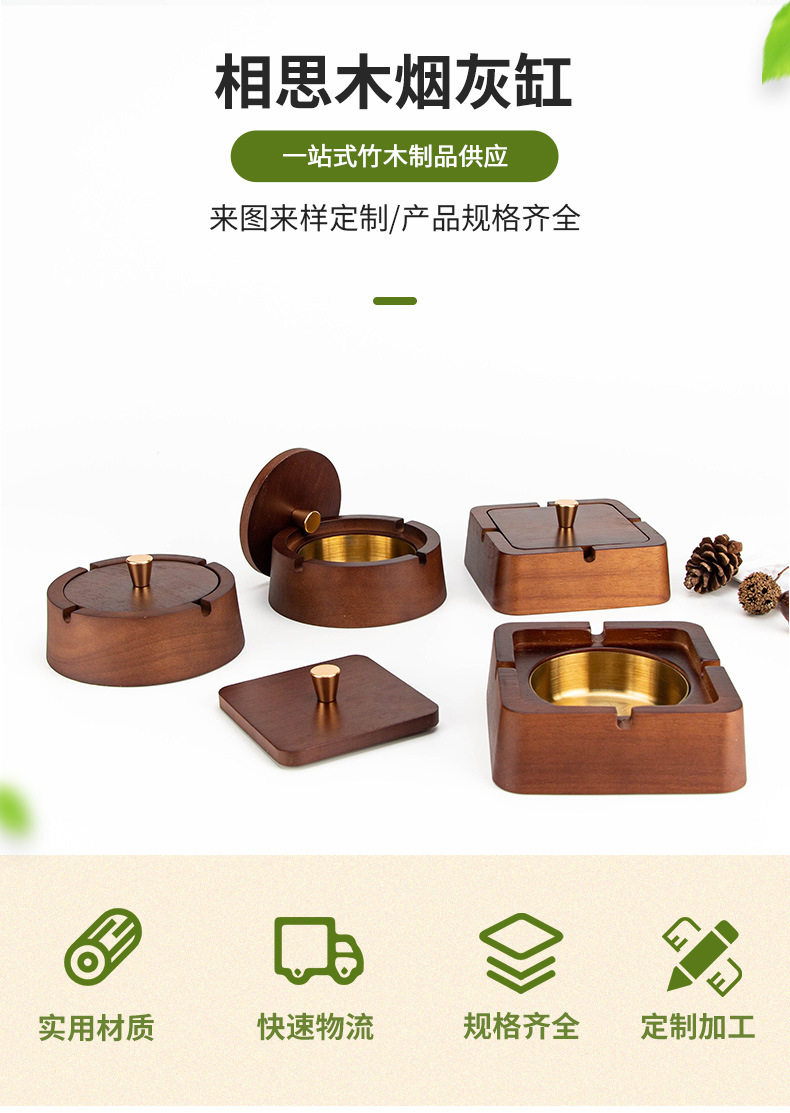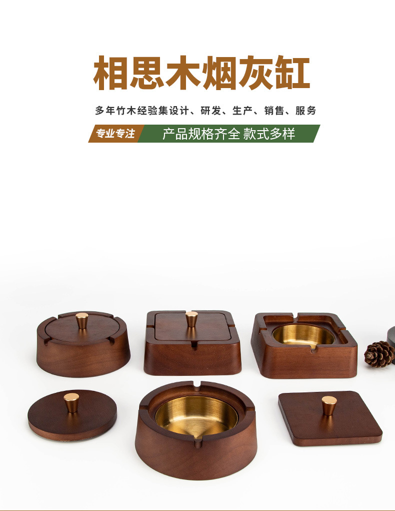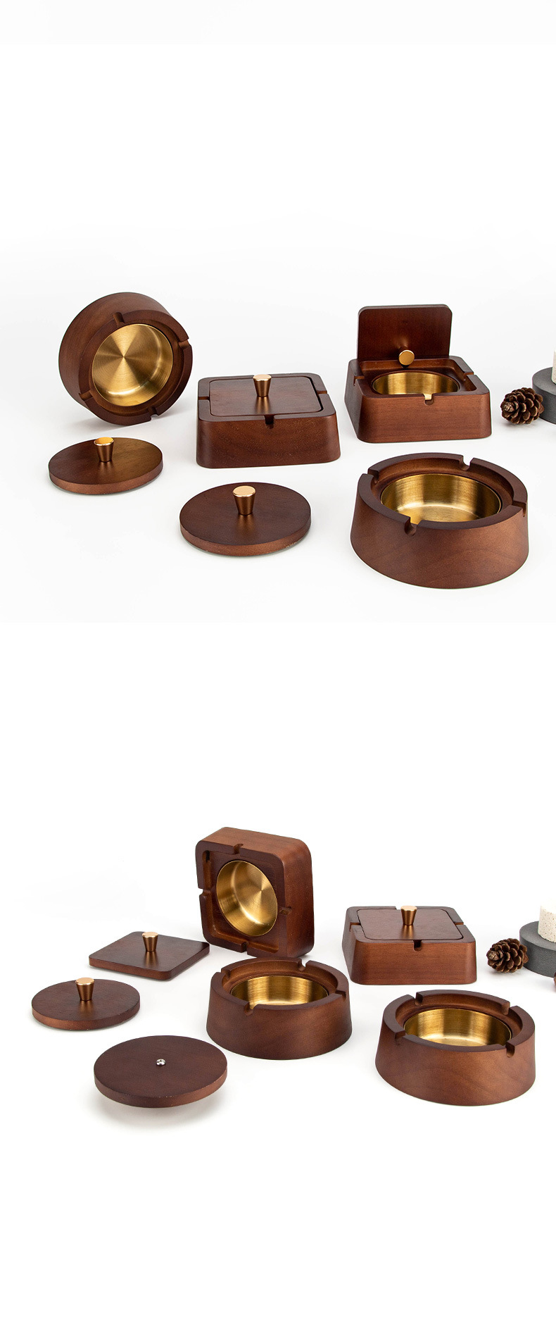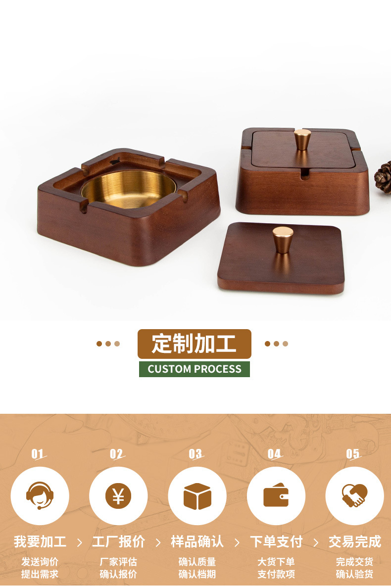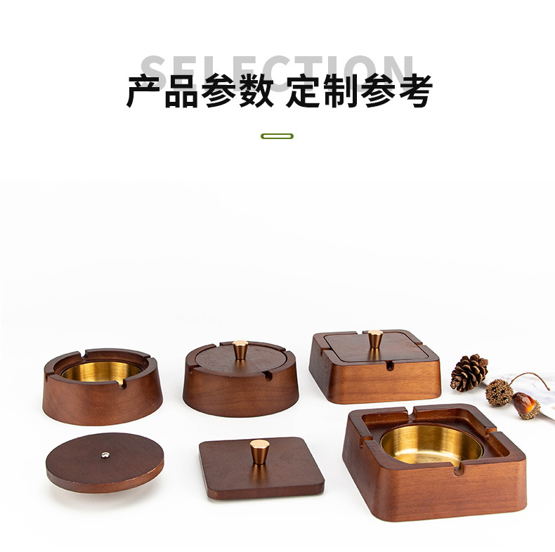 跨境实木烟灰缸家用客厅带盖防飞灰不锈钢中国风礼品木质工艺品