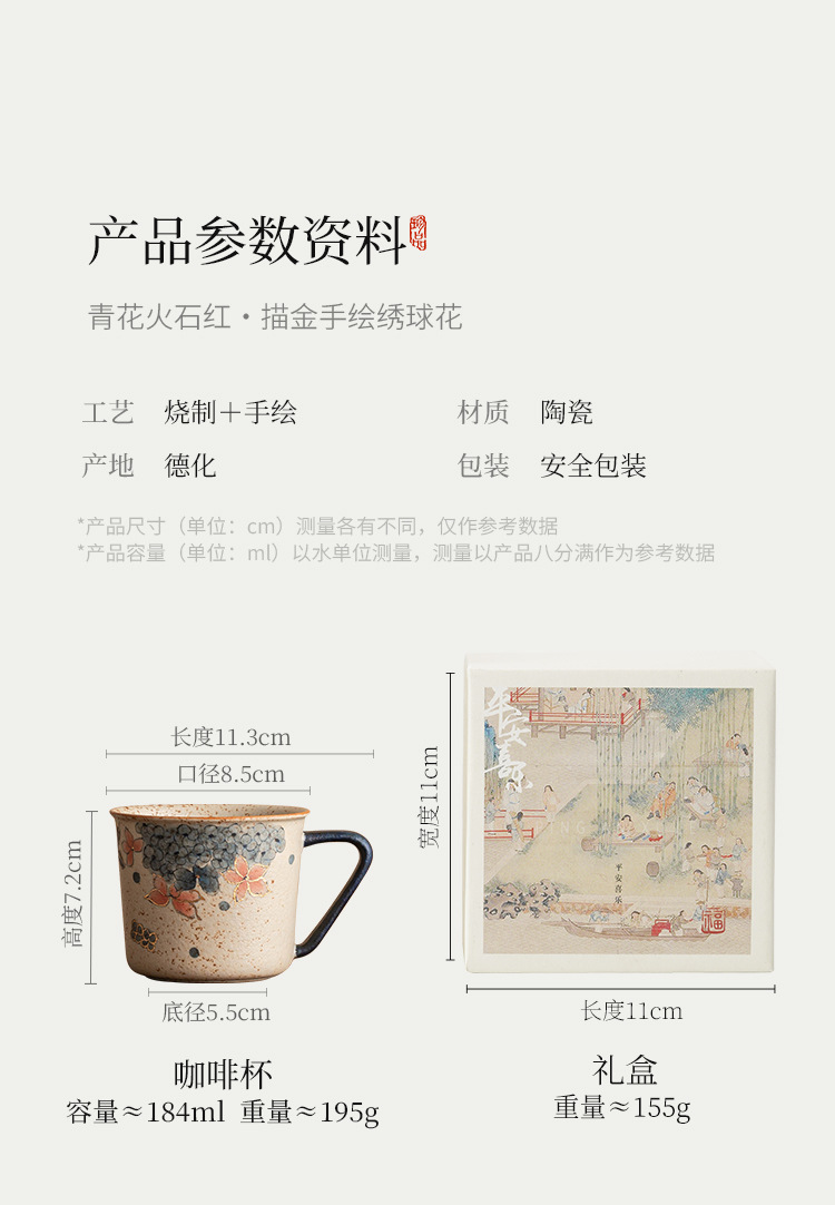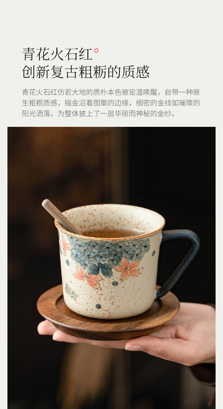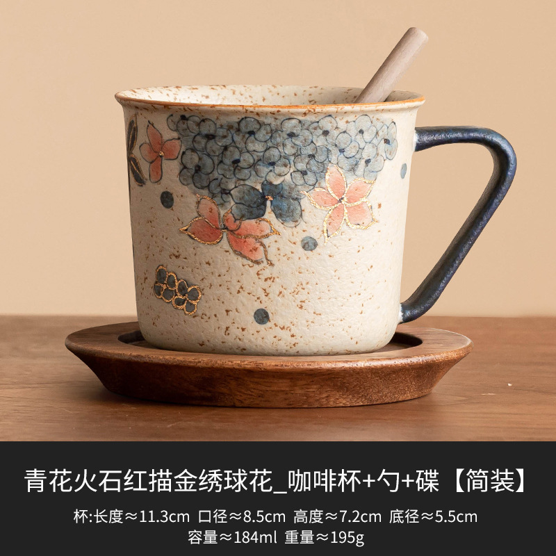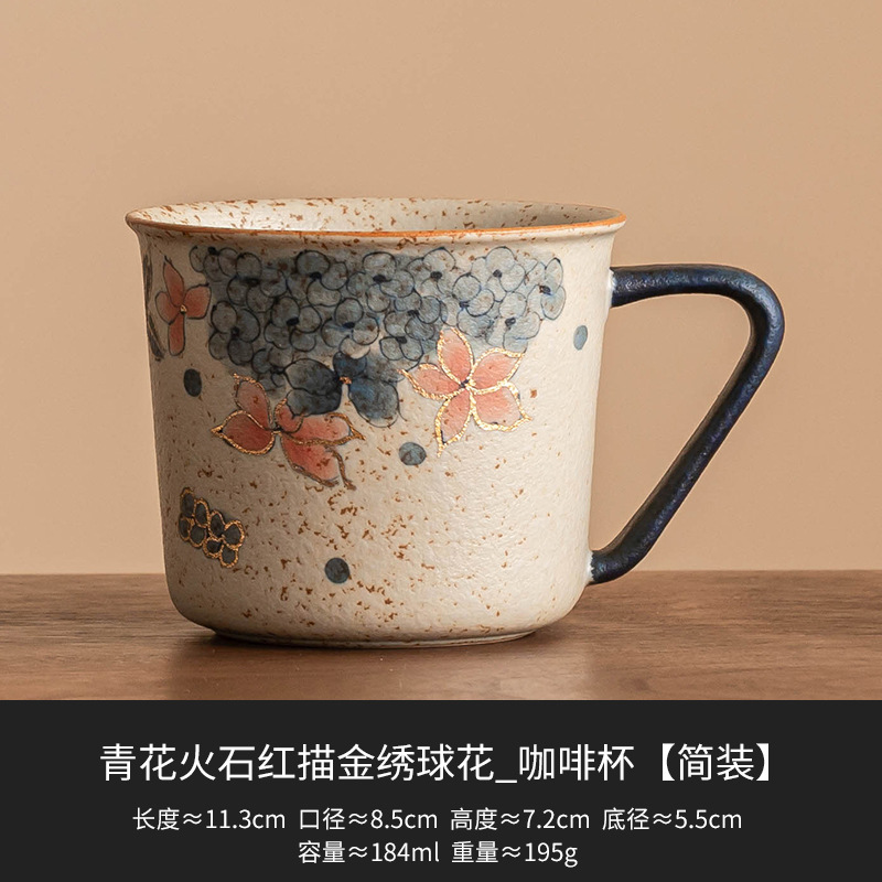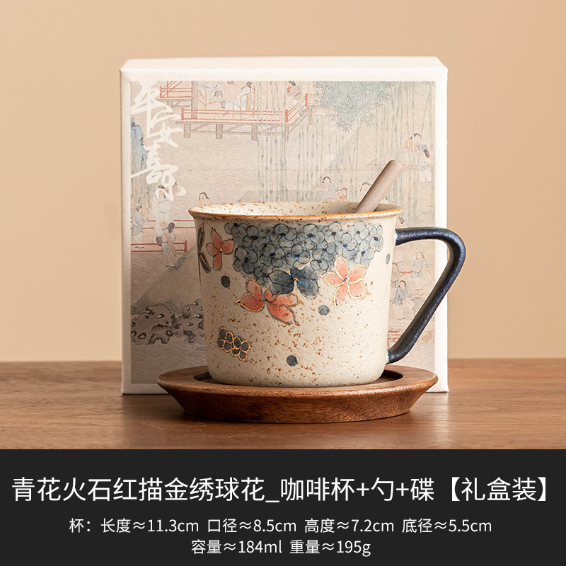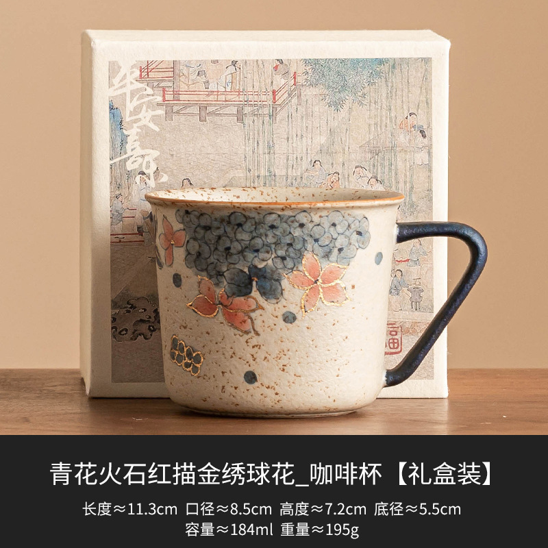 青花火石红咖啡杯描金绣球花拿铁拉花杯子家用高档精致马克杯水杯