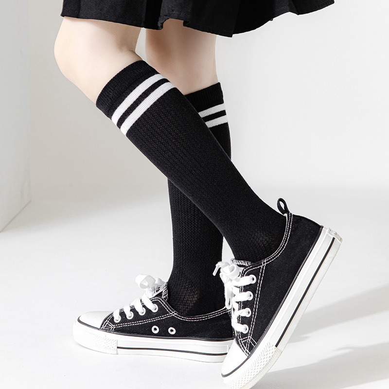 学生袜子儿童网眼棉透气春夏薄款黑白色二杠表演长筒小腿袜学院风