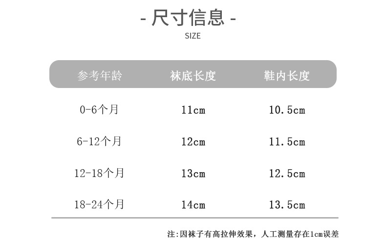 | 鞋底长11cm(适合0-6个月) | USD $2.09 | 100 pair available |