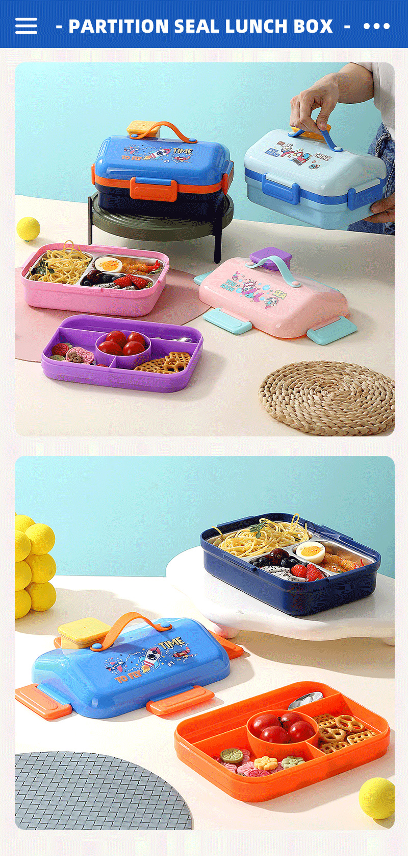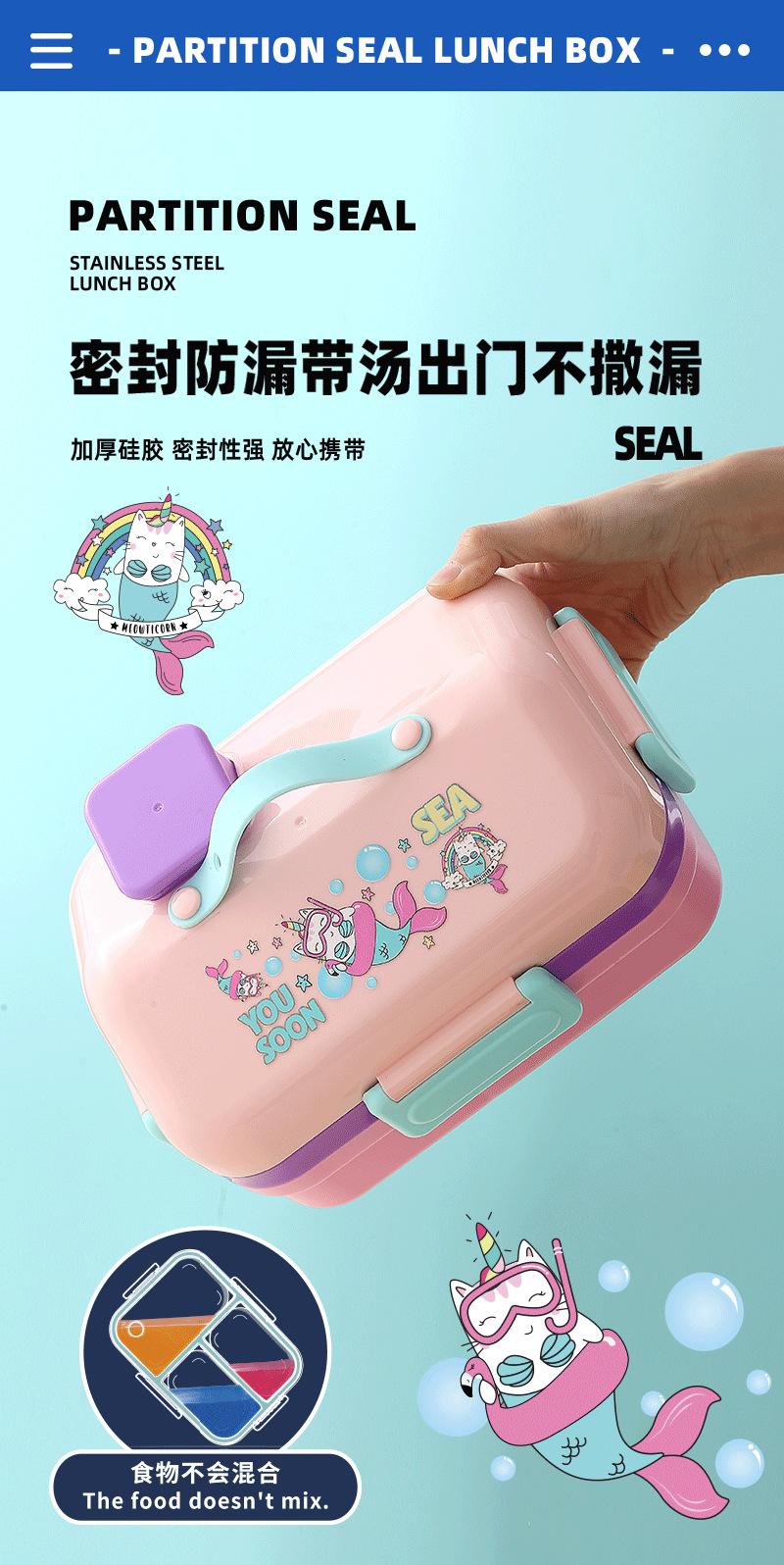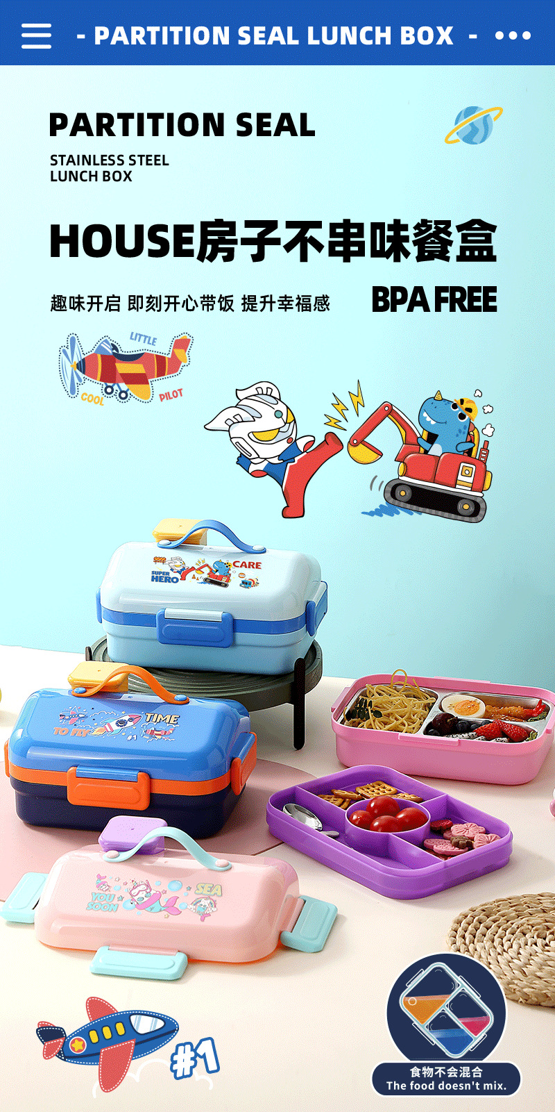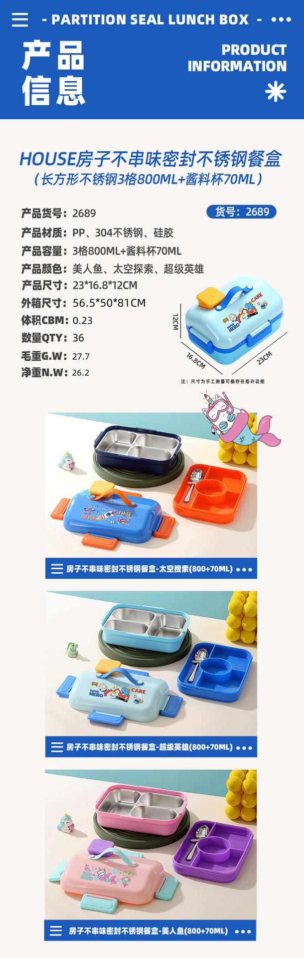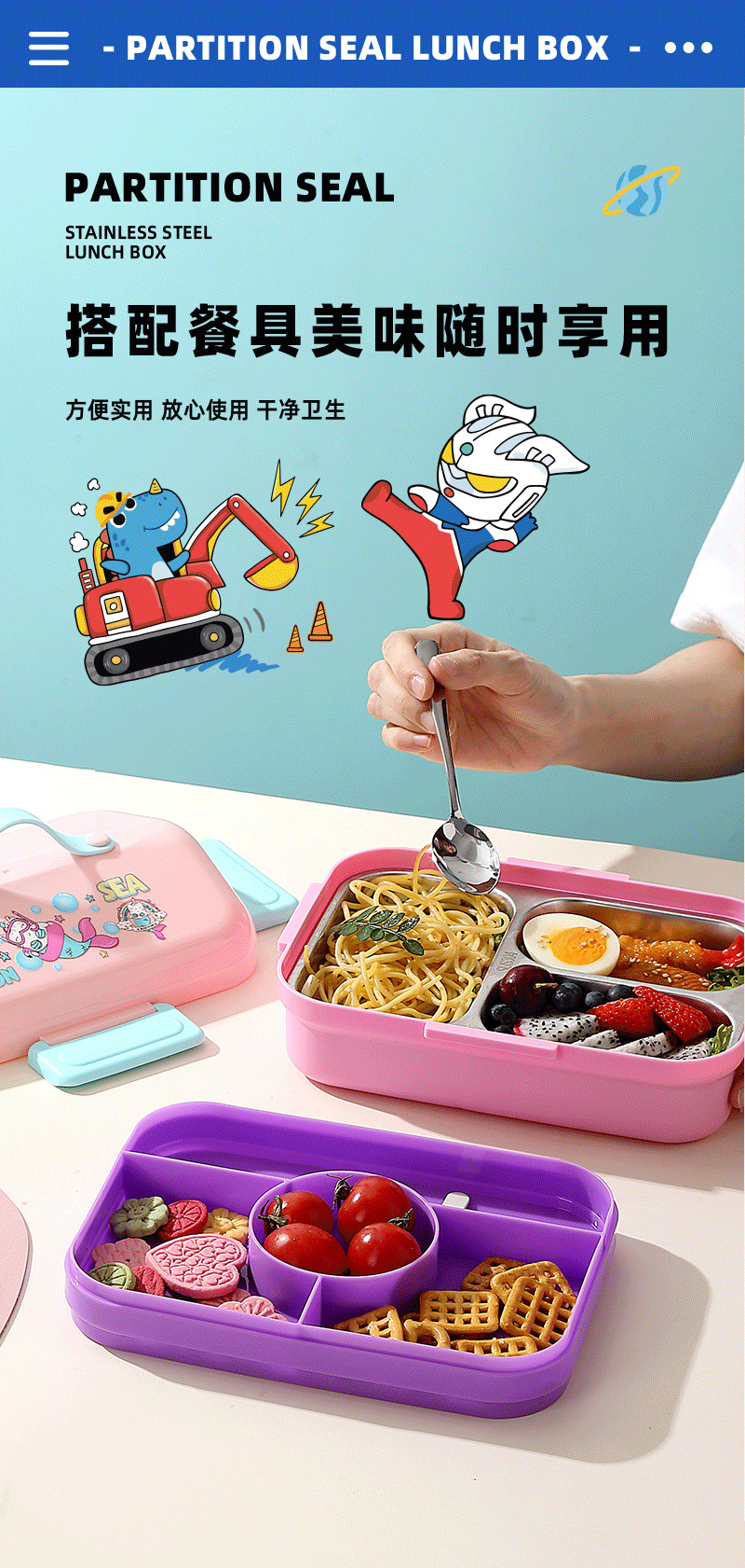 跨境卡通长方形不锈钢饭盒大容量双层密封野餐便当盒太空人午餐盒