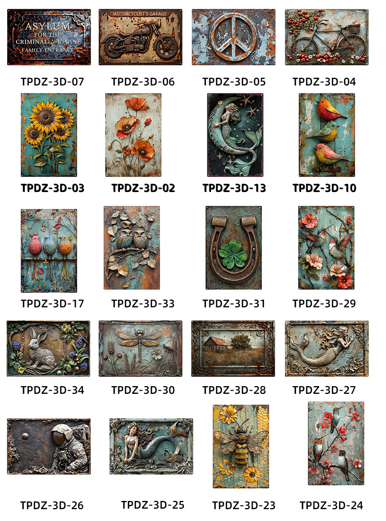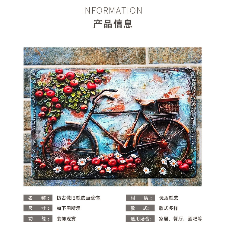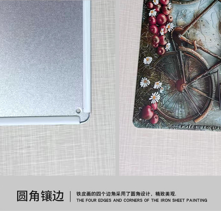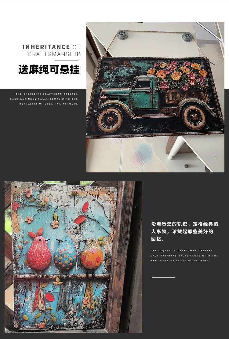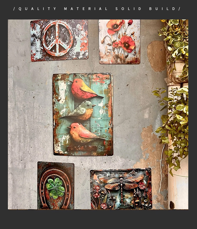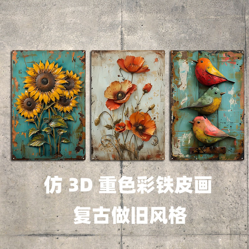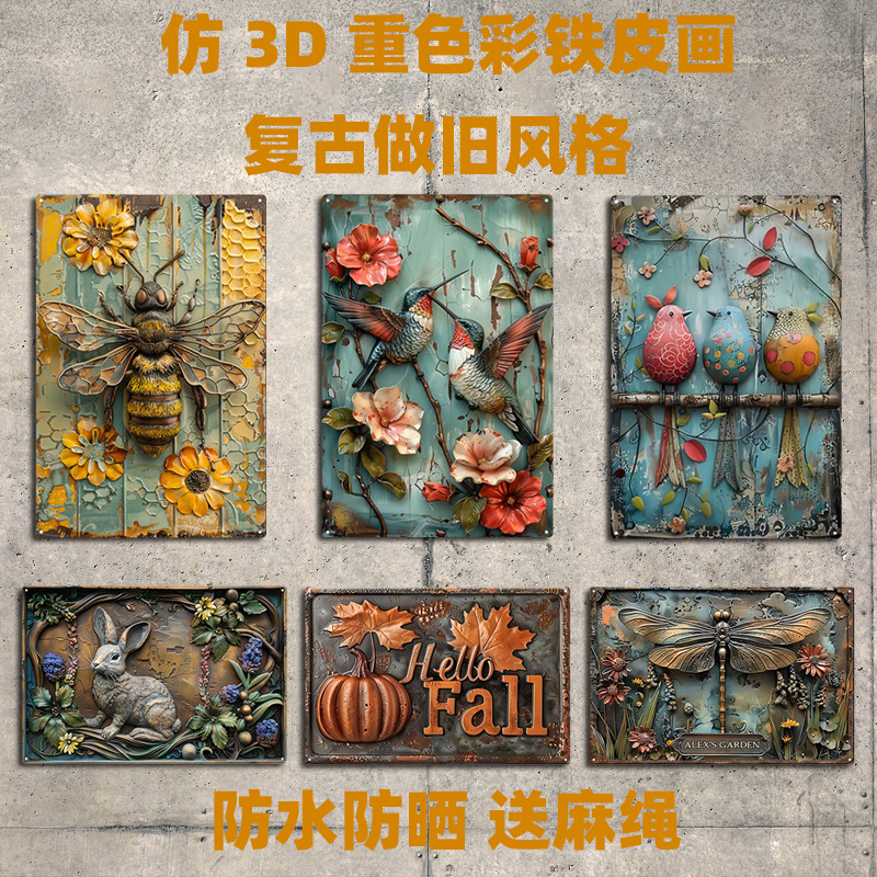 跨境仿3D露营墙面装饰水彩鸟复古铁皮画防水防晒铁艺挂画壁挂标牌