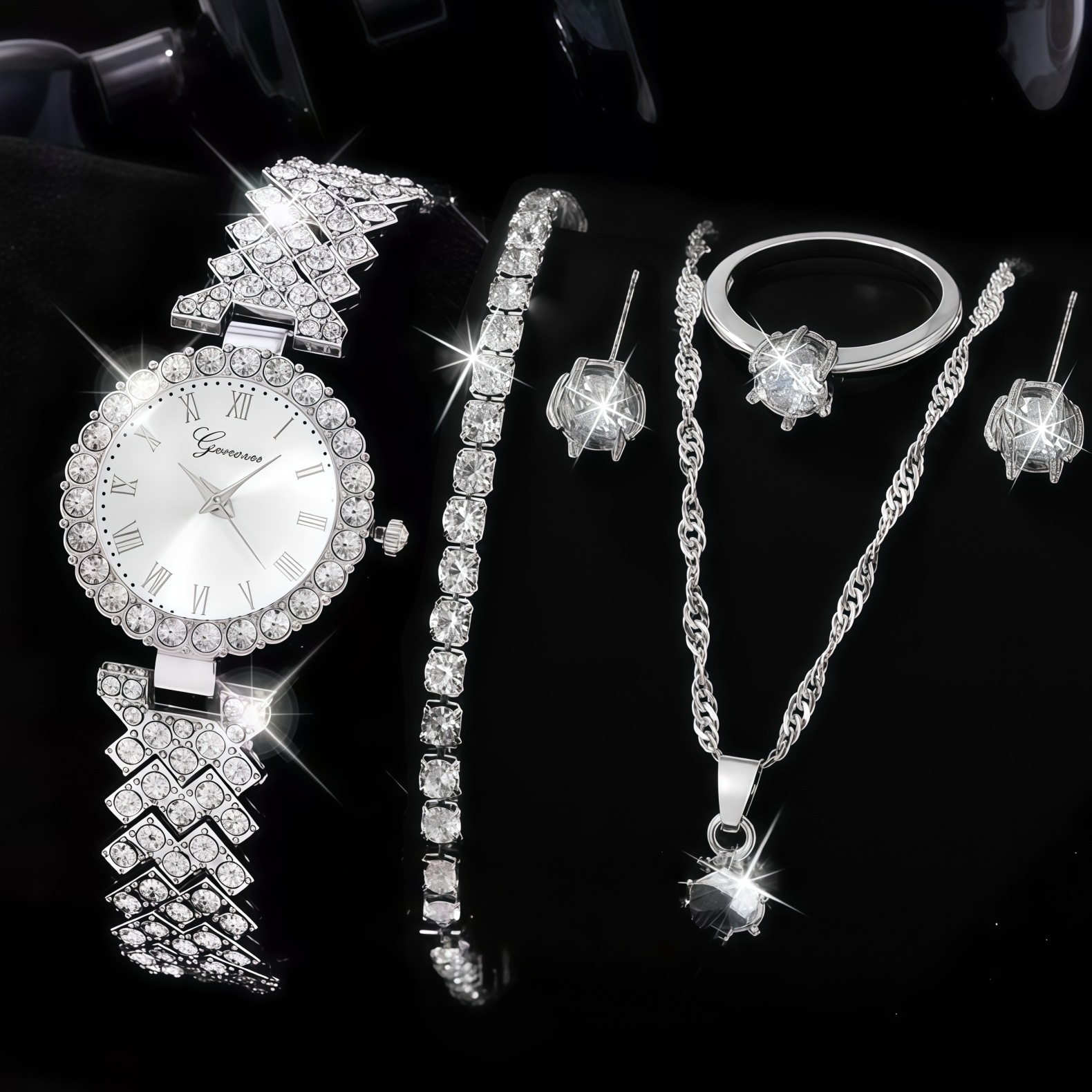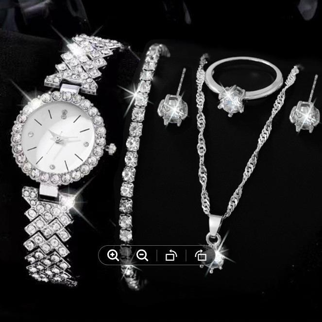 跨界时尚5pcs手表套装女 TEMU爆款镶钻百搭八爪钻戒首饰女士套装