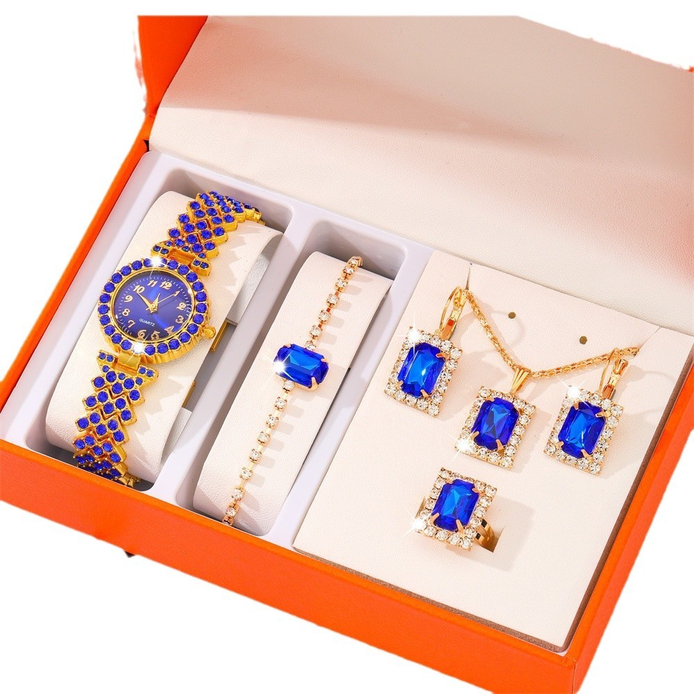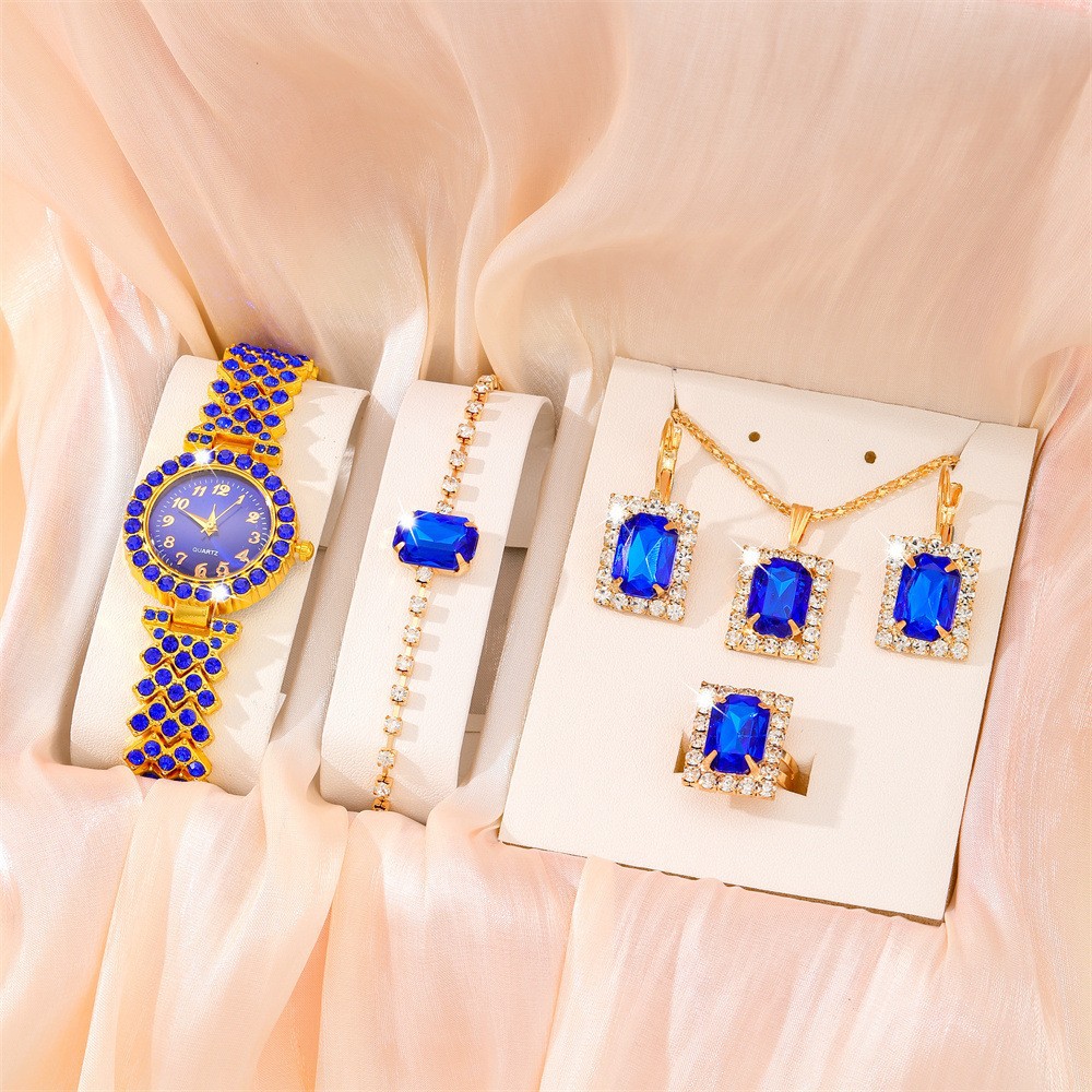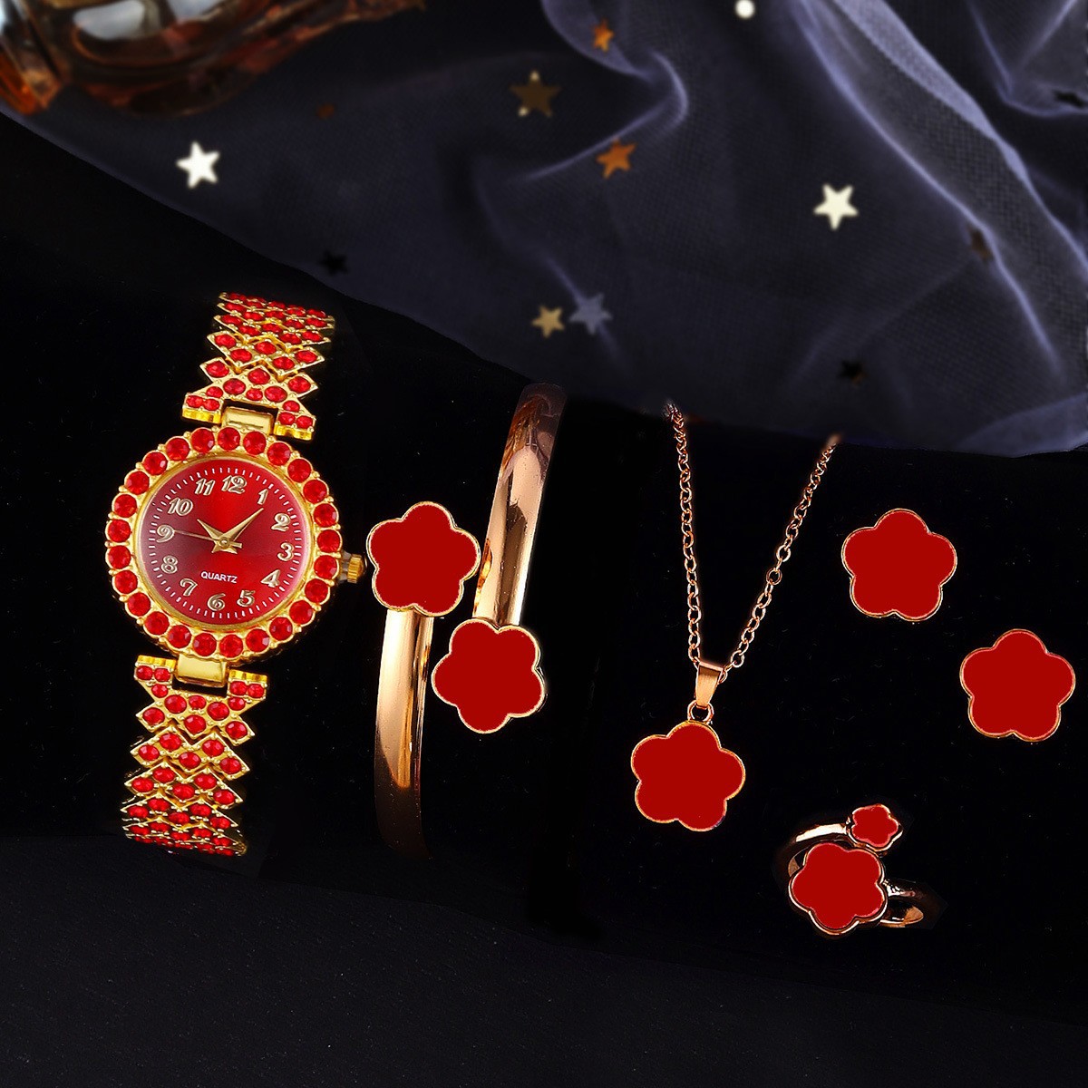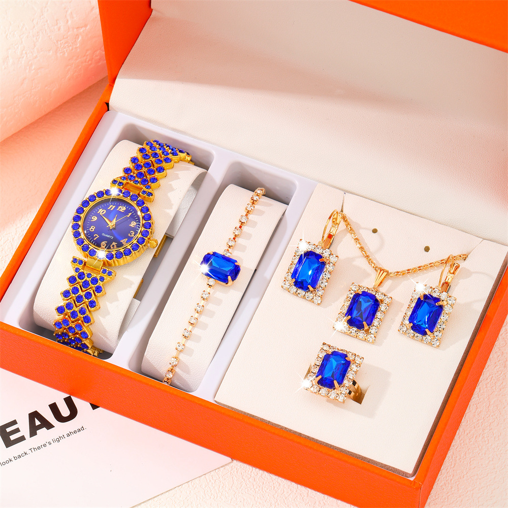 新款女士数字彩钻石英表女 跨境爆款5PCS首饰套装时尚腕表女批发