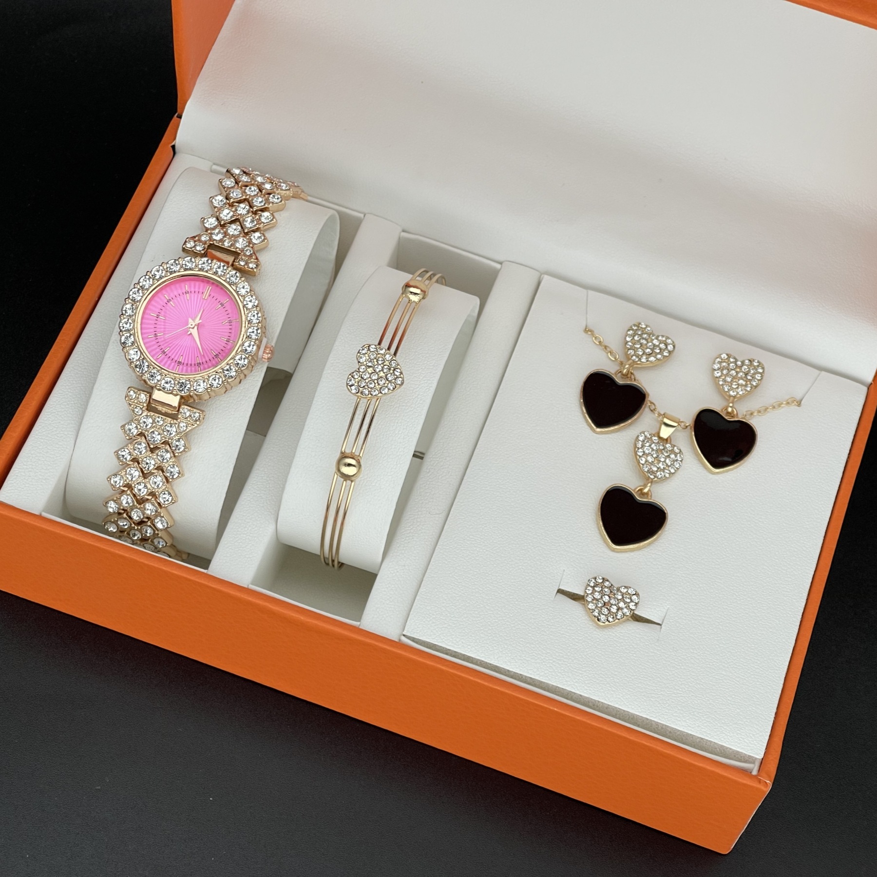 跨境时尚6pcs/set女士手表 满钻无刻度手链石英腕表+爱心饰品套装