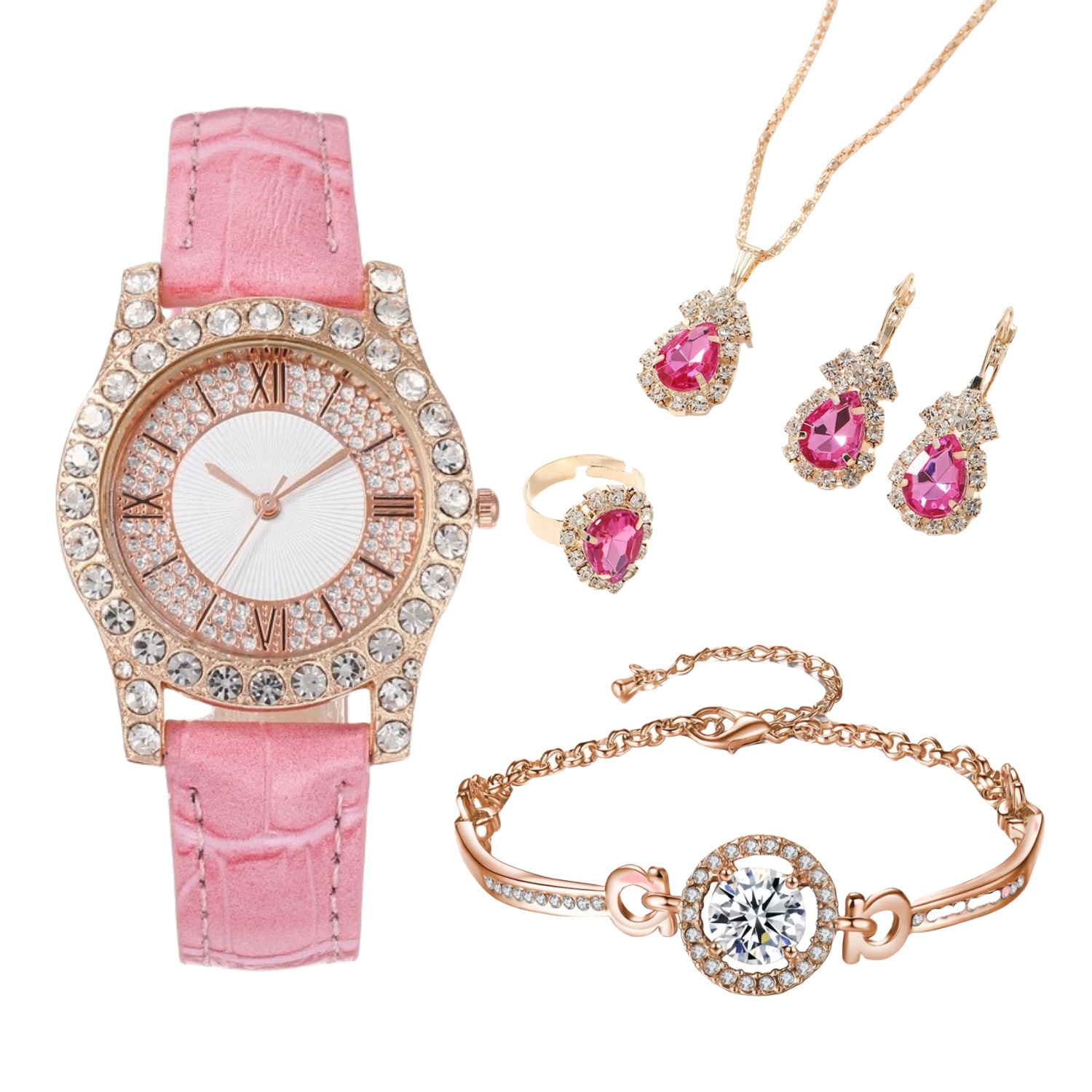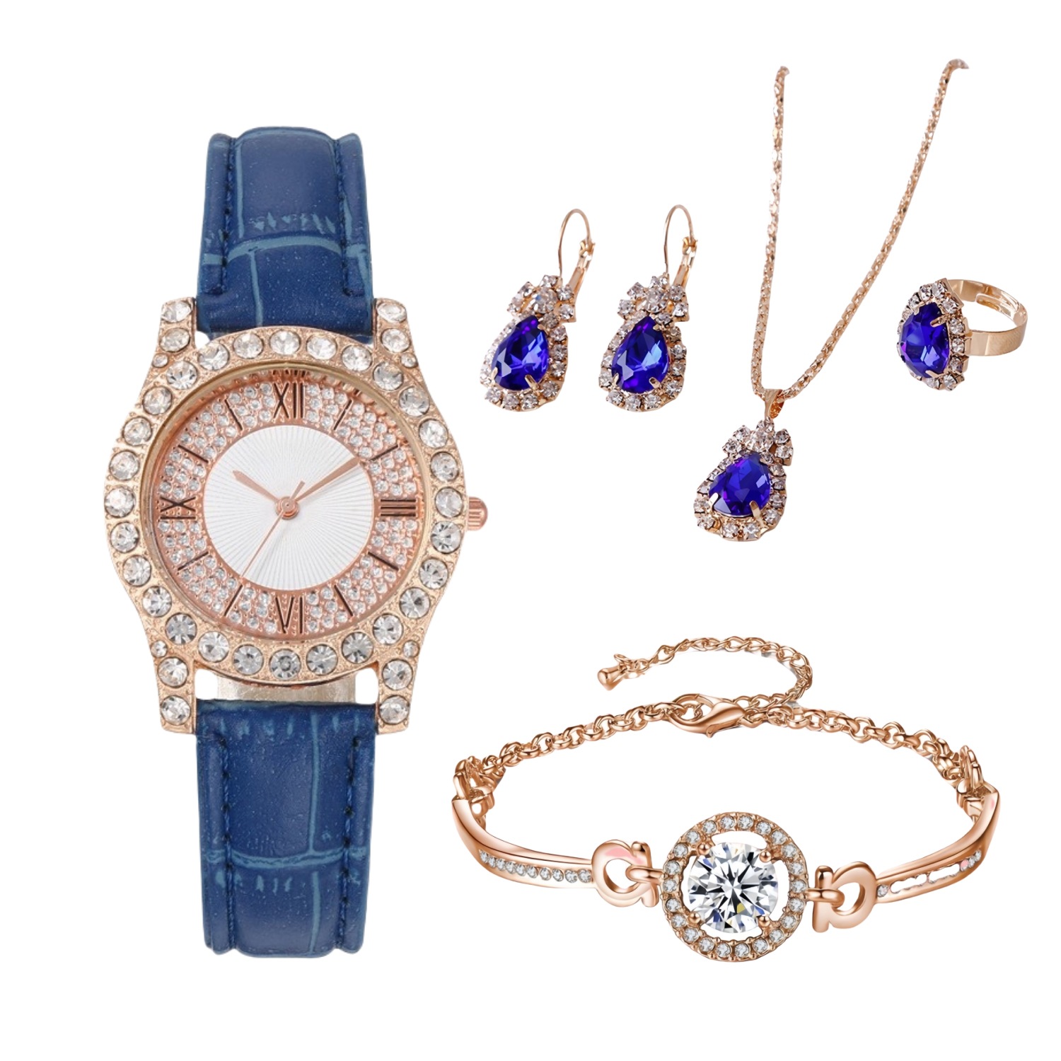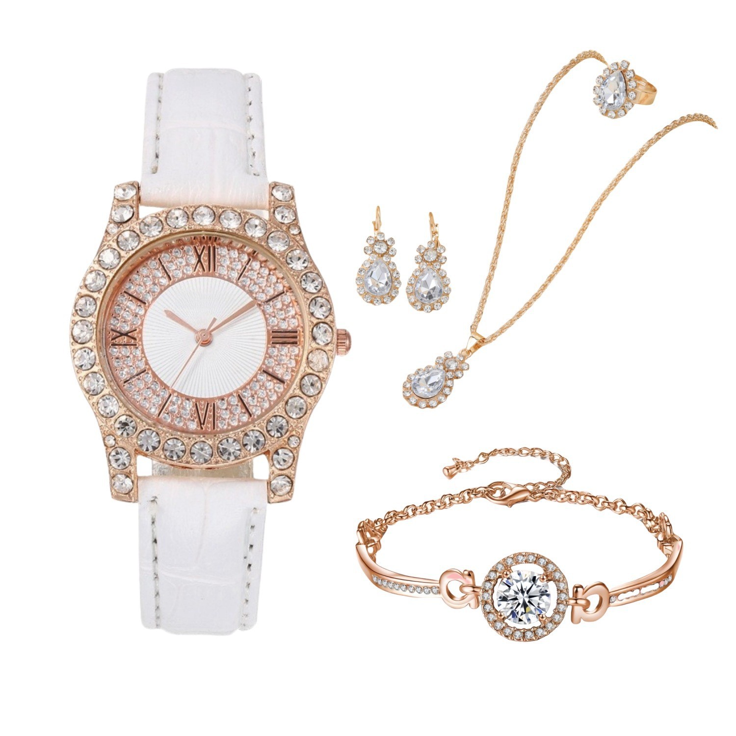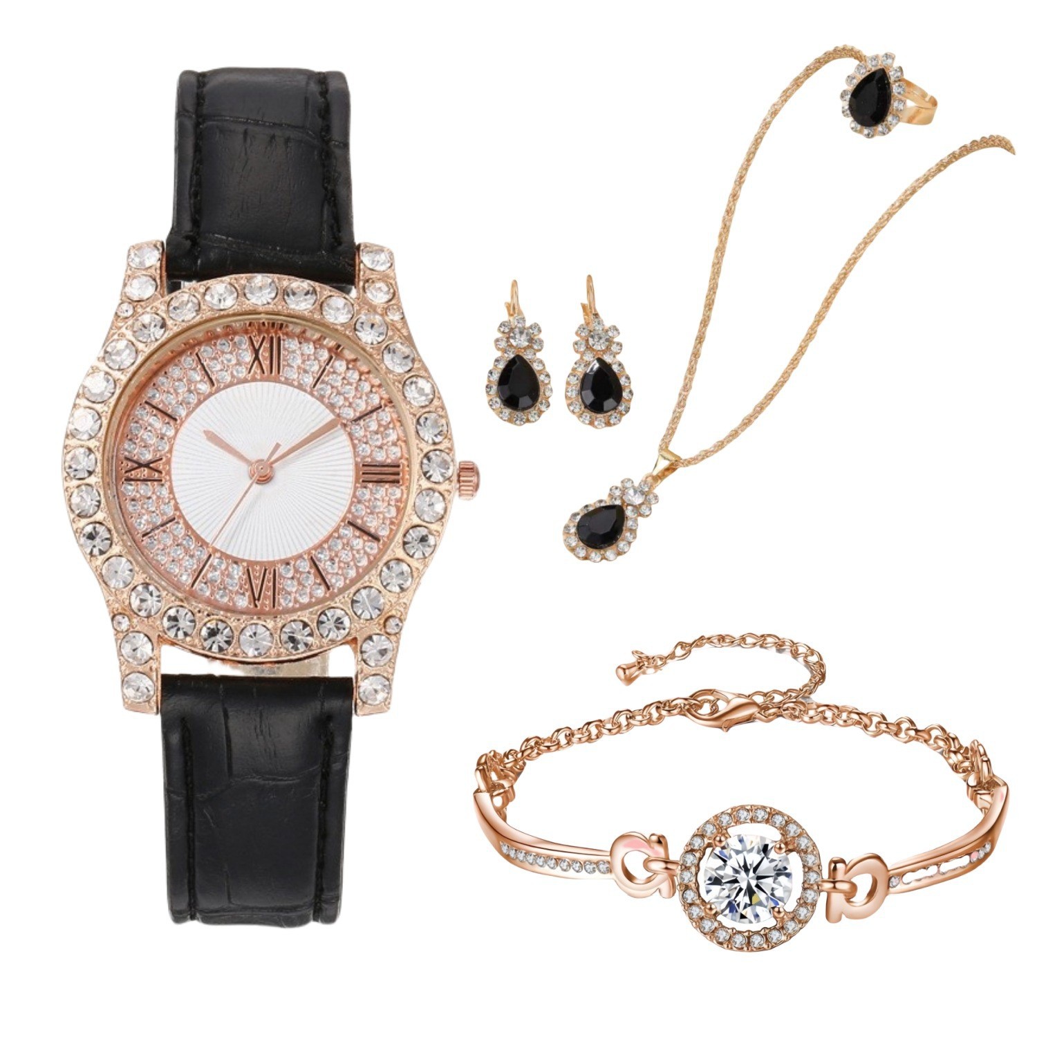 新款PU镶钻女士简约手表 皮革表带罗马面时尚休闲石英腕表套装