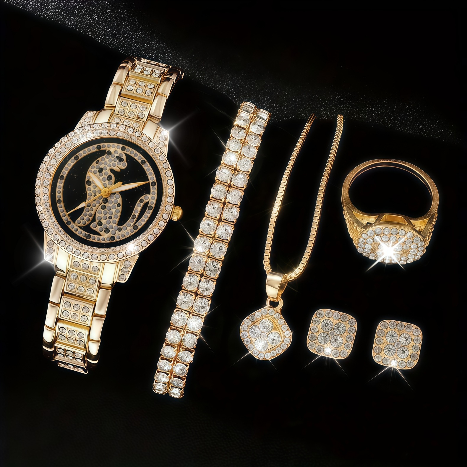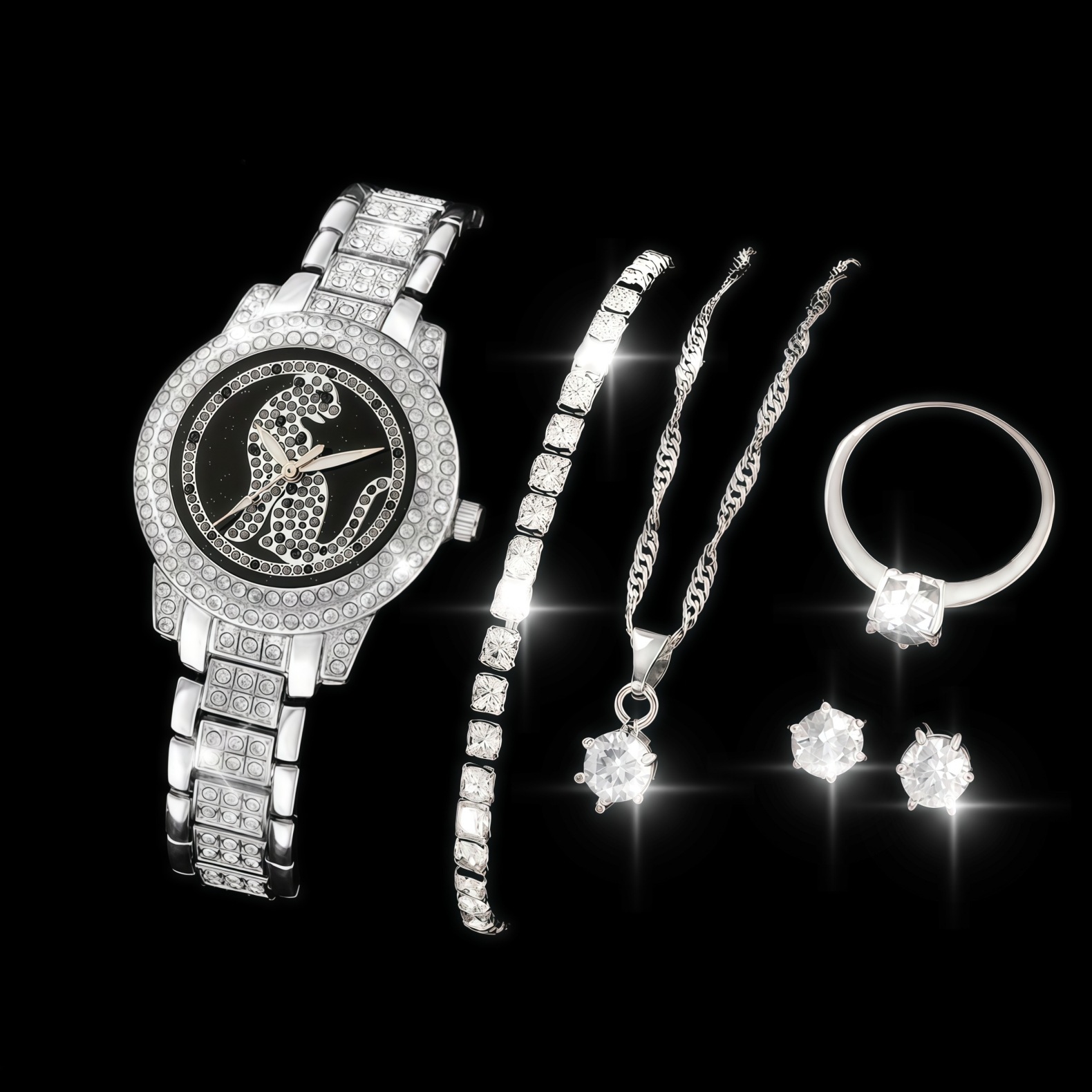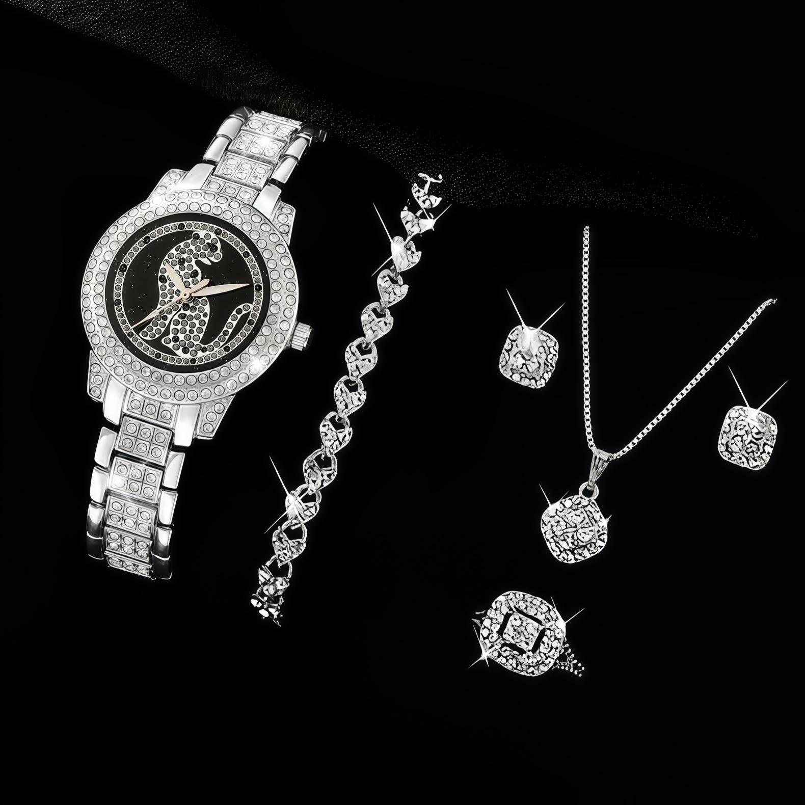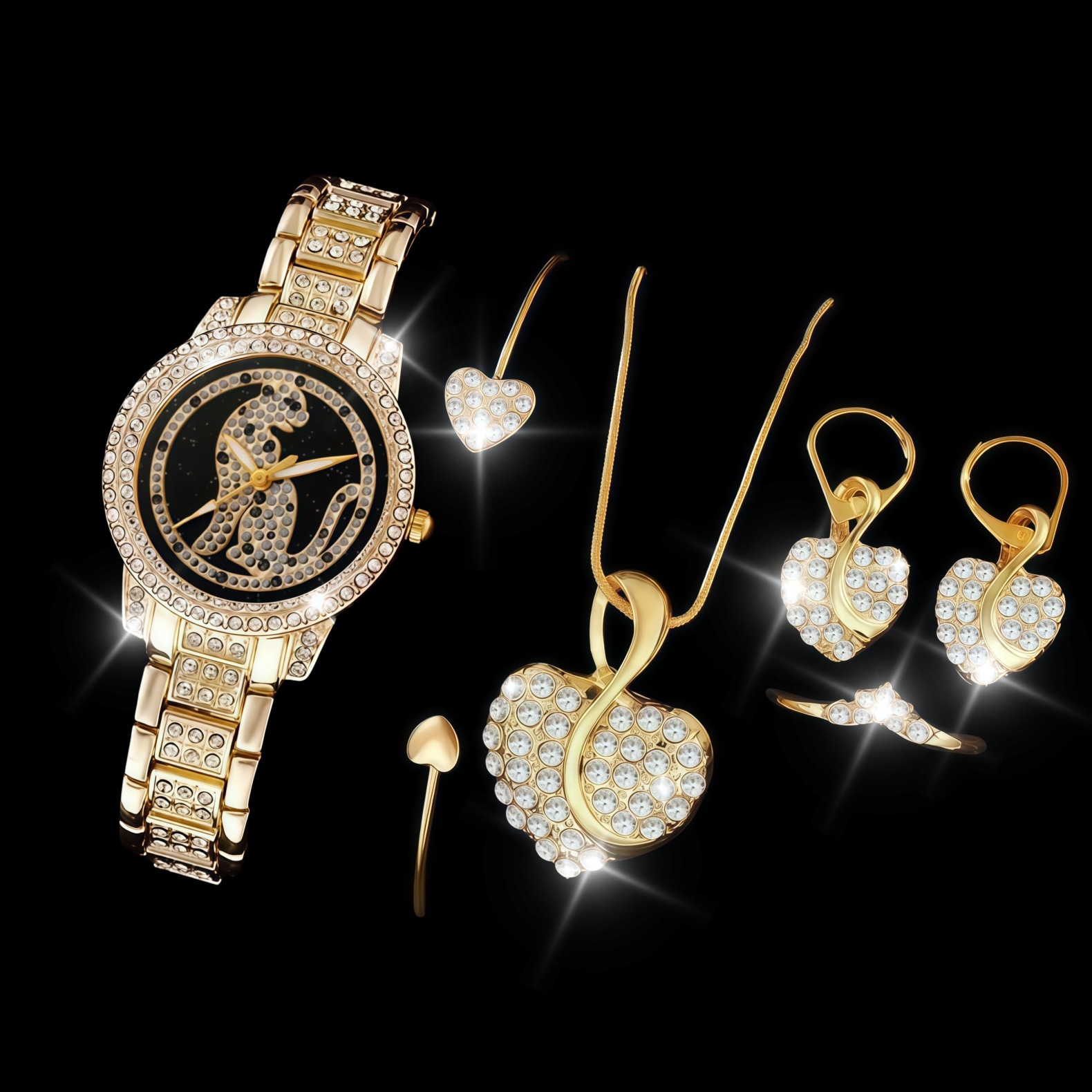 爆款原创豹子手表套装女 聚宝盆镶钻手链戒指耳钉项链套装石英表