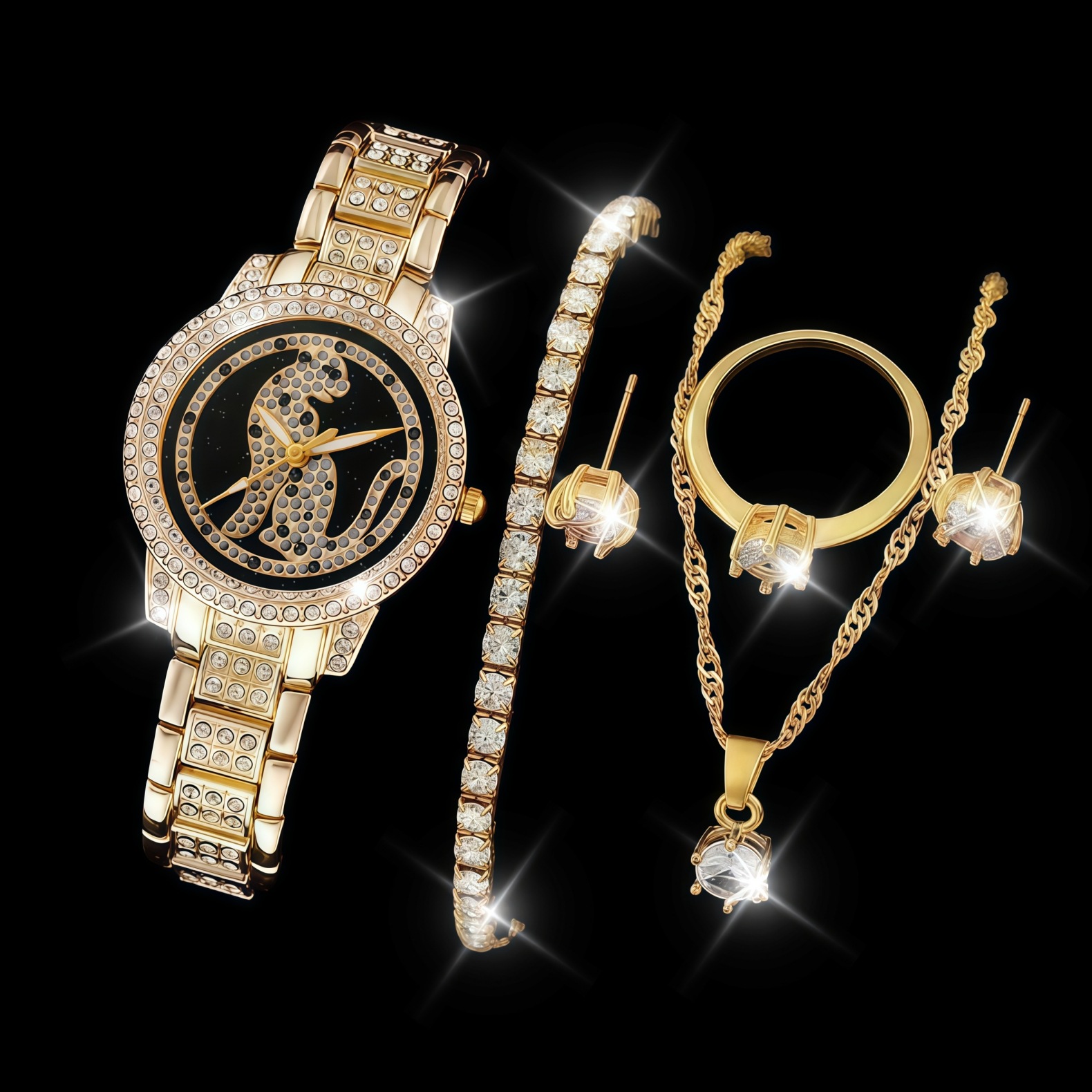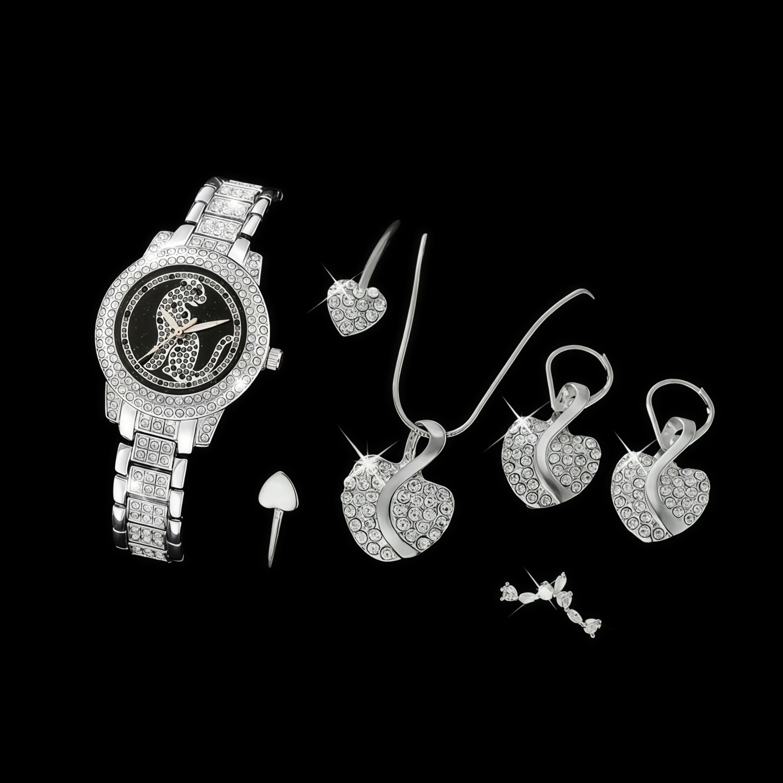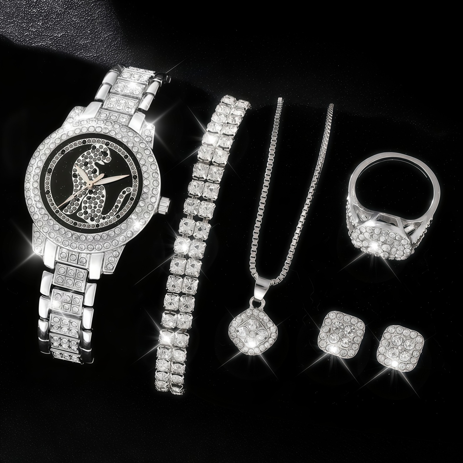 爆款原创豹子手表套装女 聚宝盆镶钻手链戒指耳钉项链套装石英表