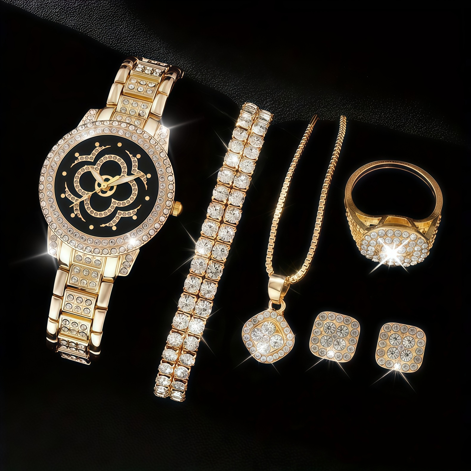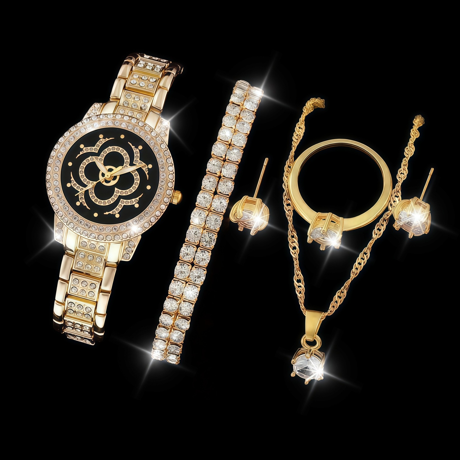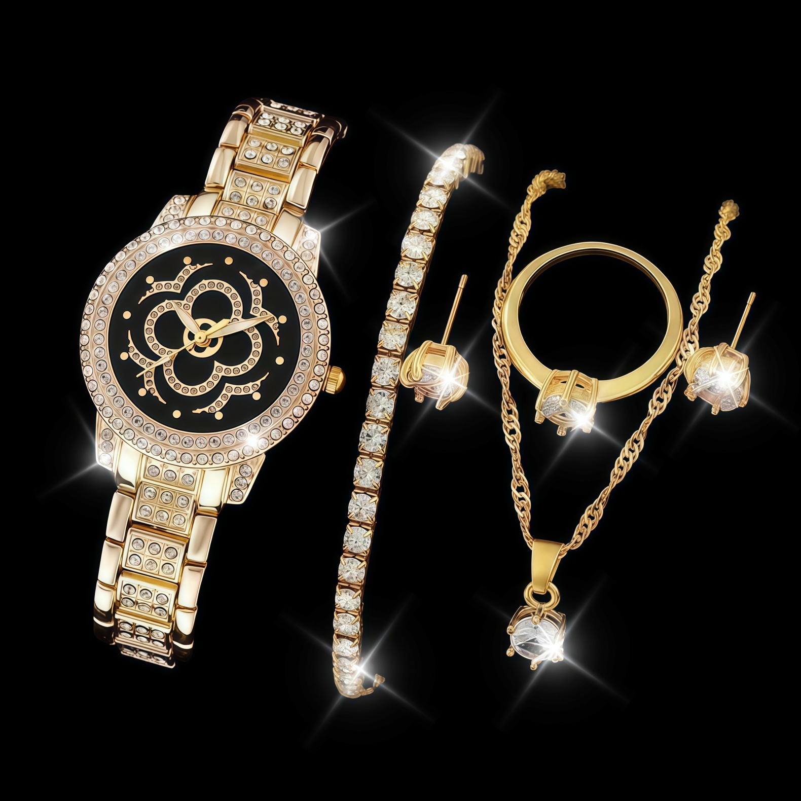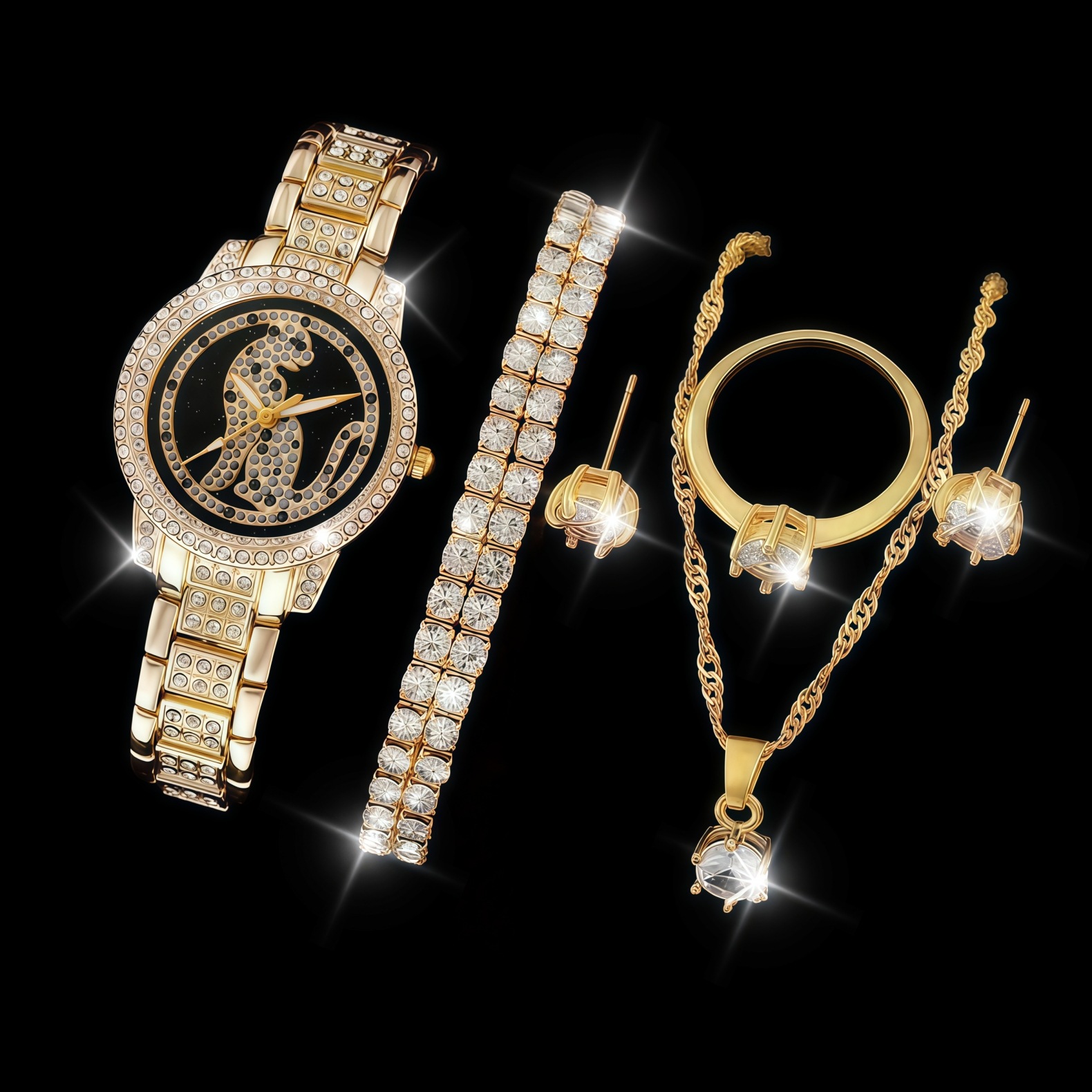 爆款原创豹子手表套装女 聚宝盆镶钻手链戒指耳钉项链套装石英表