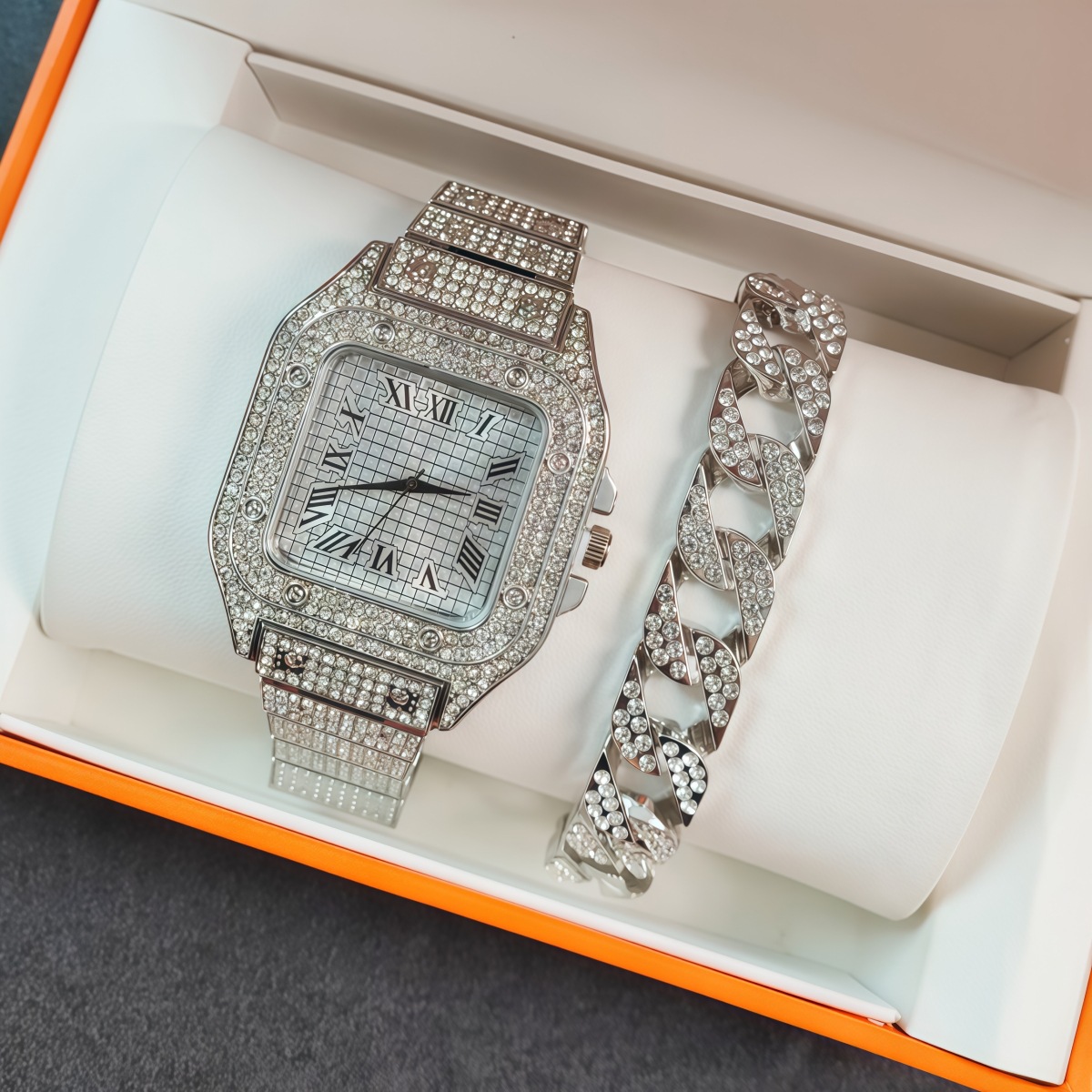 男士嘻哈潮风时尚大表盘 外贸爆款镶钻古巴链手表套装YYMY批发表