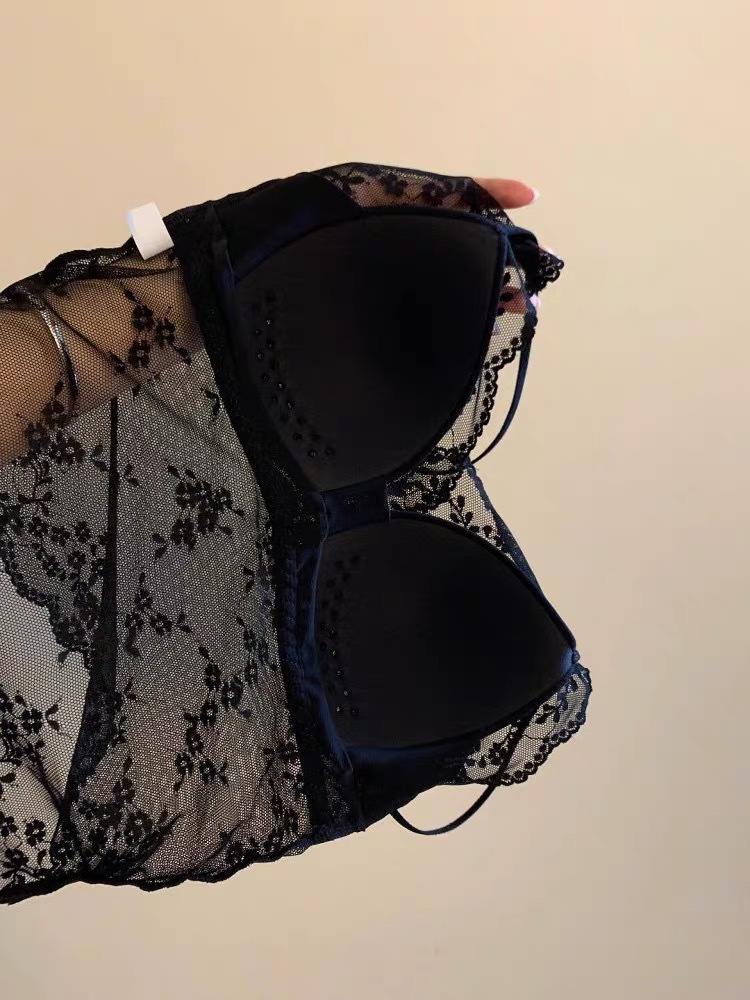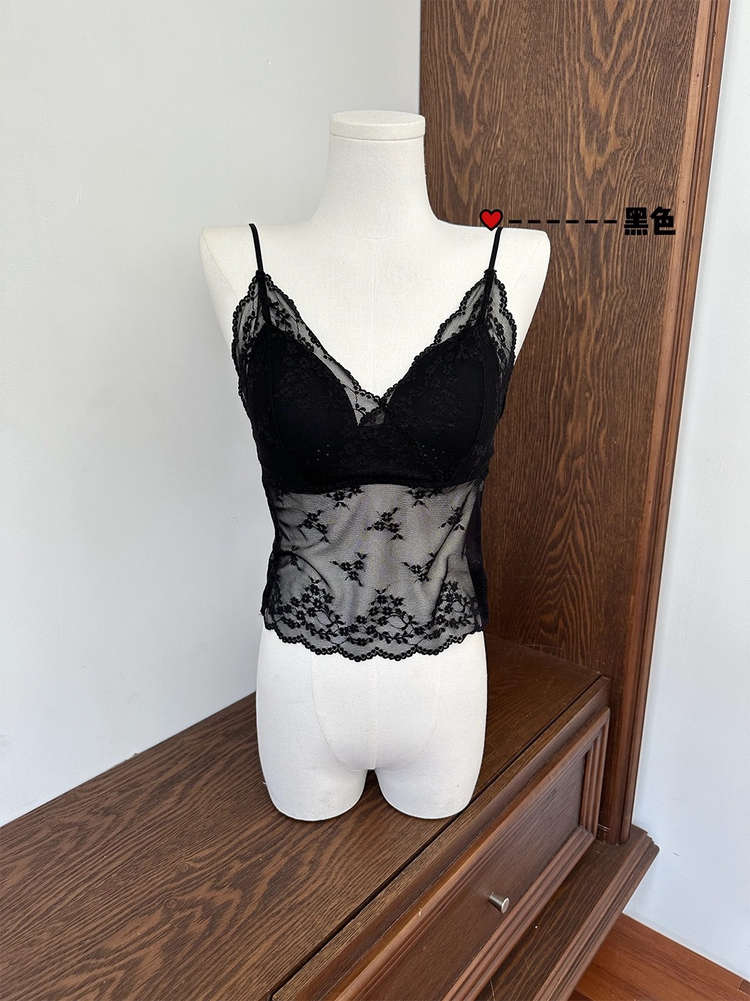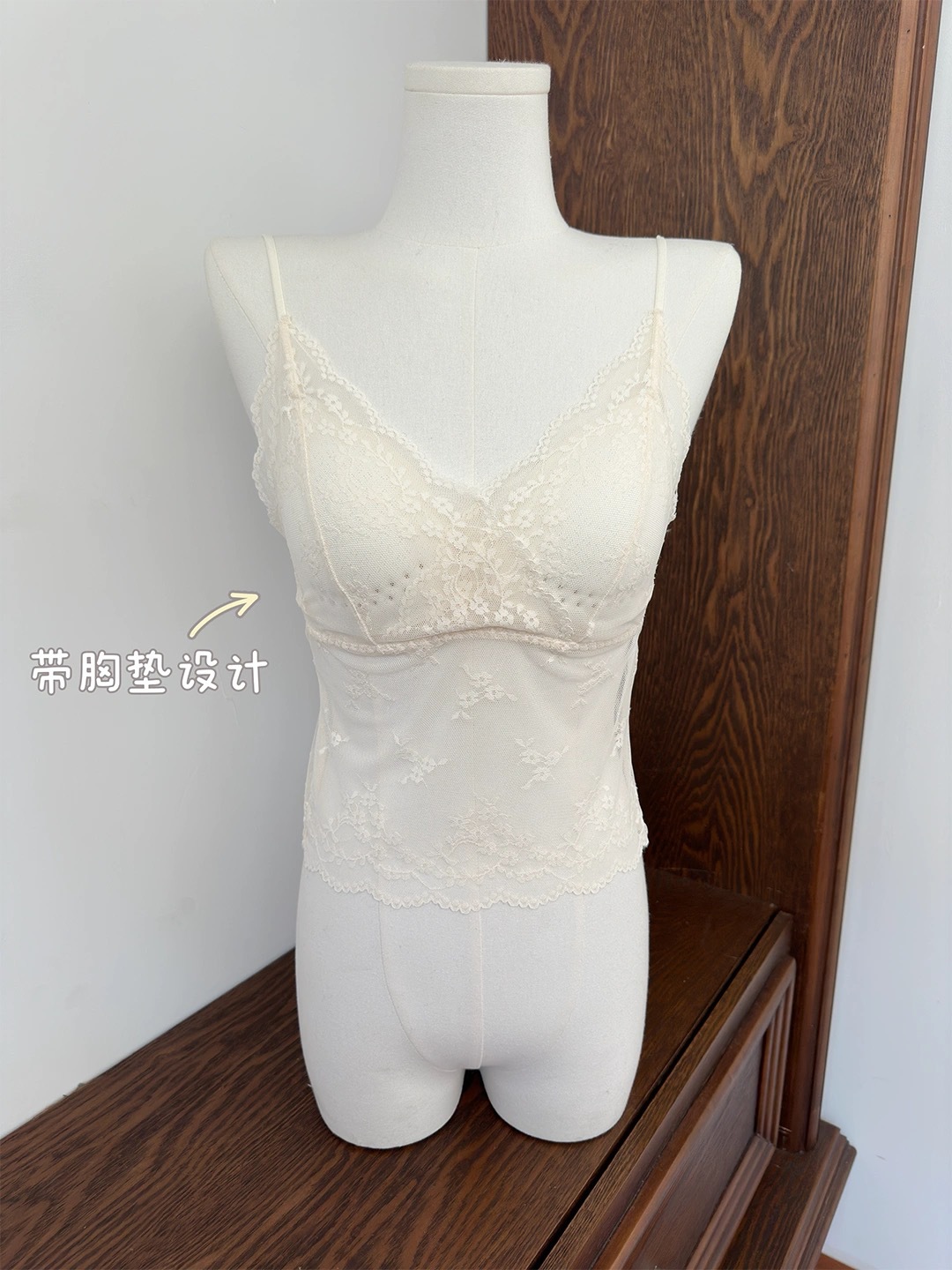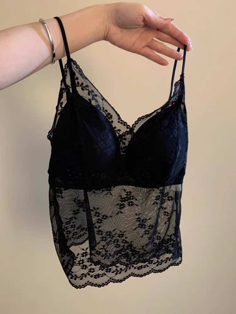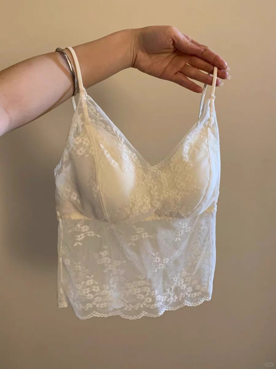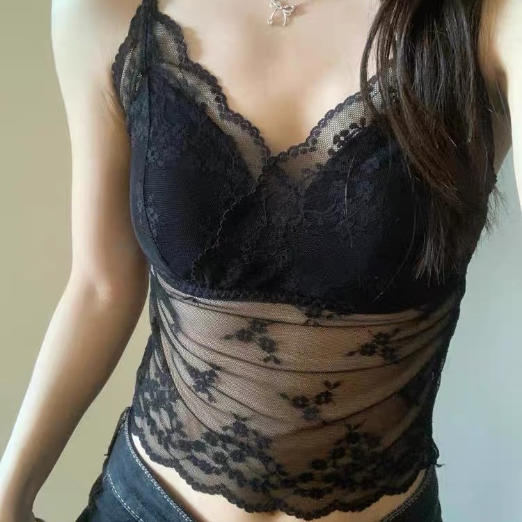 夏季蕾丝V领网纱镂空带胸垫吊带女修身ins氛围感打底上衣纯欲背心