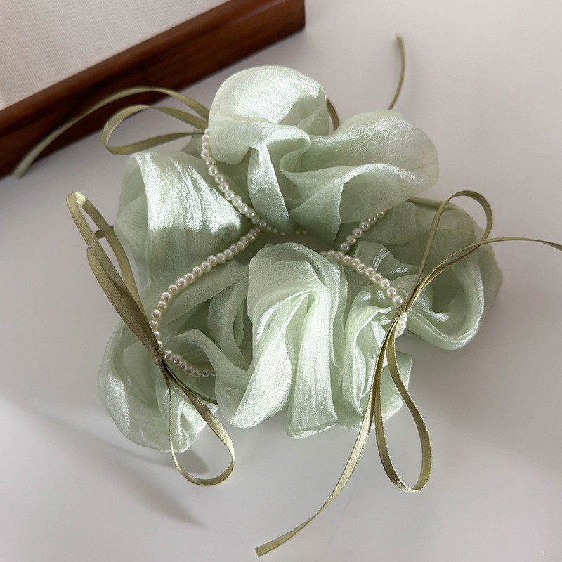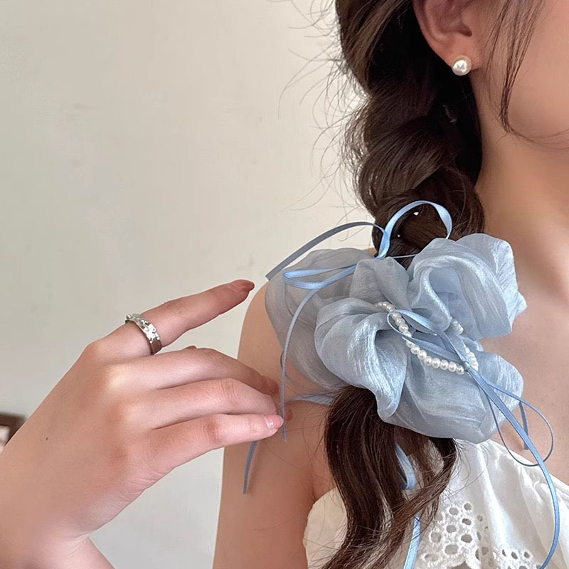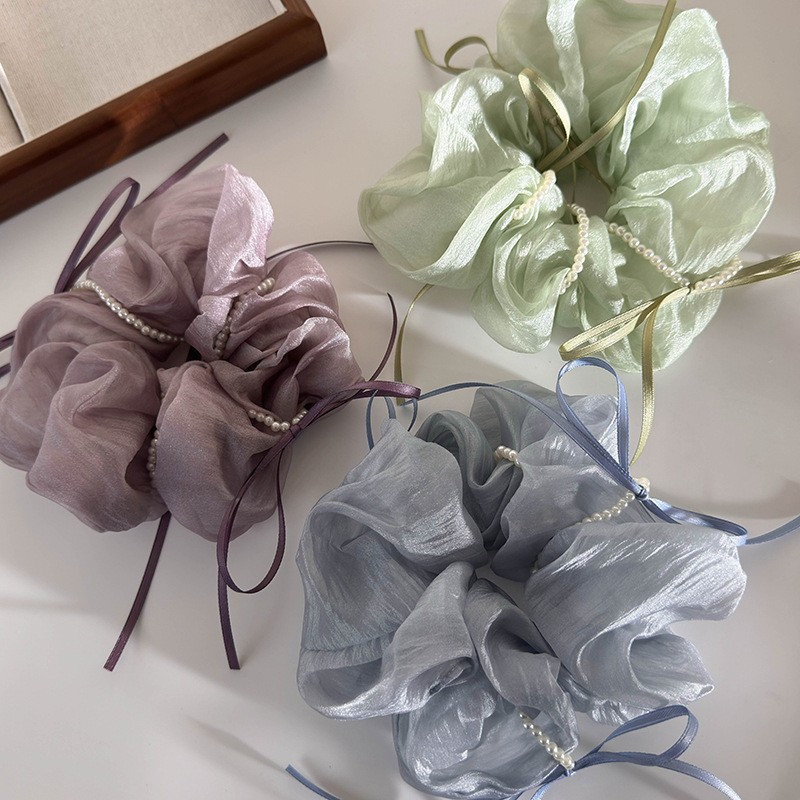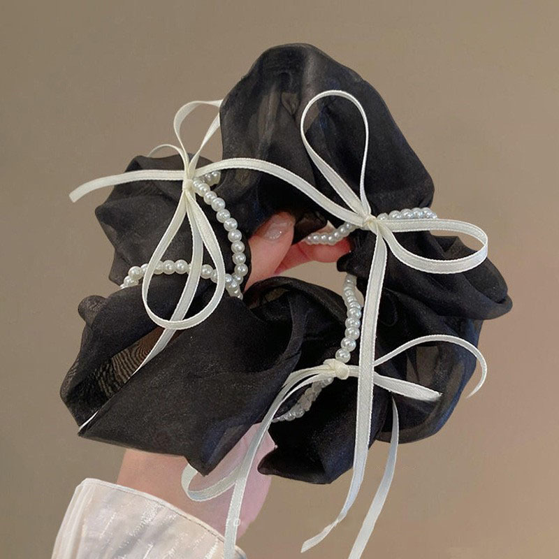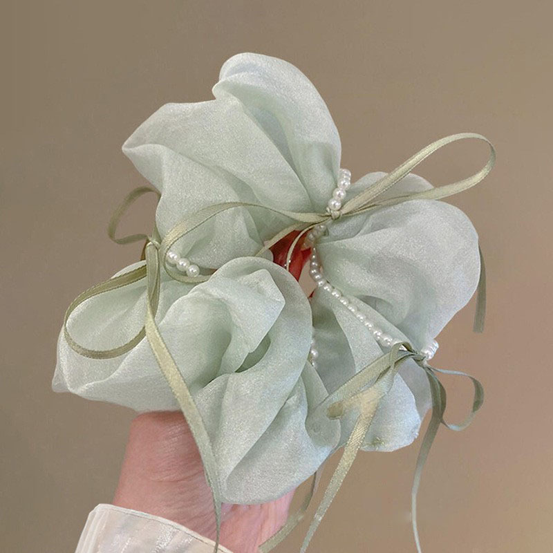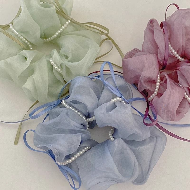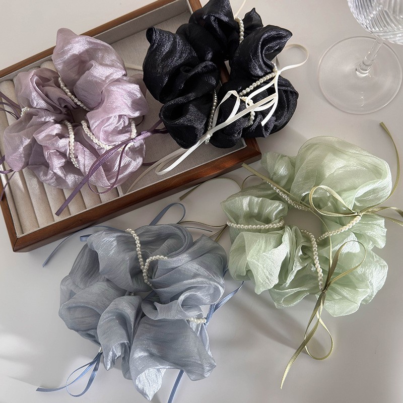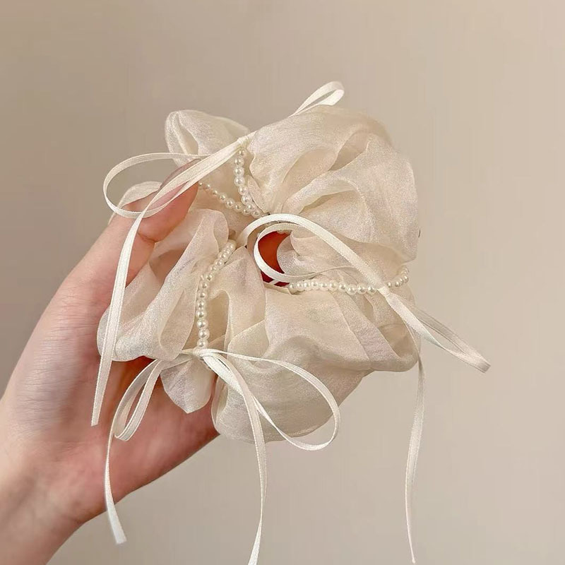 韩版ins夏新款珍珠飘带蝴蝶结纱质缎面大肠发圈温柔仙气发绳发饰