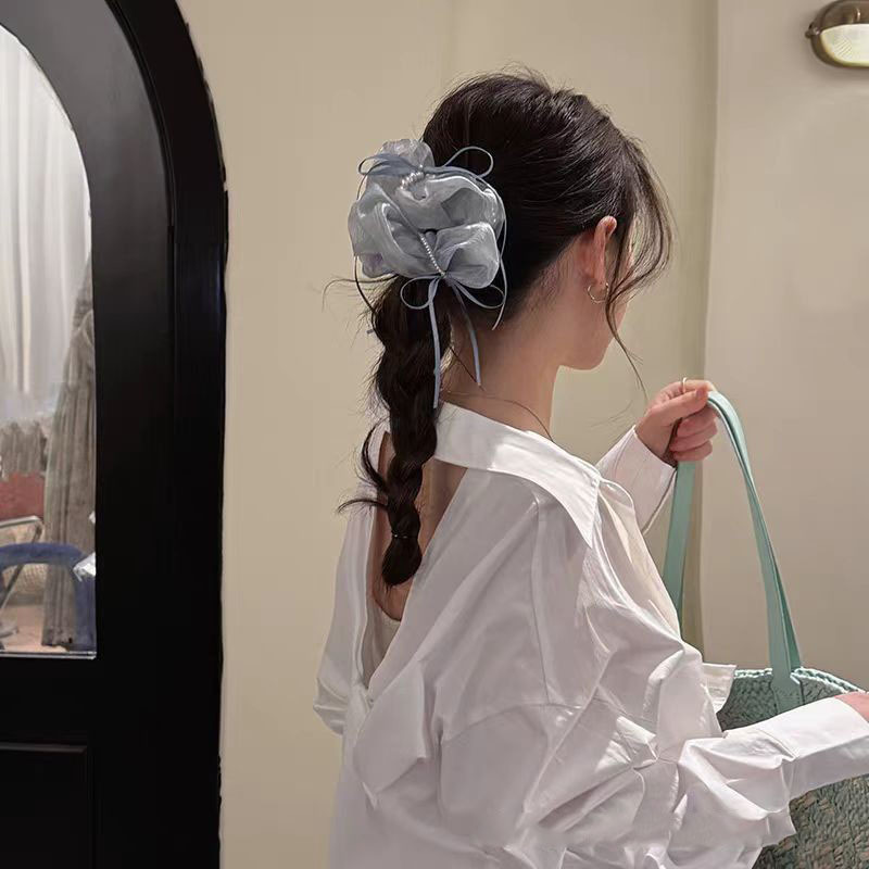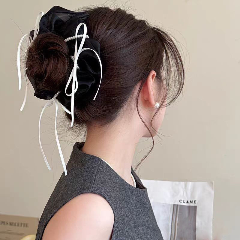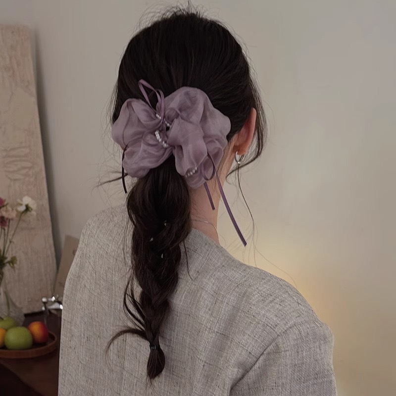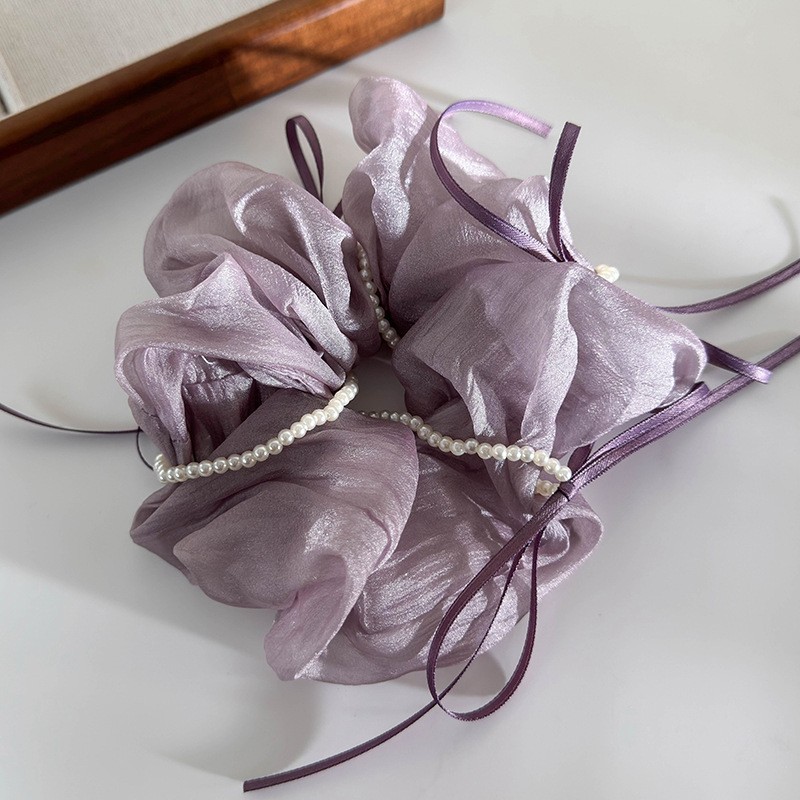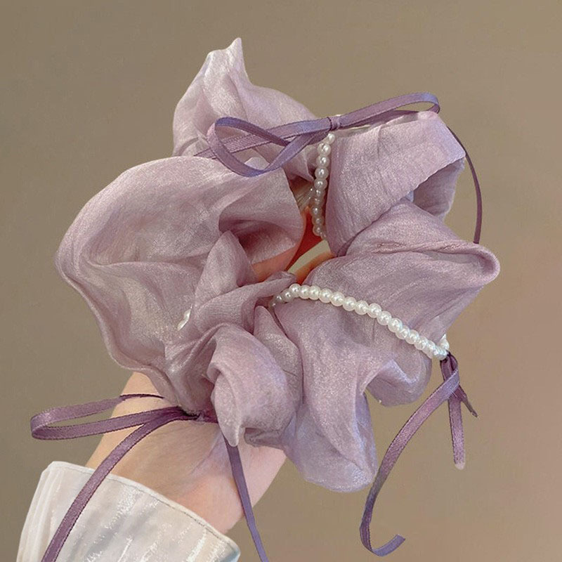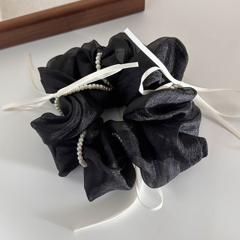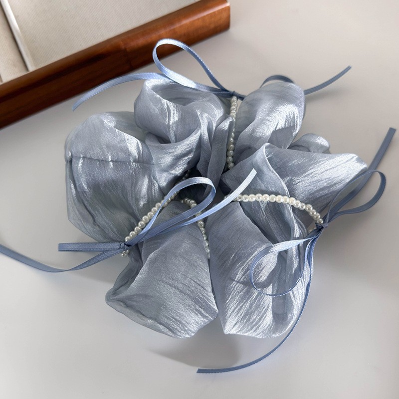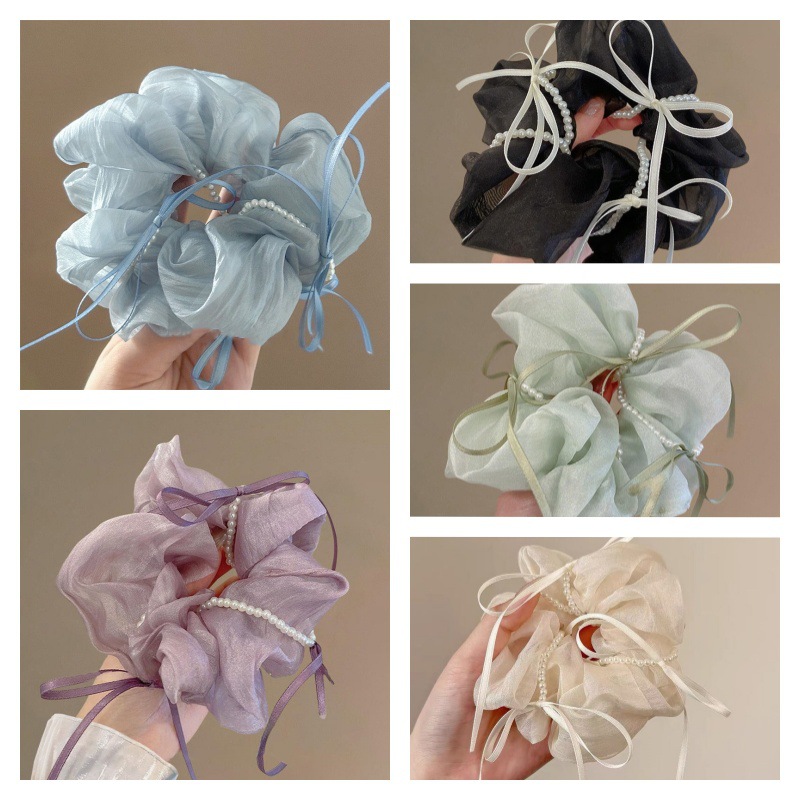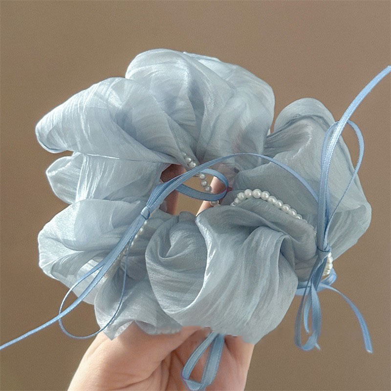 韩版ins夏新款珍珠飘带蝴蝶结纱质缎面大肠发圈温柔仙气发绳发饰