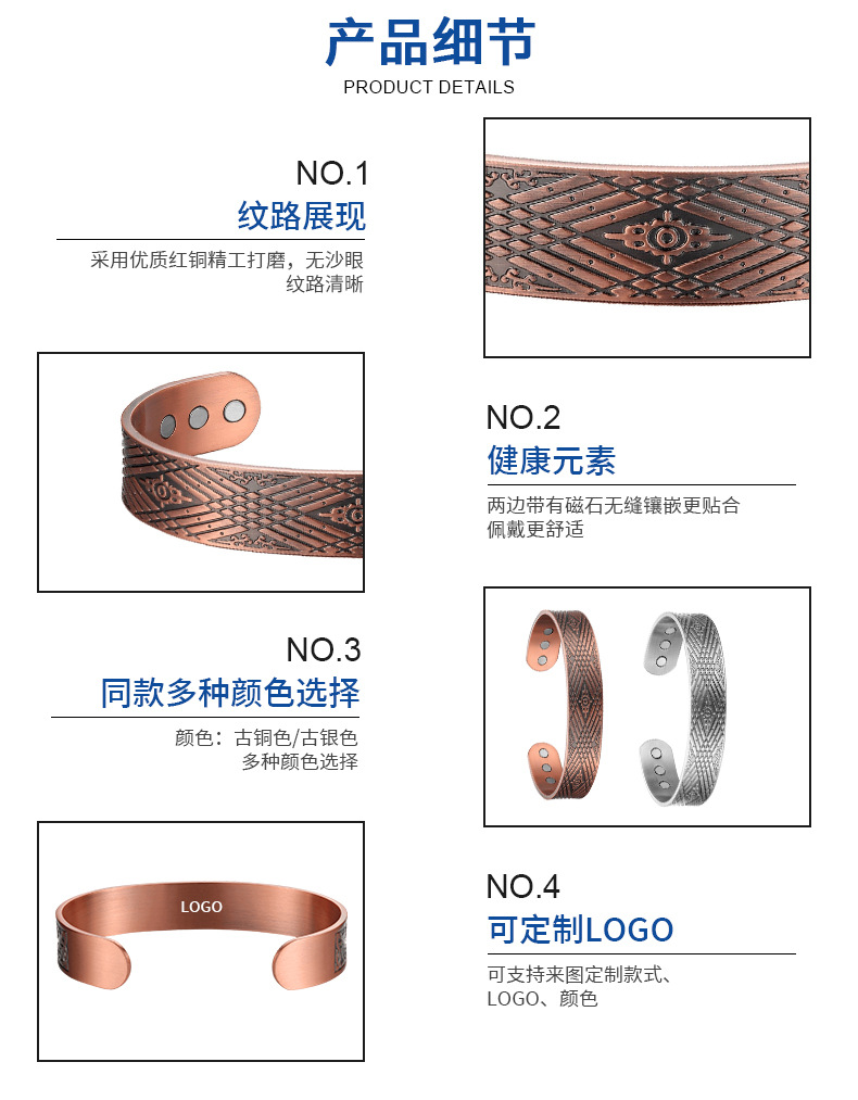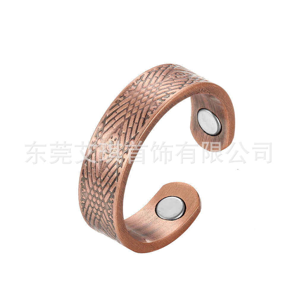 现货批发磁性红铜手镯简约时尚条纹红铜手镯磁石能量宽红铜手镯