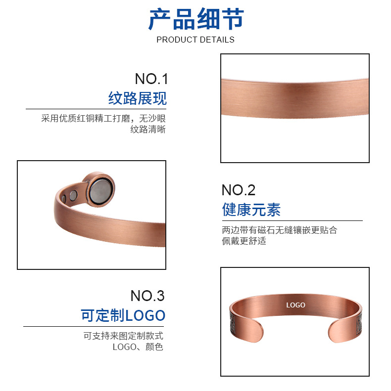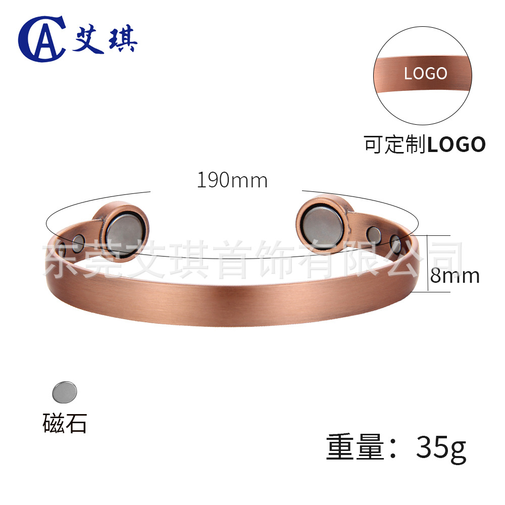 欧美跨境红铜手镯复古时尚磁性能量红铜手镯开口大头磁石红铜手镯