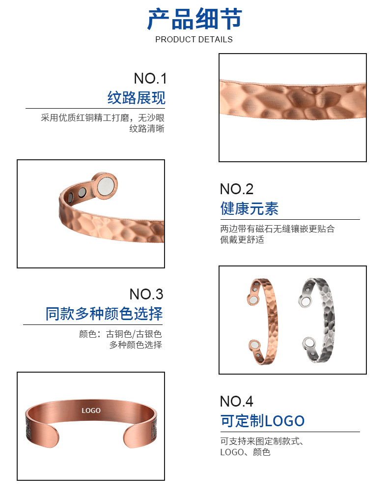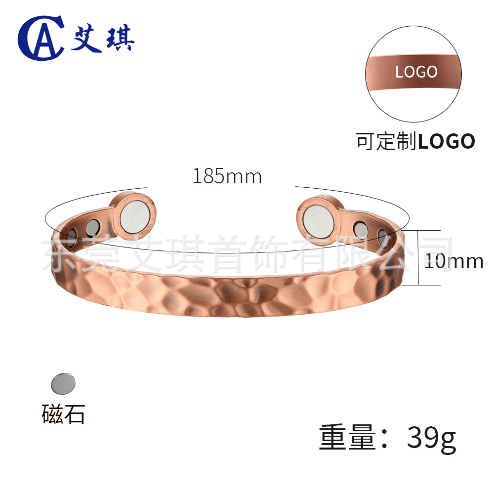 现货批发紫铜手镯欧美复古磁性红铜手镯小众设计锤纹磁石红铜手镯