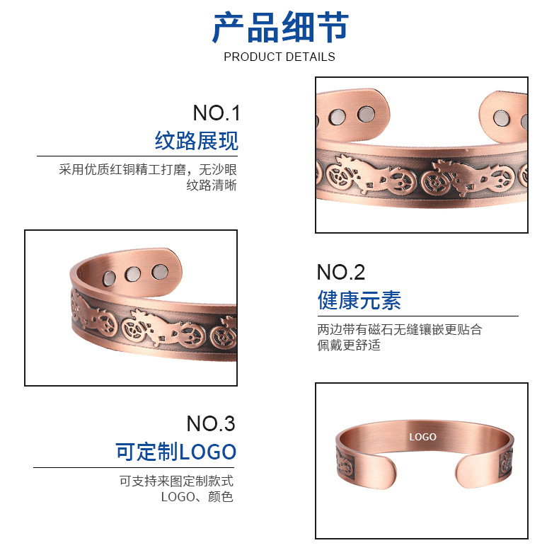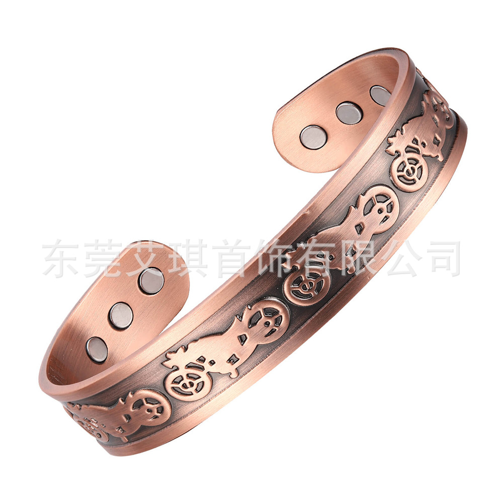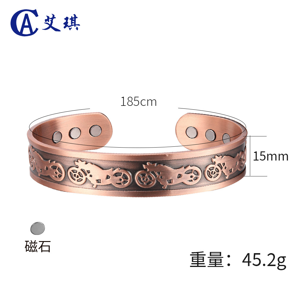 磁性红铜手镯新爆款摩托车紫铜手镯男款开口磁石红铜手镯现货批发
