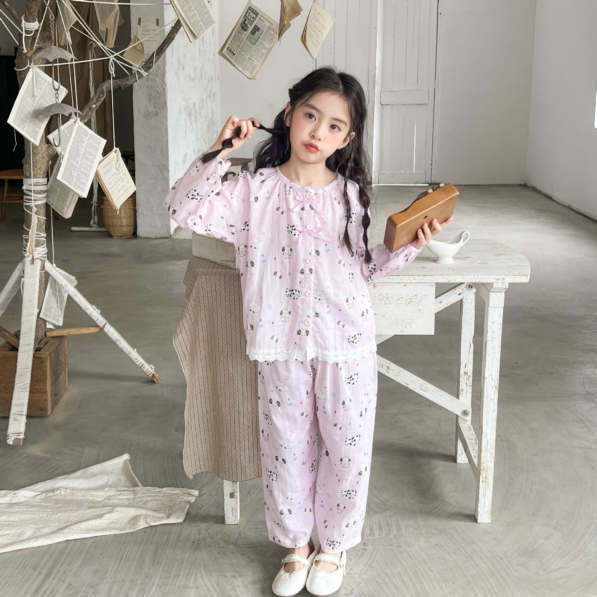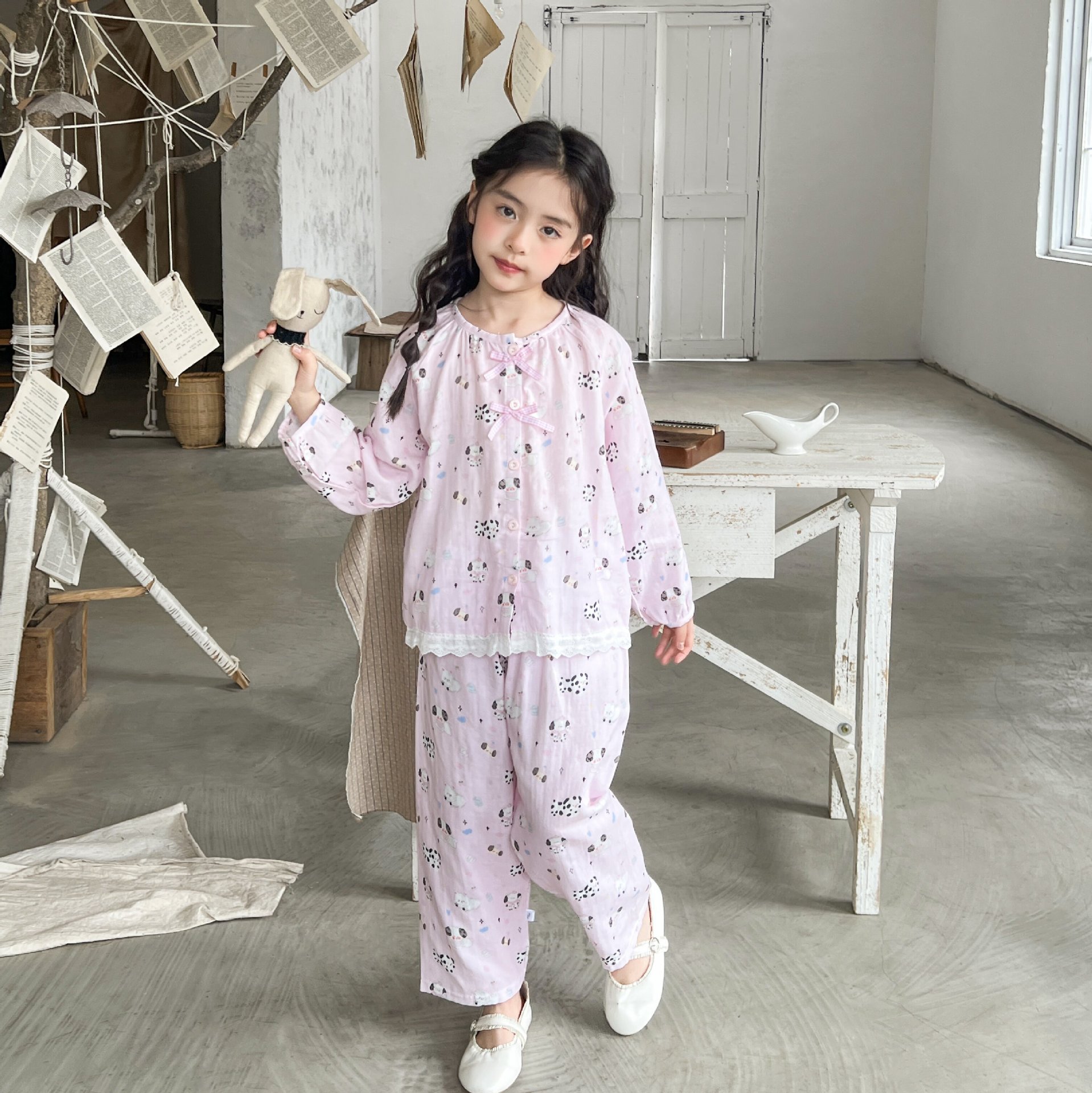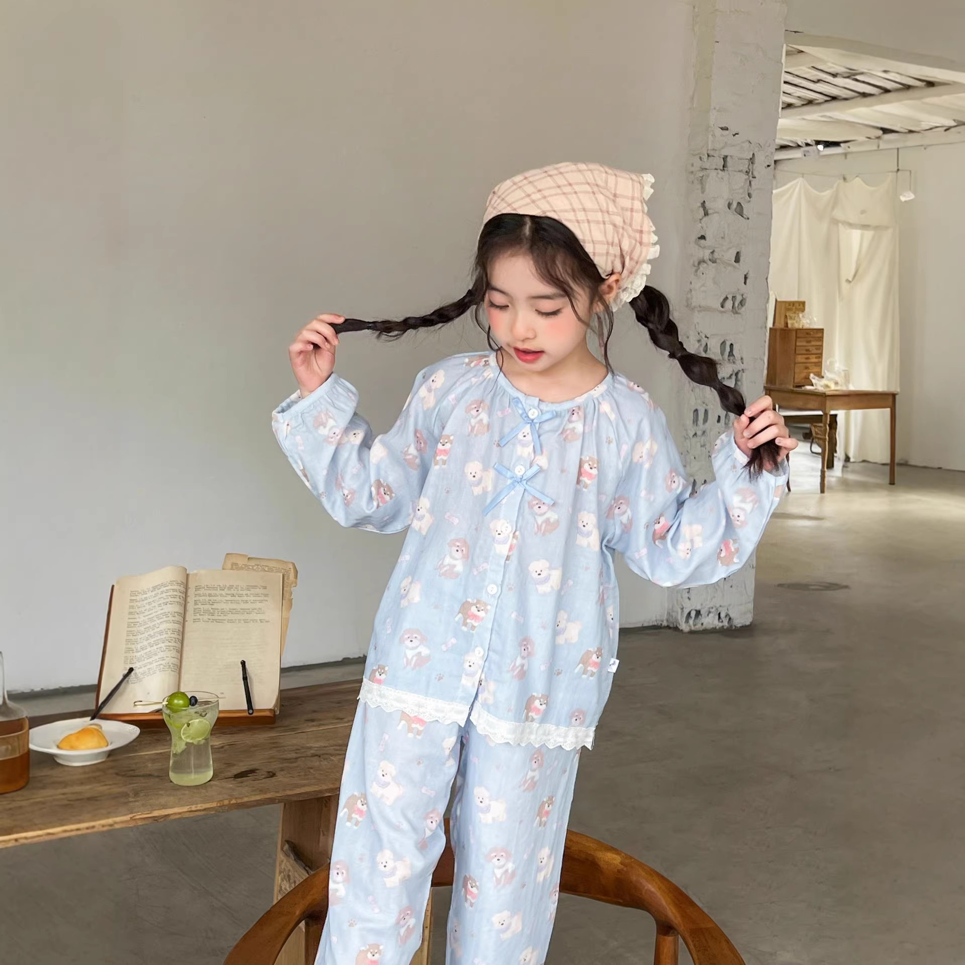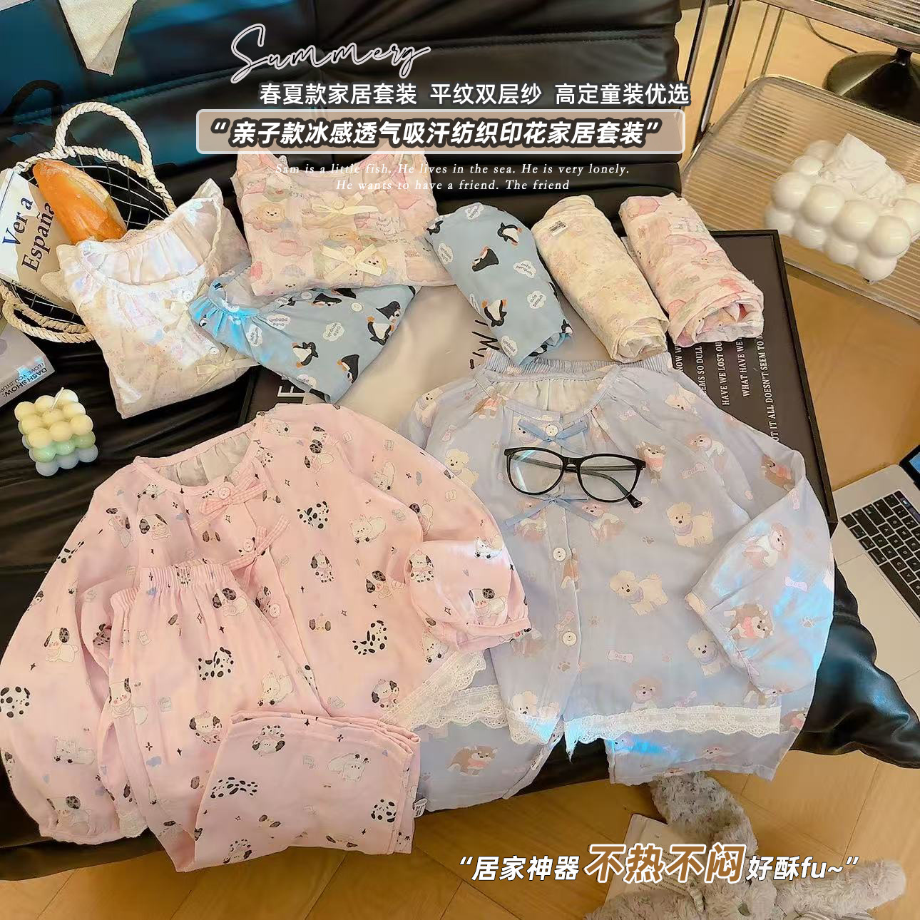 儿童睡衣春夏女童花边甜美开衫纯棉家居服男童卡通家居服套装亲子