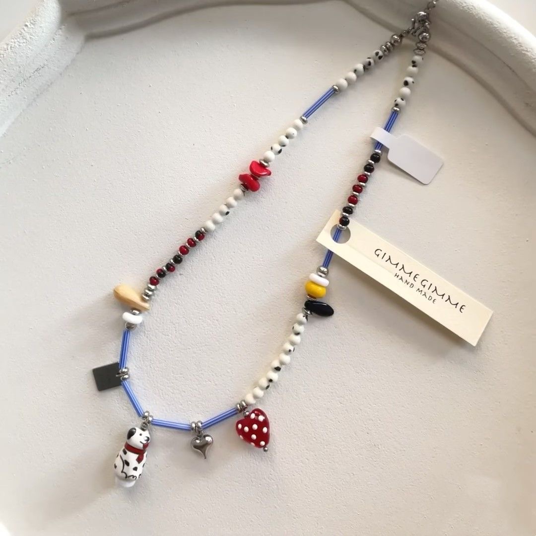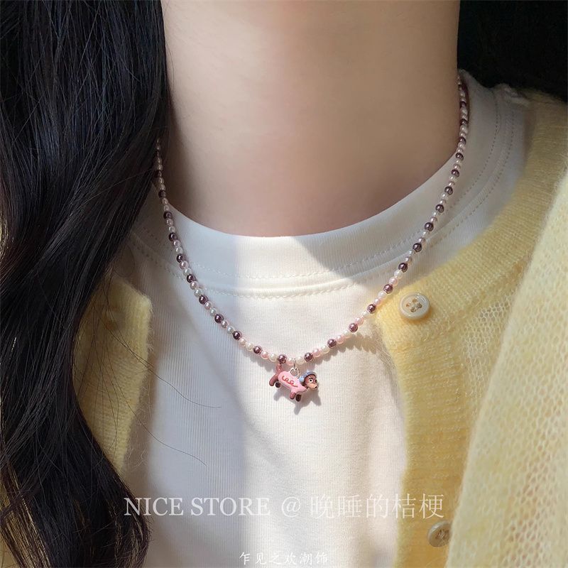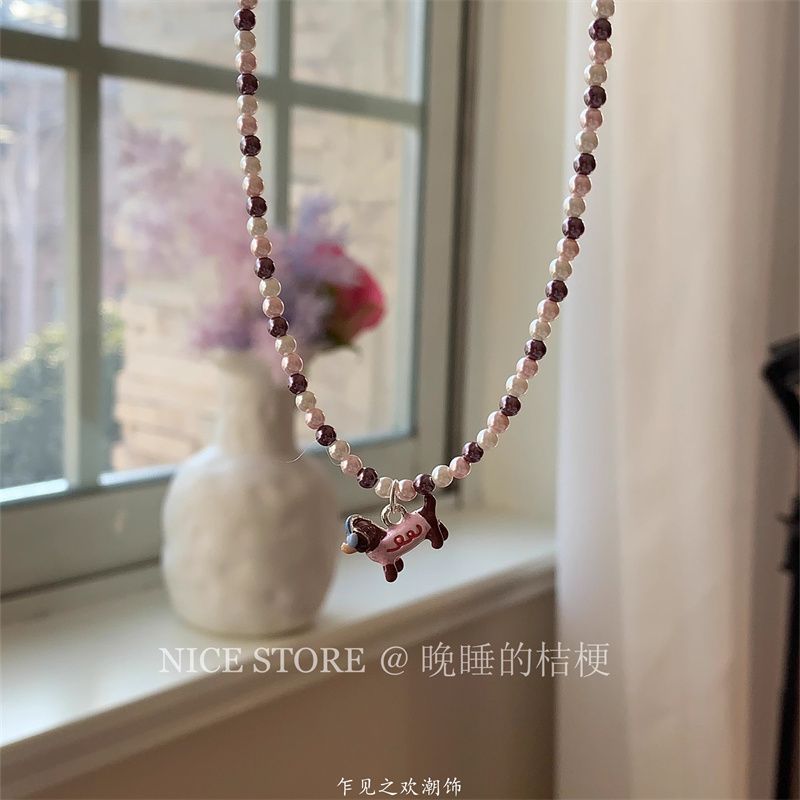 晚睡的桔梗「快乐园」粉色腊肠小狗珍珠项链爱心少女感百搭锁骨链