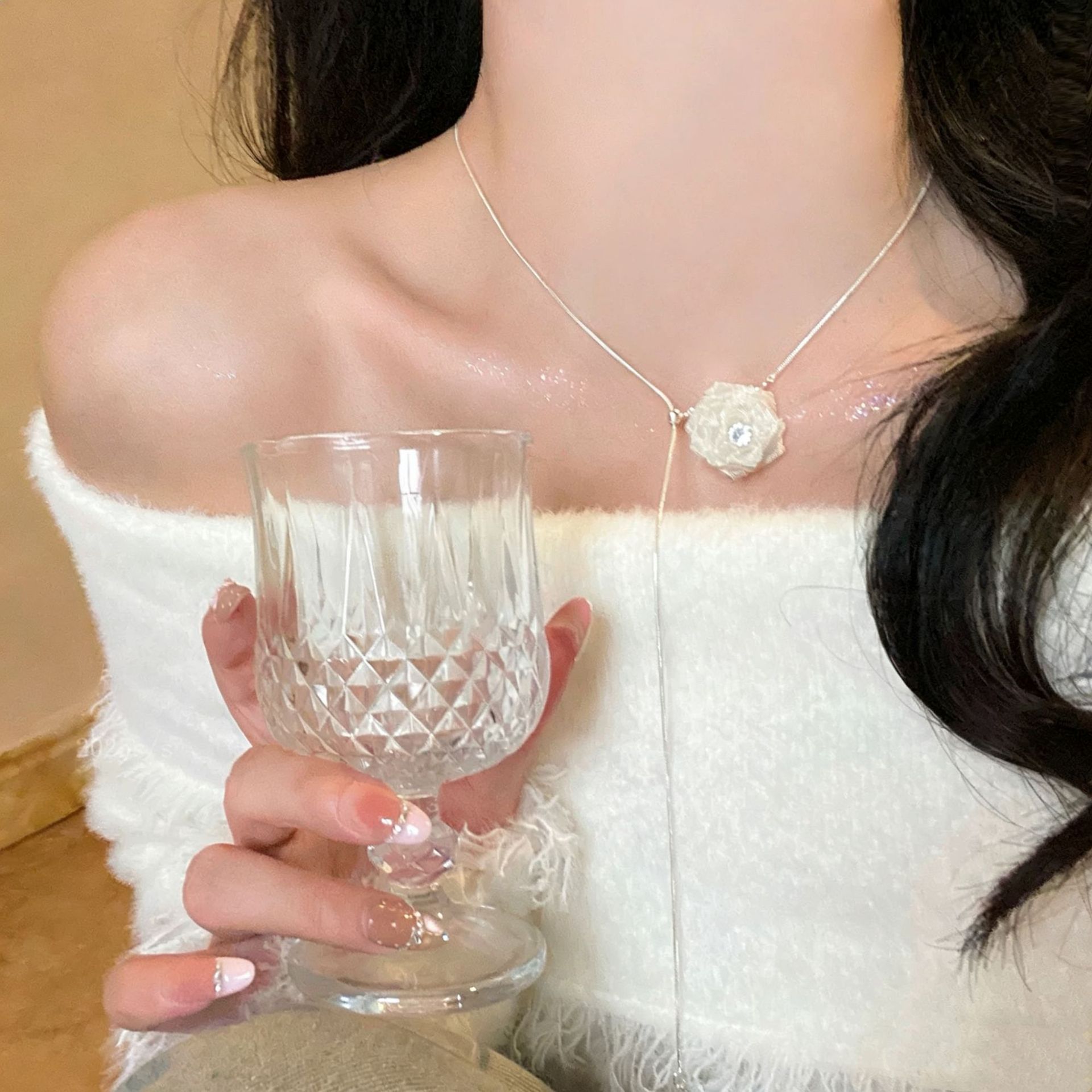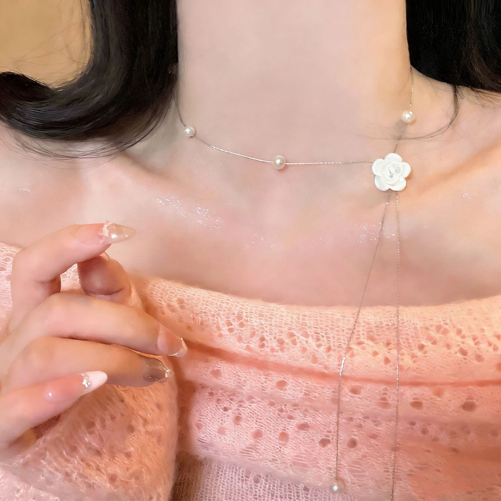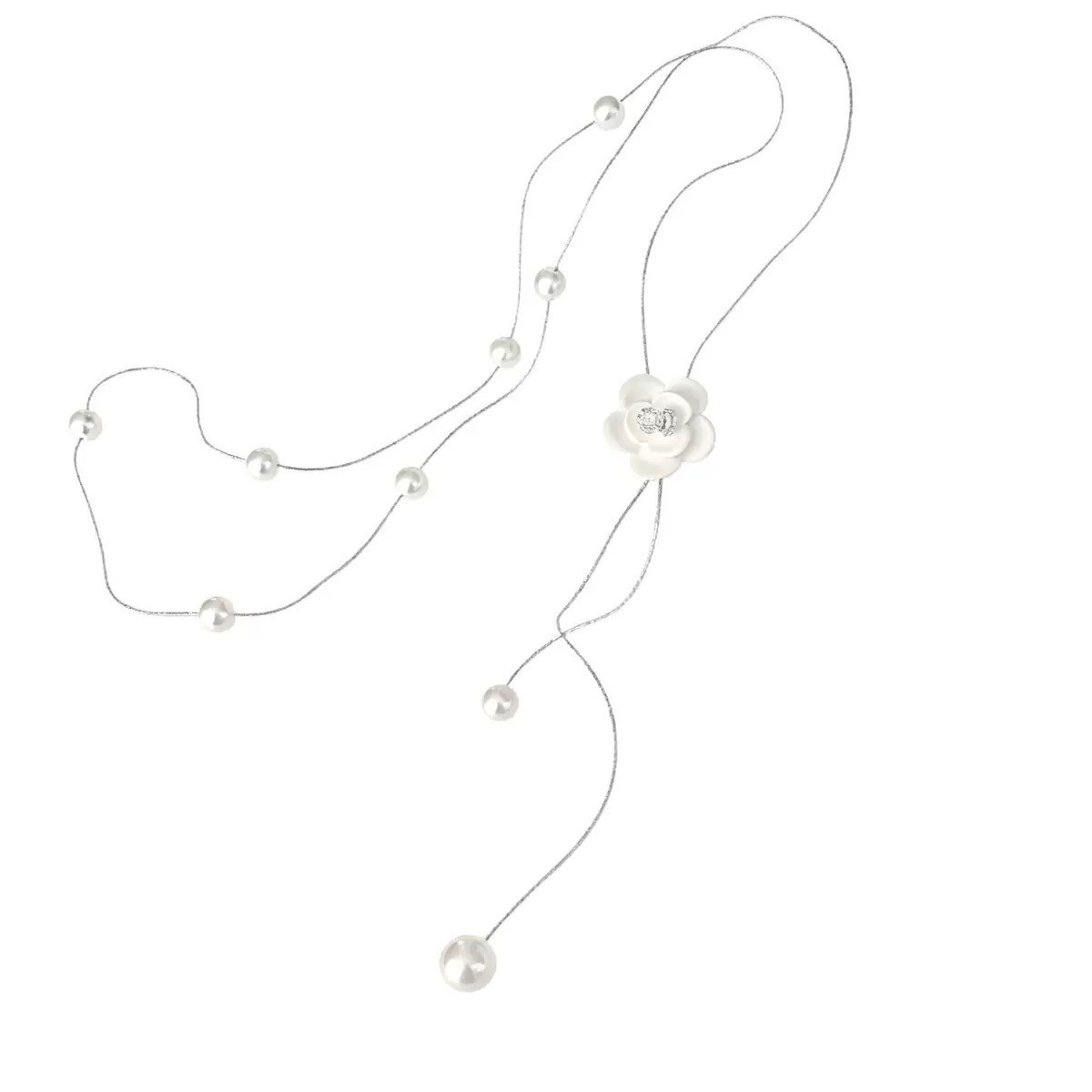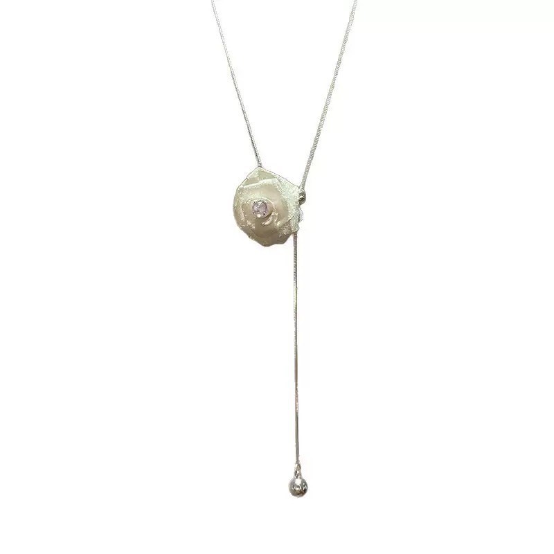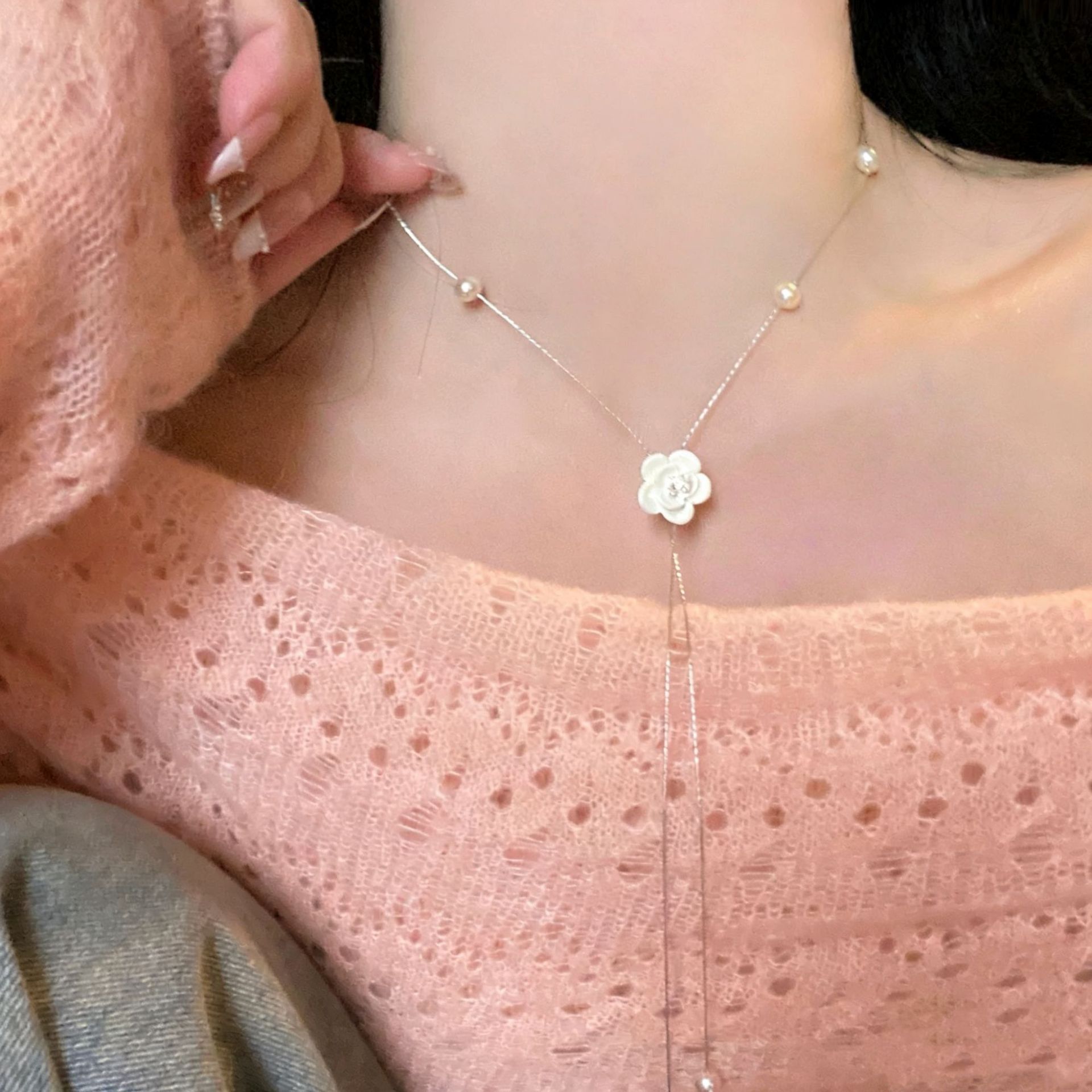 法式珍珠山茶花抽拉项链女小众轻奢高级感毛衣链秋冬长款百搭配饰
