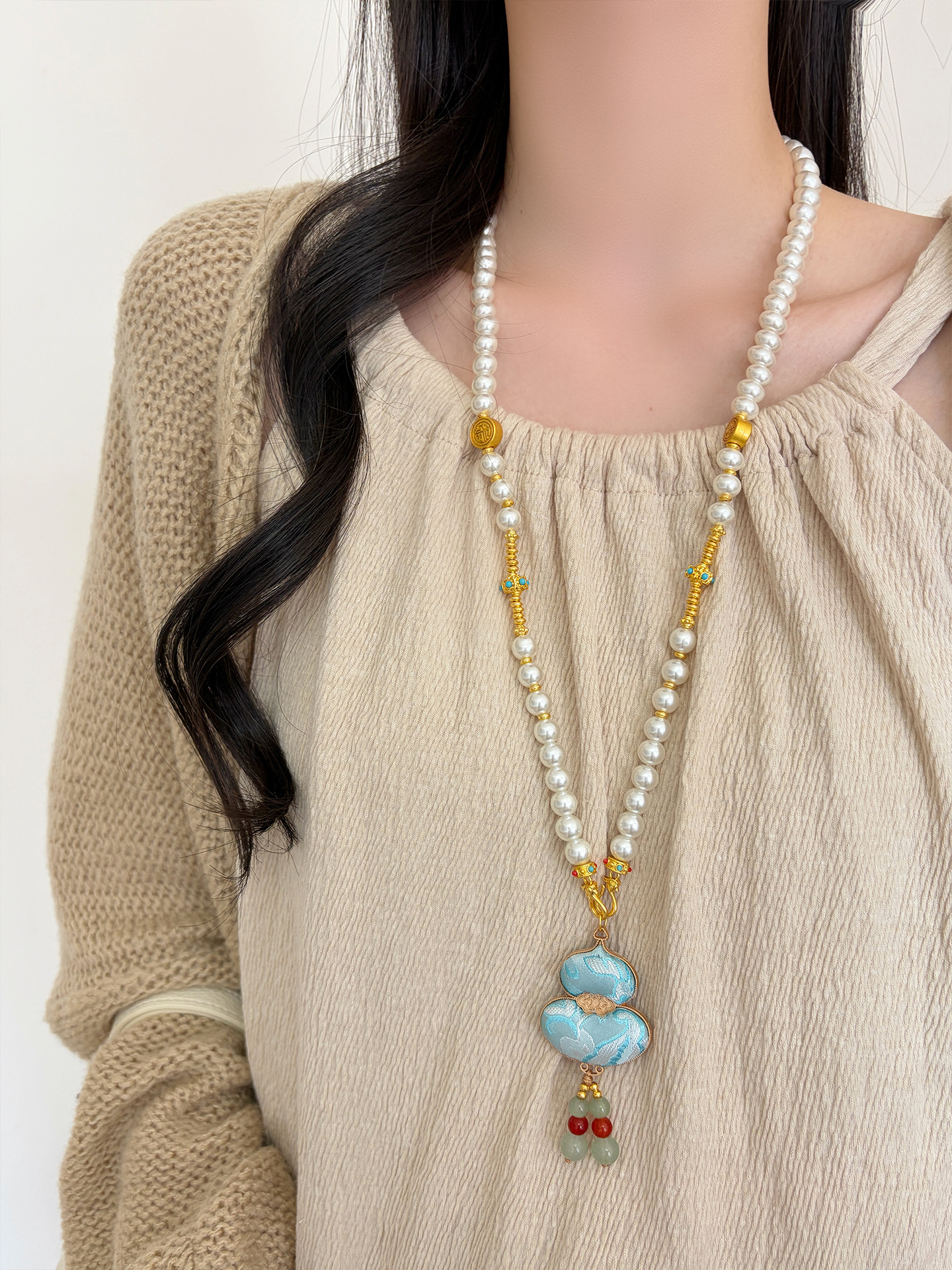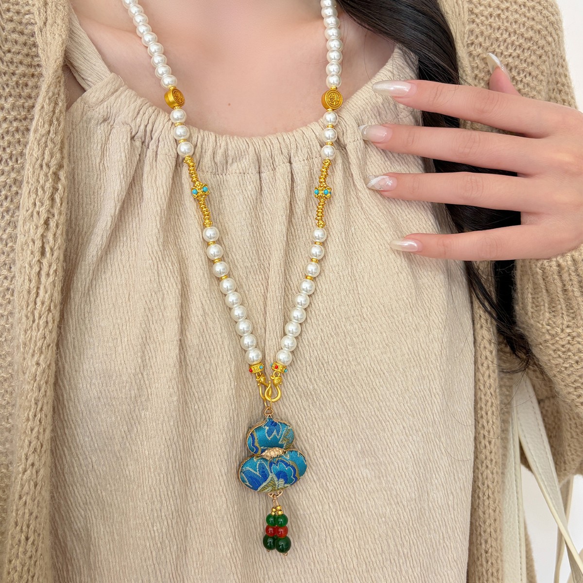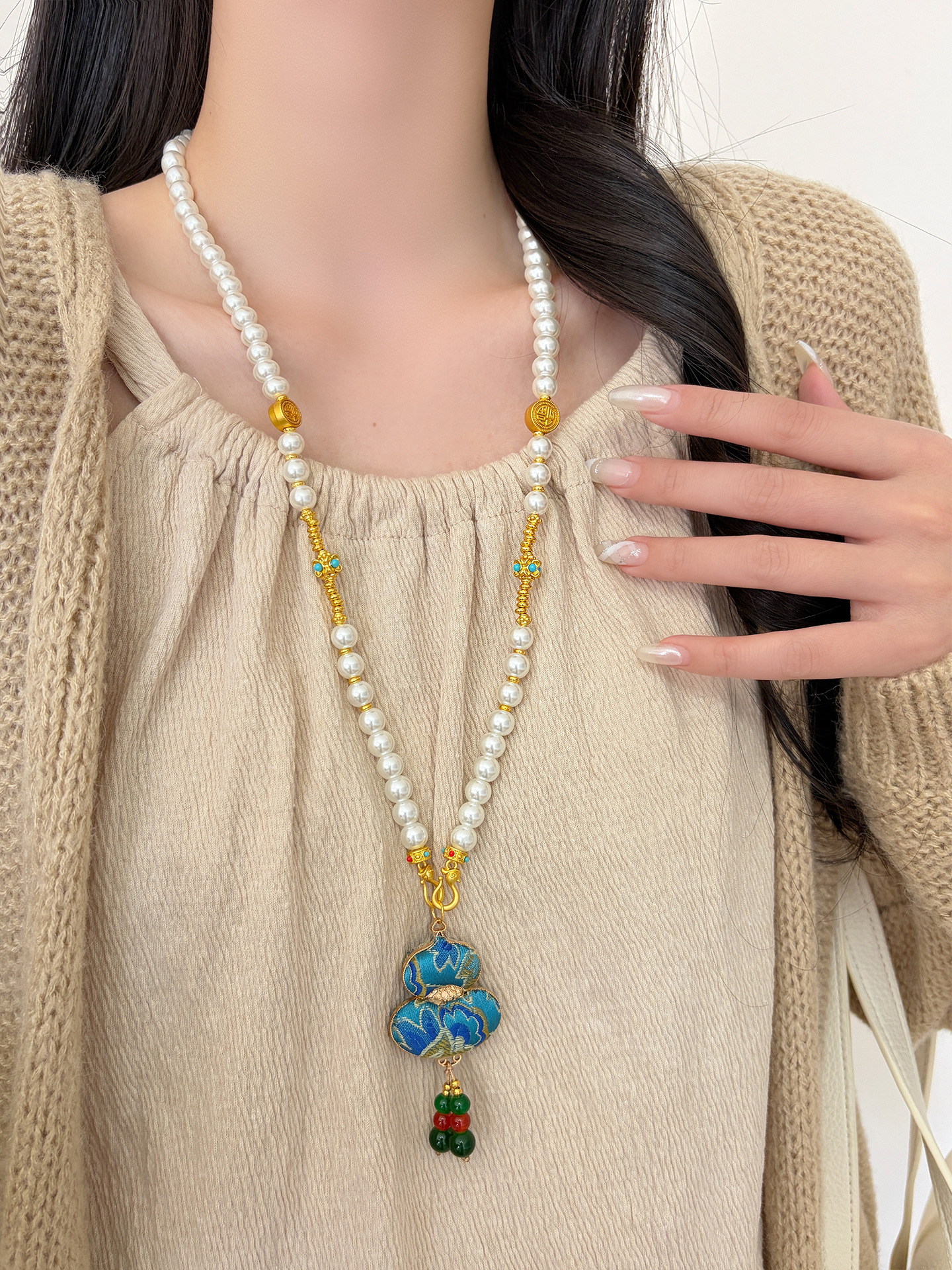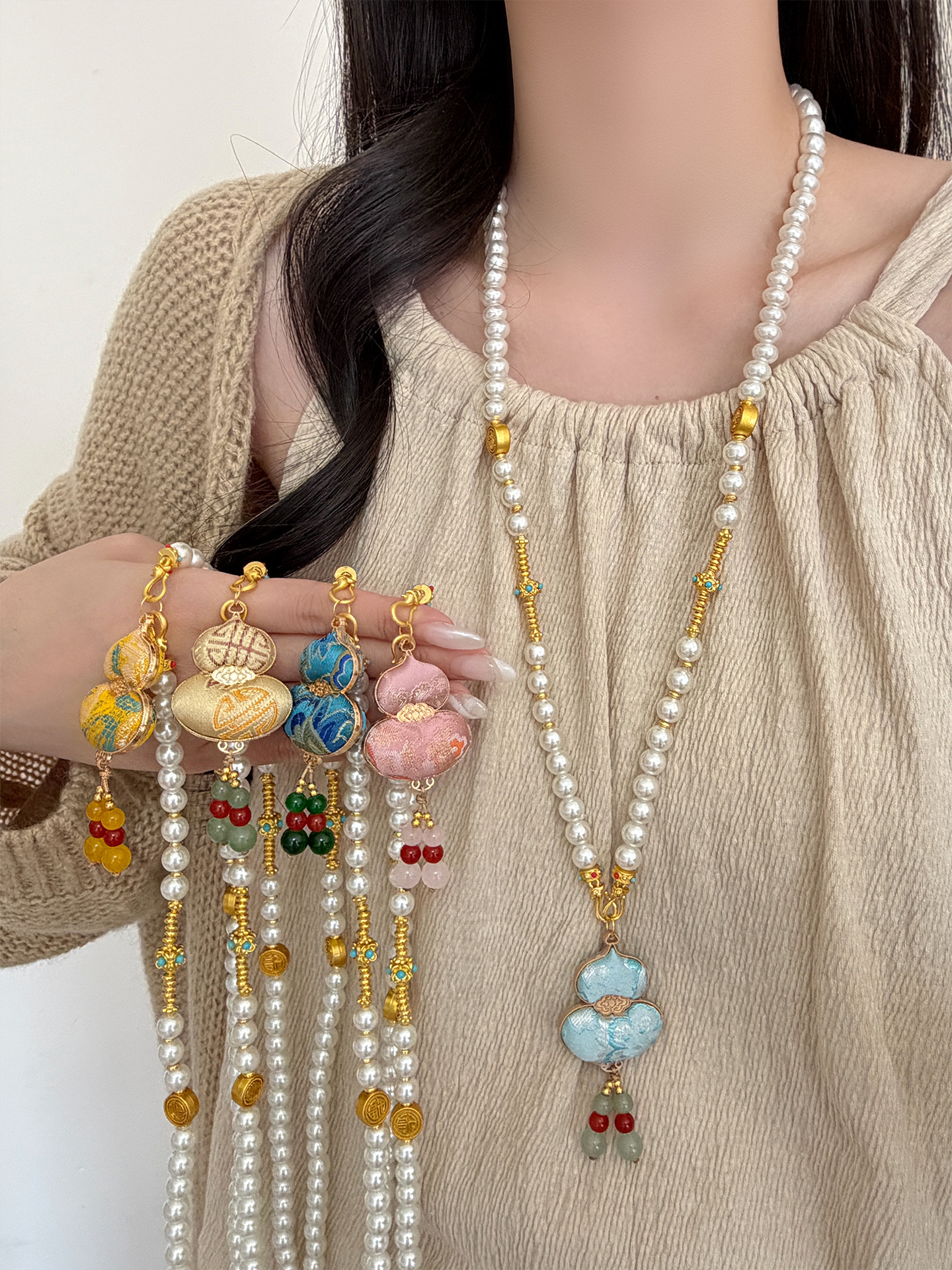 新中式民族风宋锦葫芦吊坠项链时尚串珠长毛衣链小众设计感配饰女