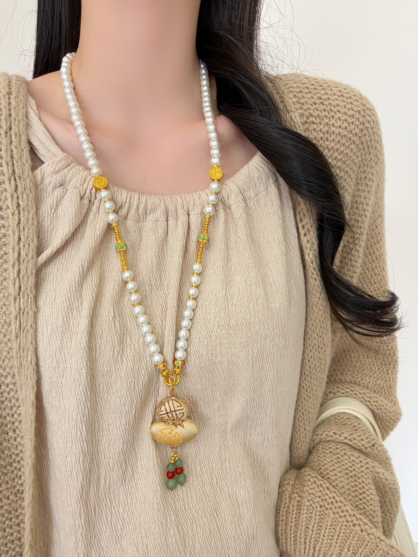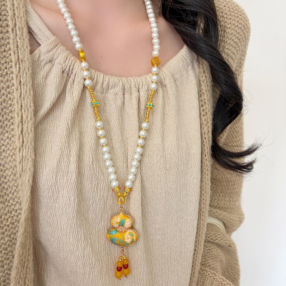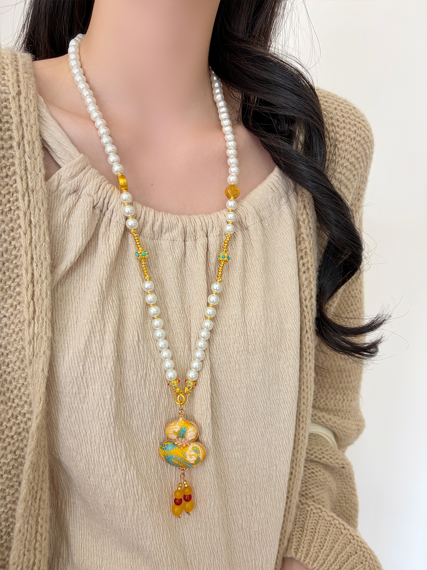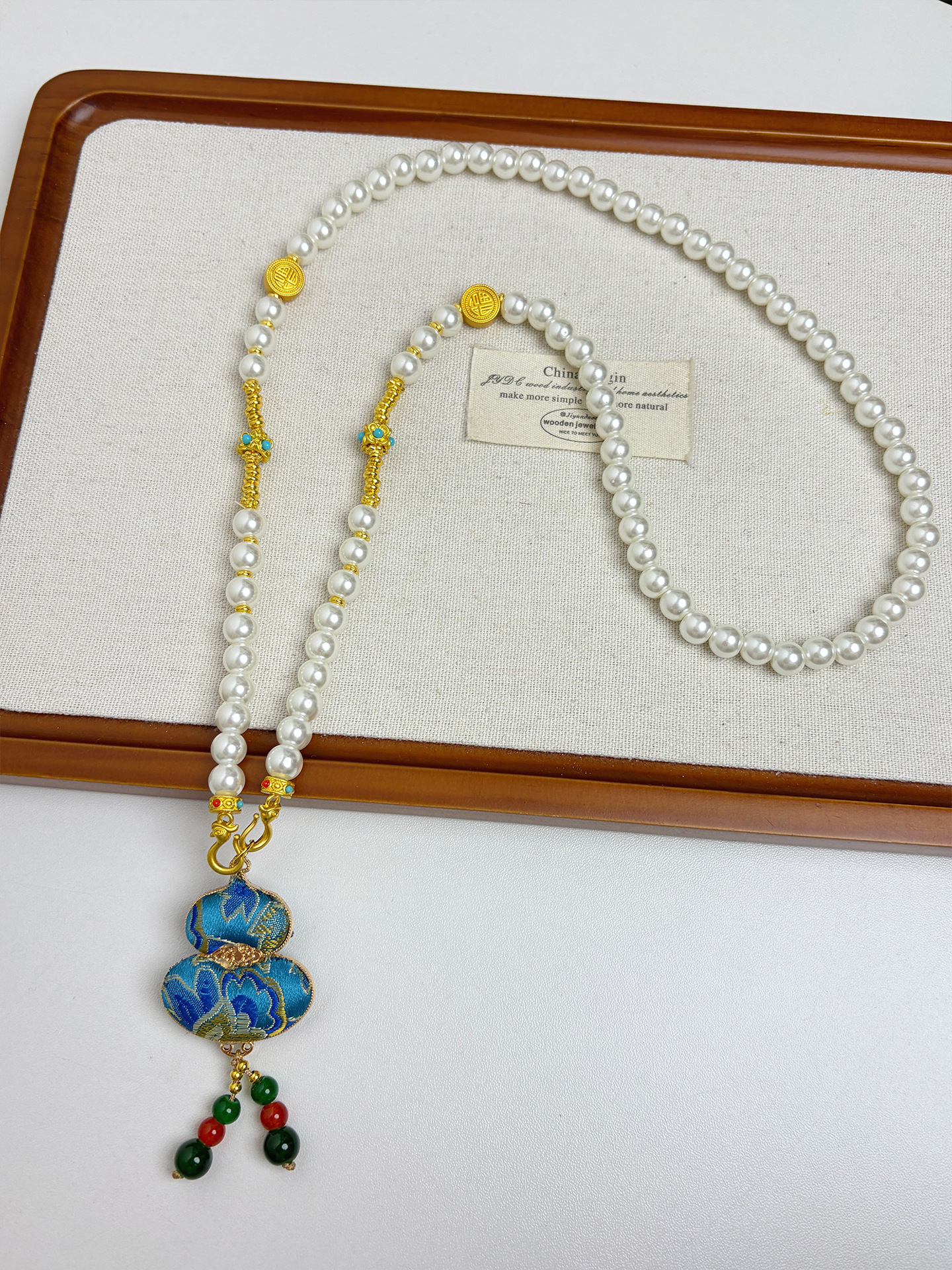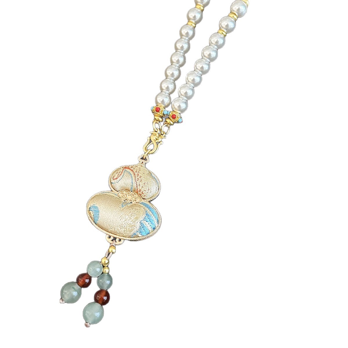 新中式民族风宋锦葫芦吊坠项链时尚串珠长毛衣链小众设计感配饰女
