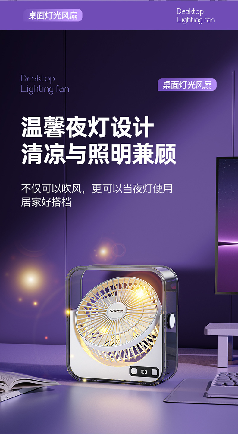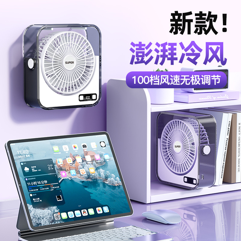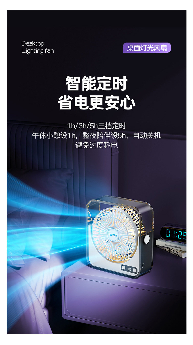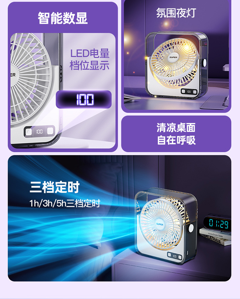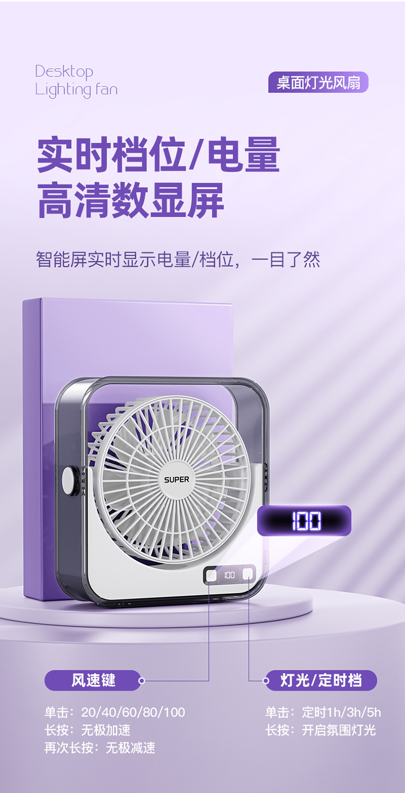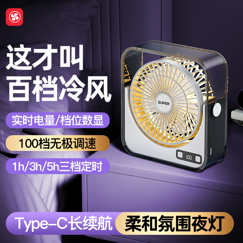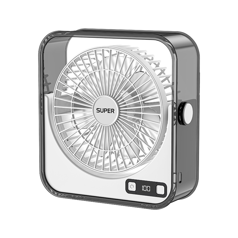 桌面小风扇USB大风力灯光智能数显风扇充电款透明宿舍学生风扇