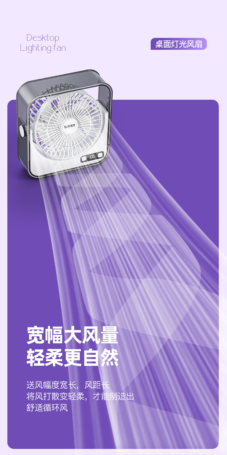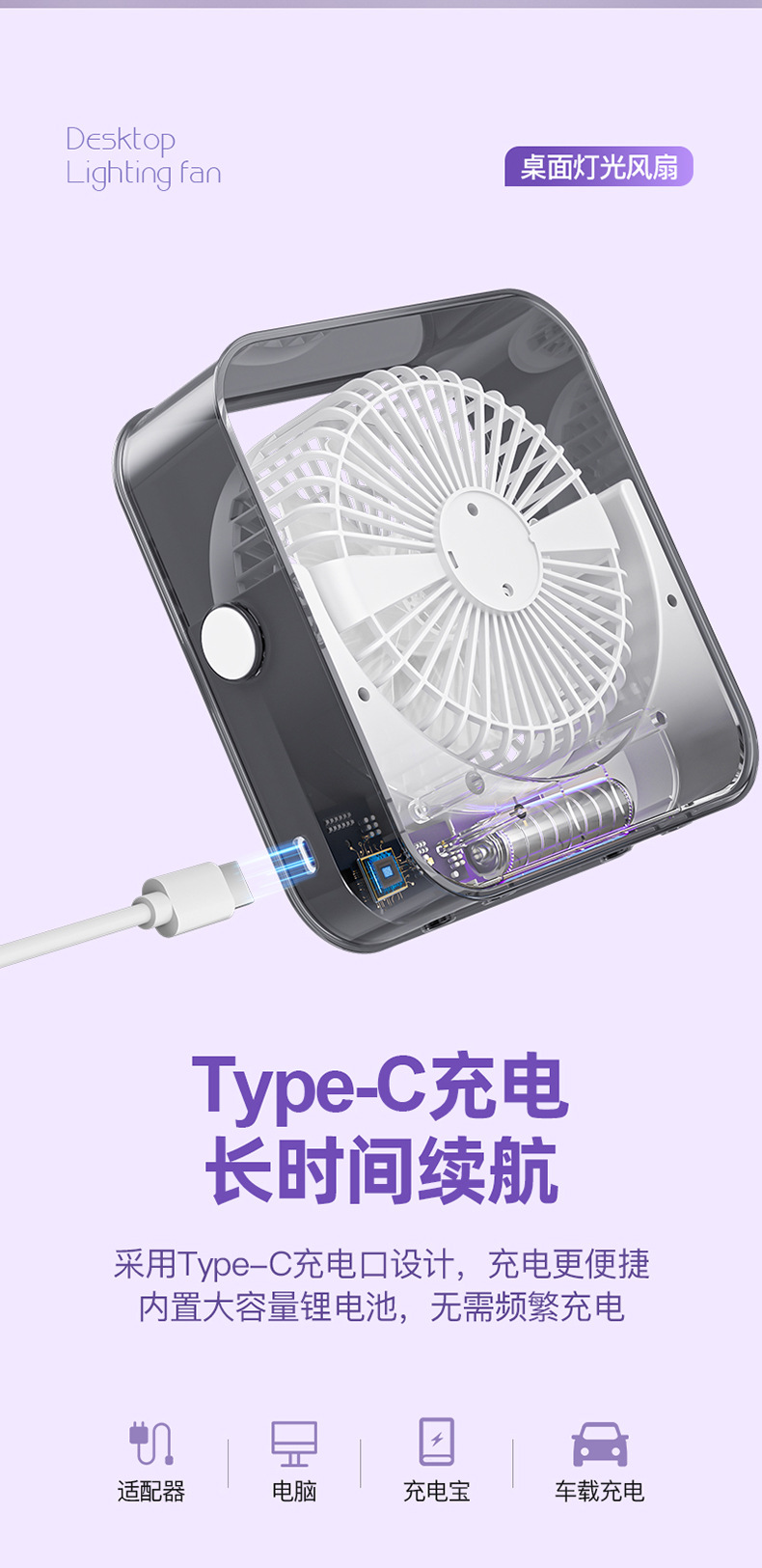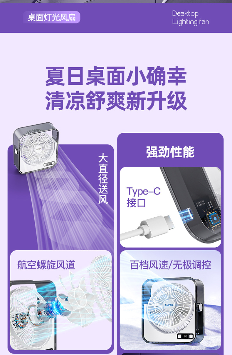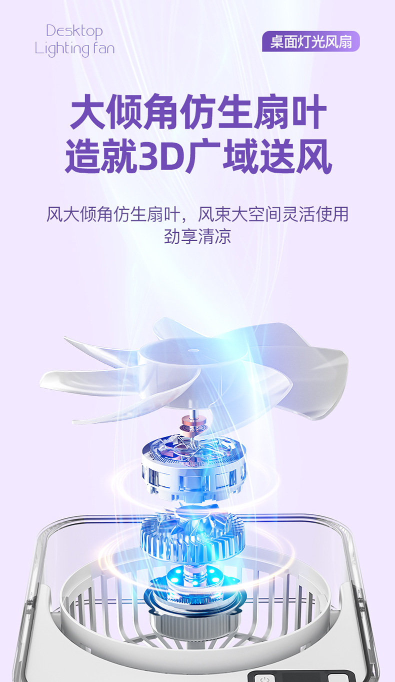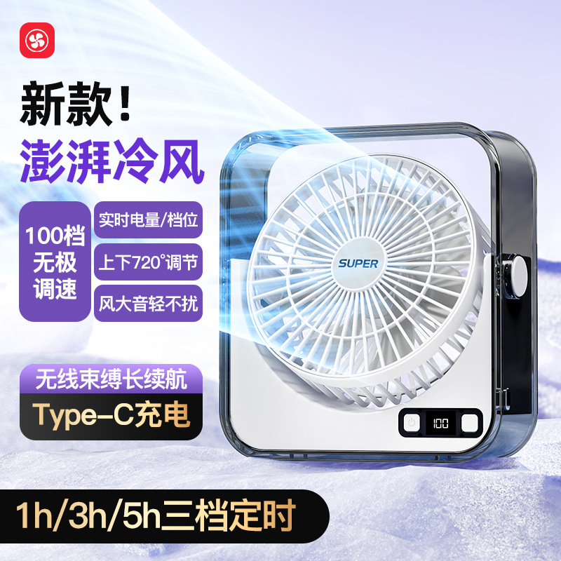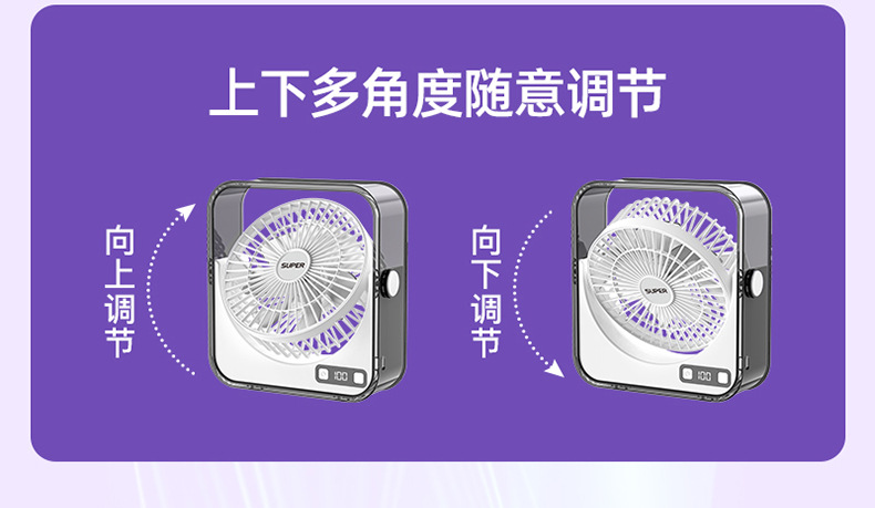 桌面小风扇USB大风力灯光智能数显风扇充电款透明宿舍学生风扇