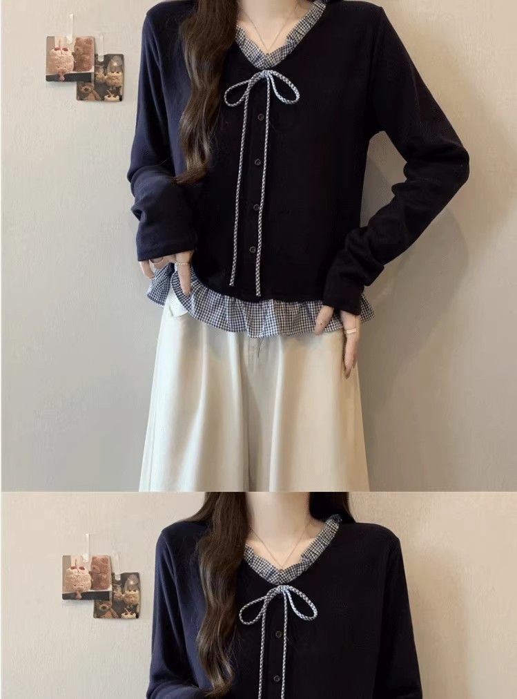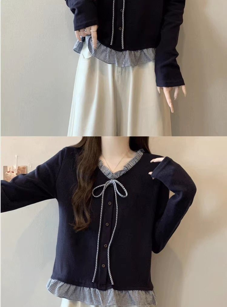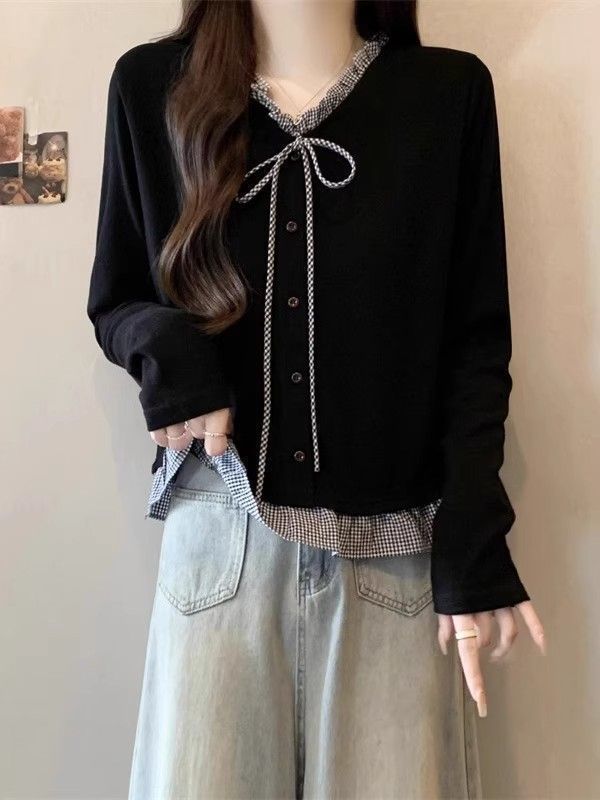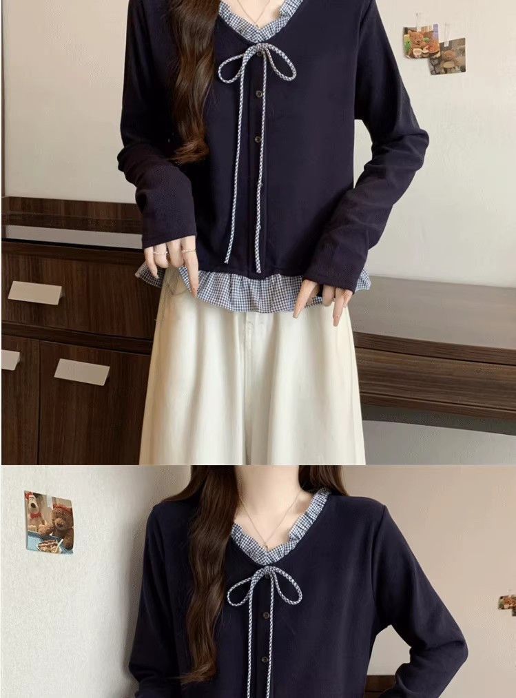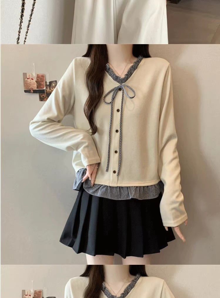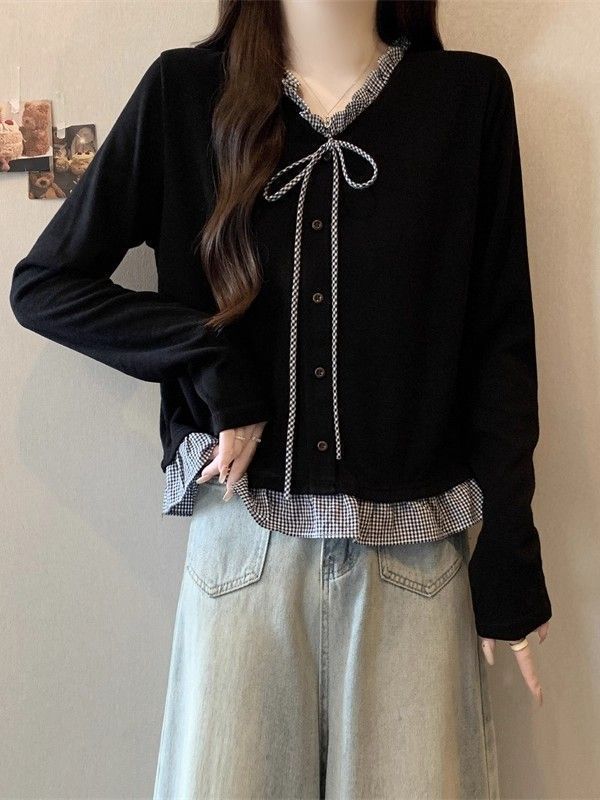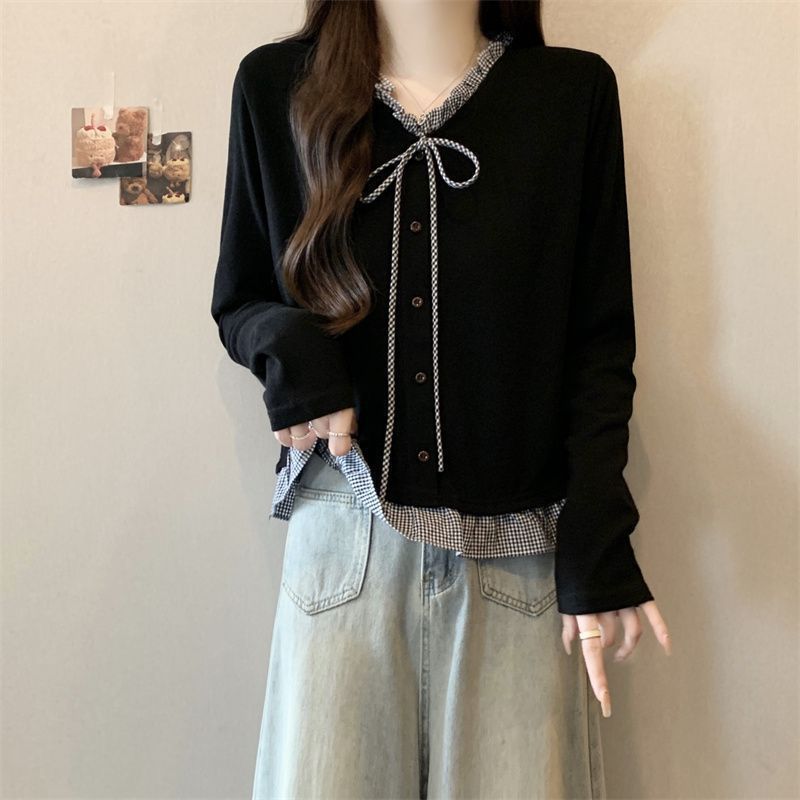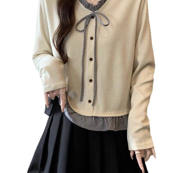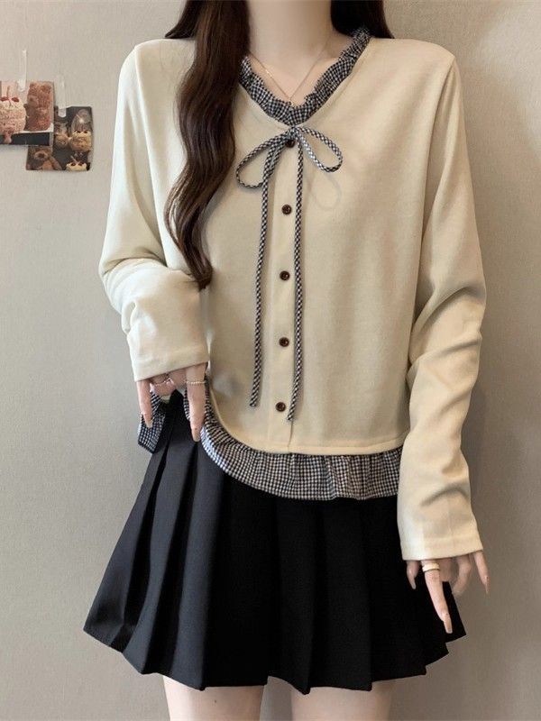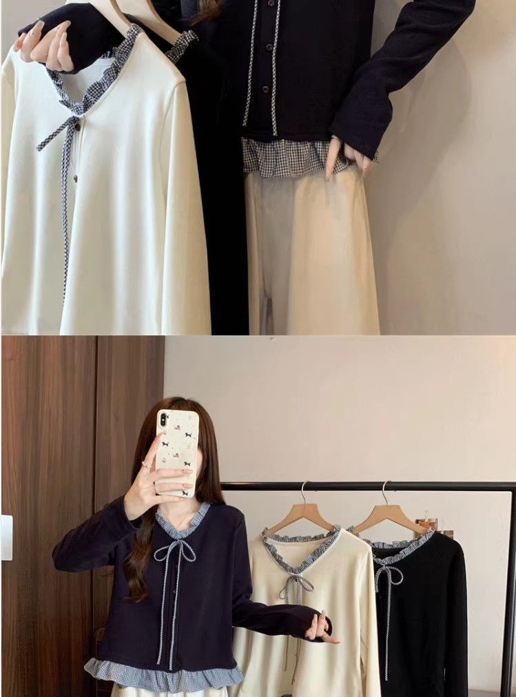 大码德绒木耳边V领假两件长袖衬衫女秋冬季新款胖mm显瘦遮肉上衣