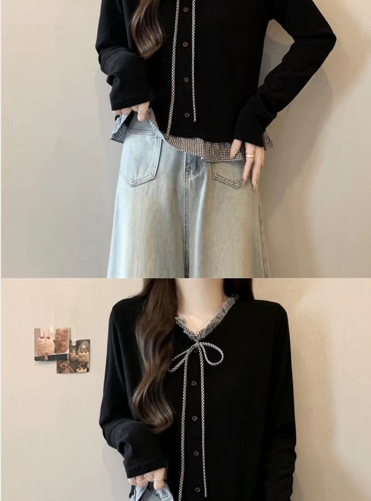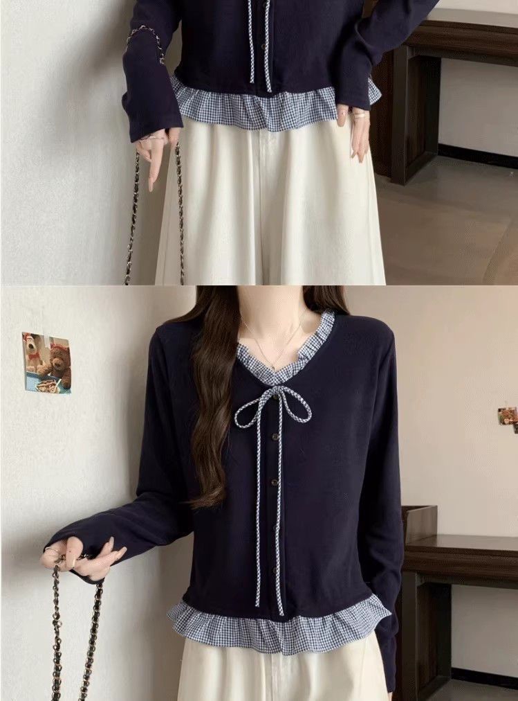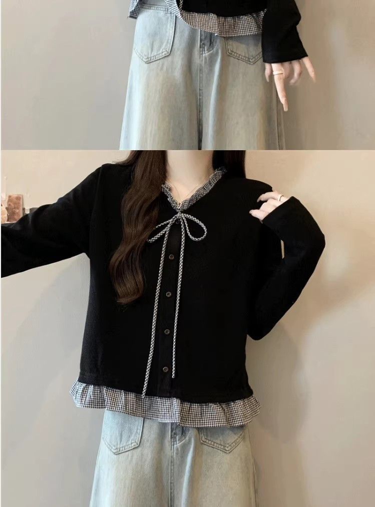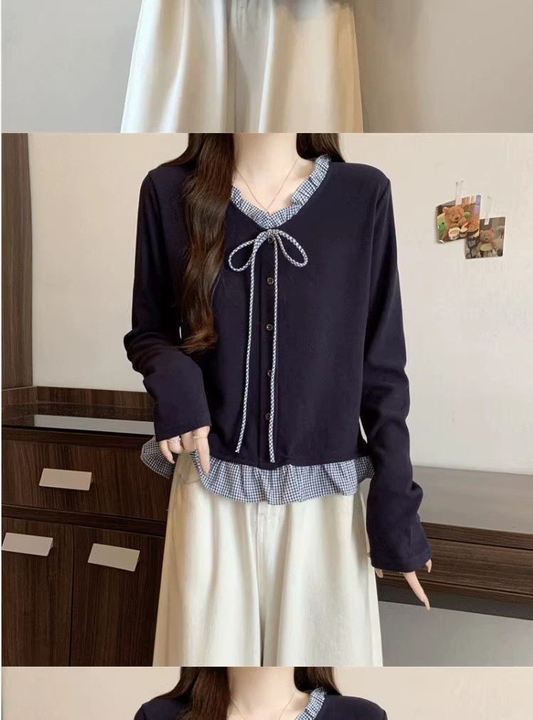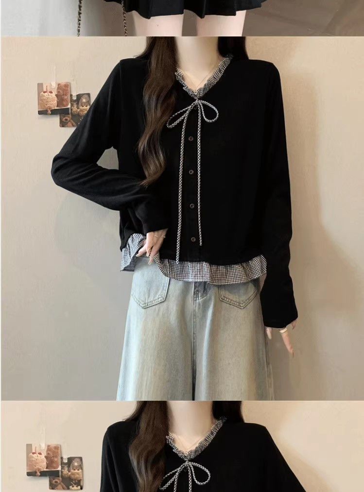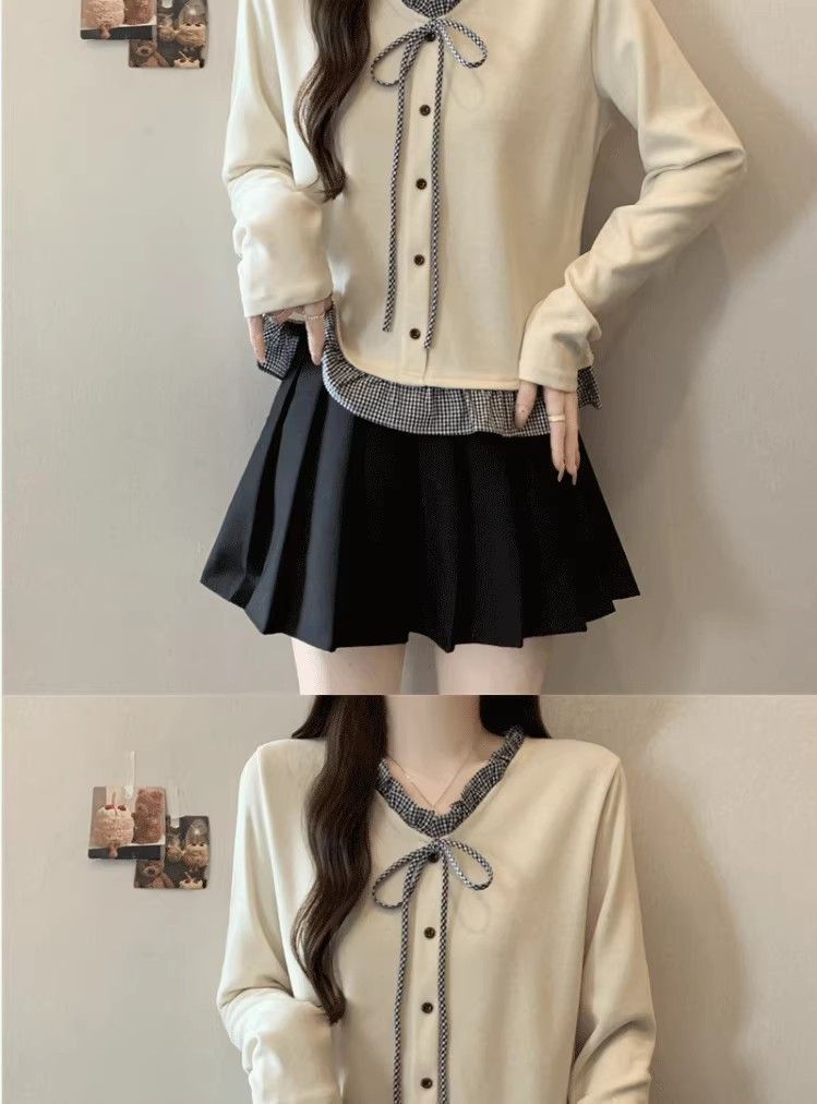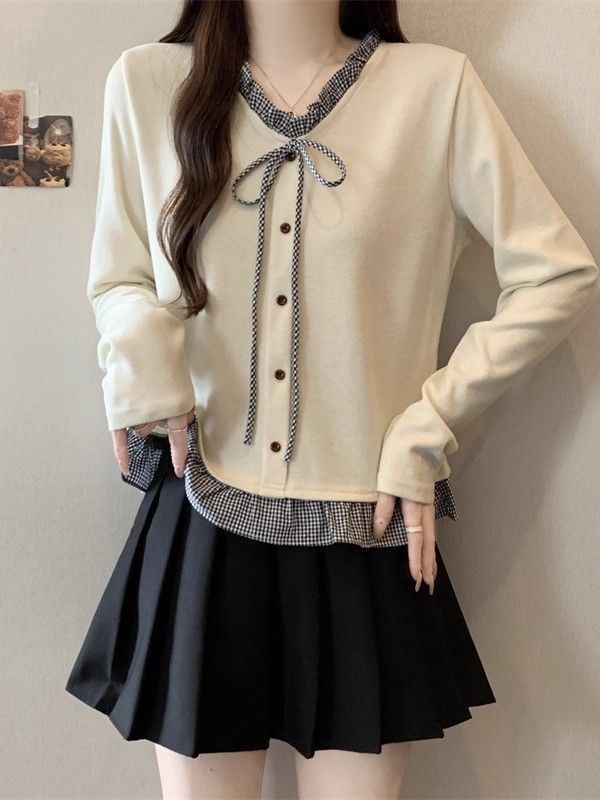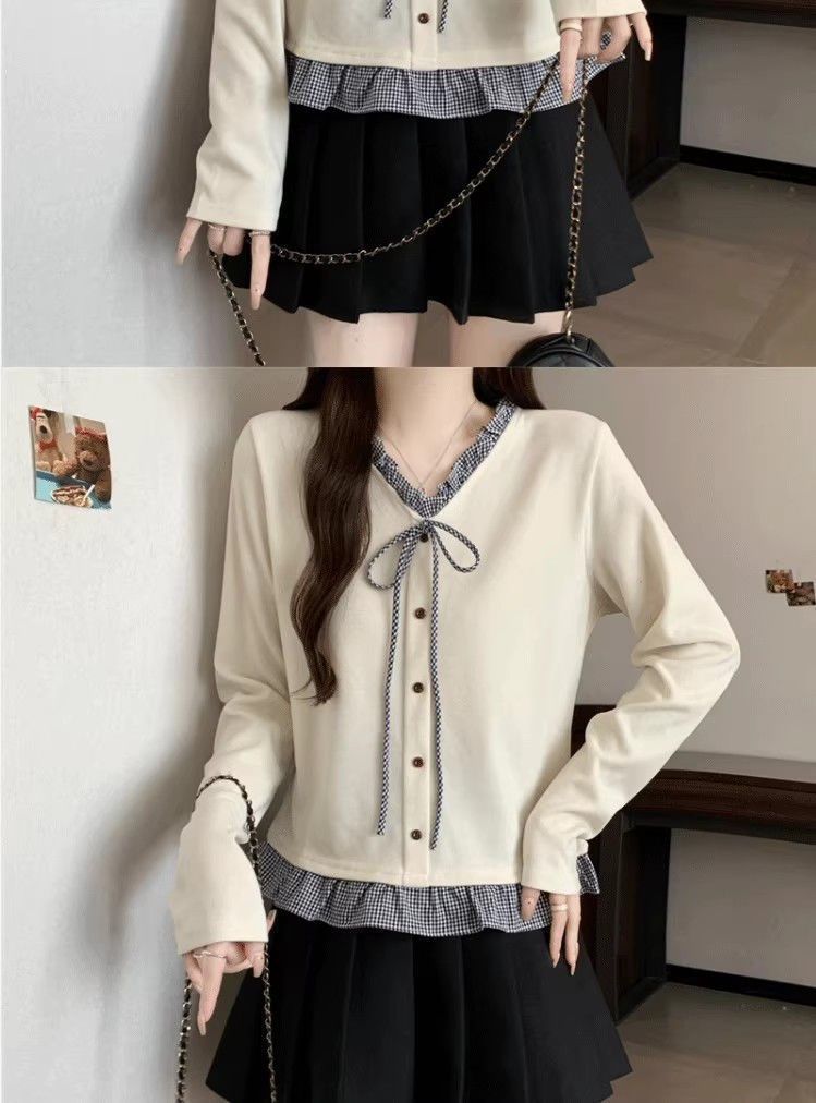 大码德绒木耳边V领假两件长袖衬衫女秋冬季新款胖mm显瘦遮肉上衣
