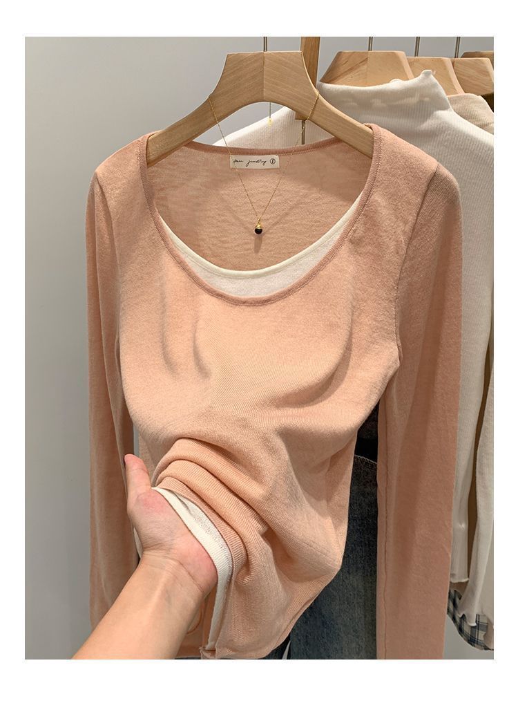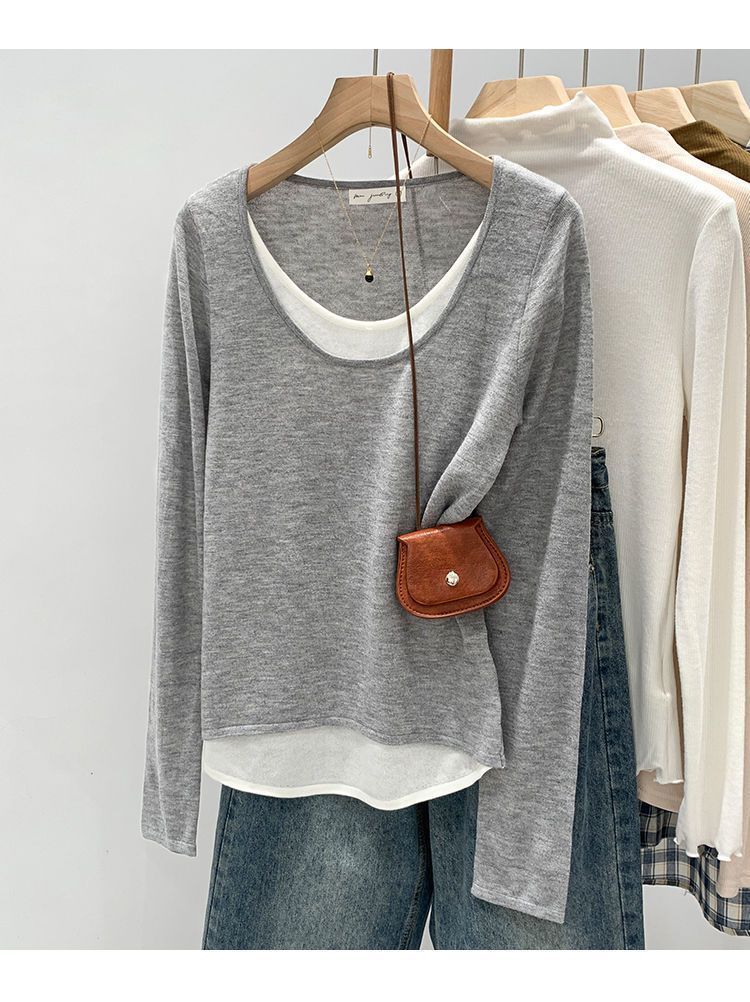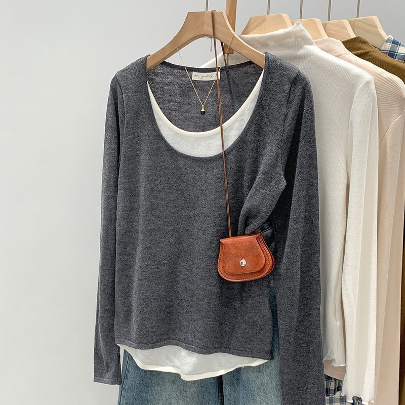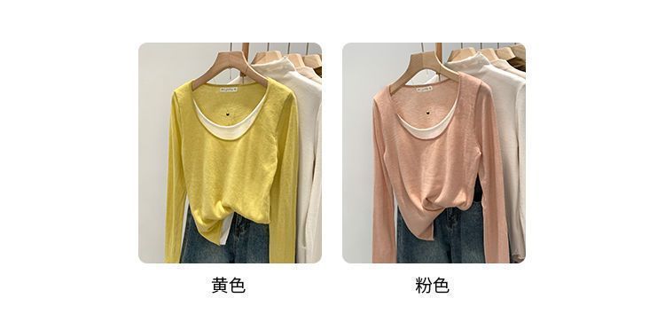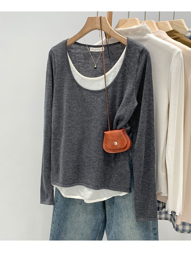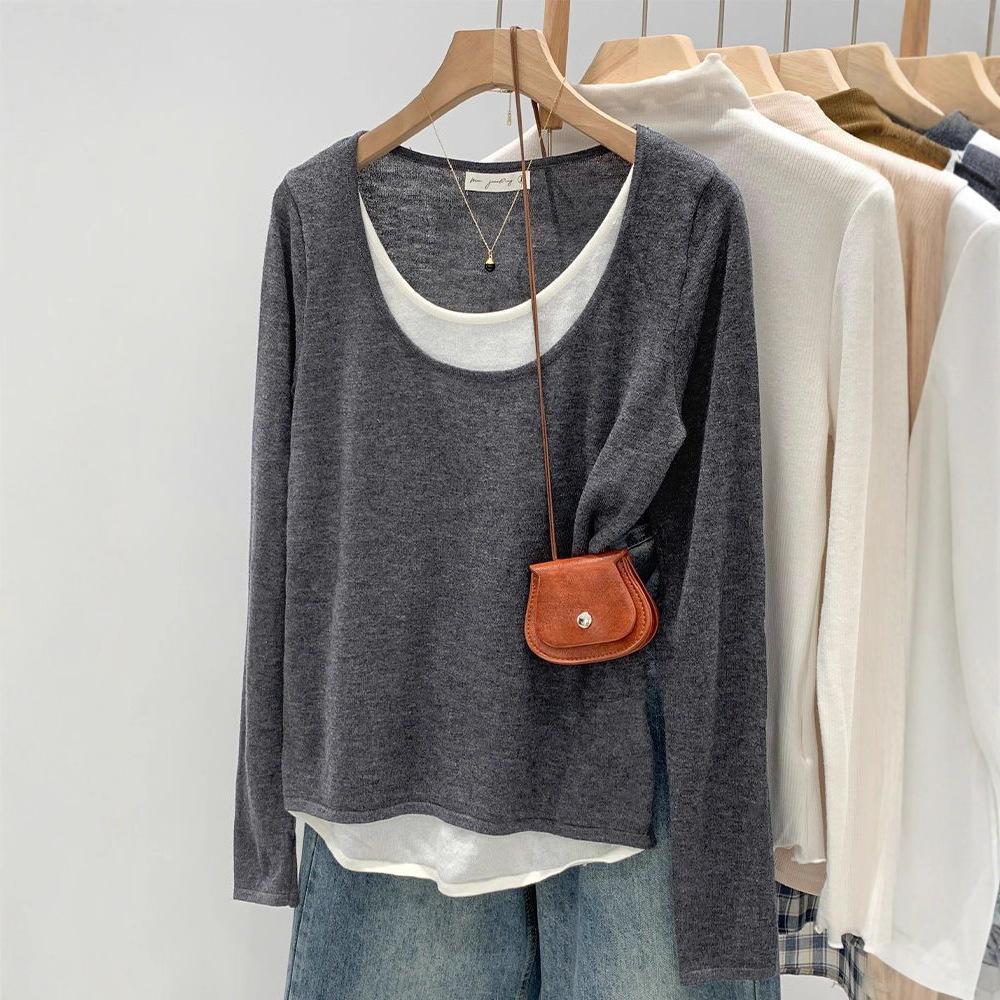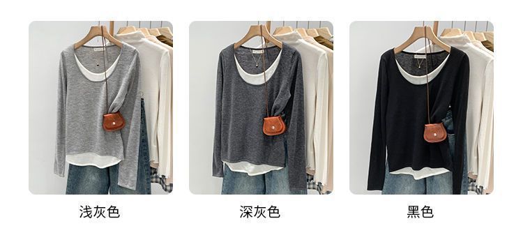 撞色假两件针织打底衫女春秋大码女装胖mm内搭宽松慵懒松弛感上衣