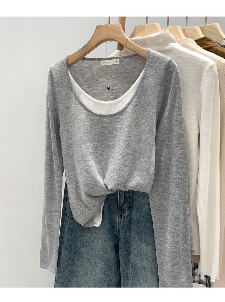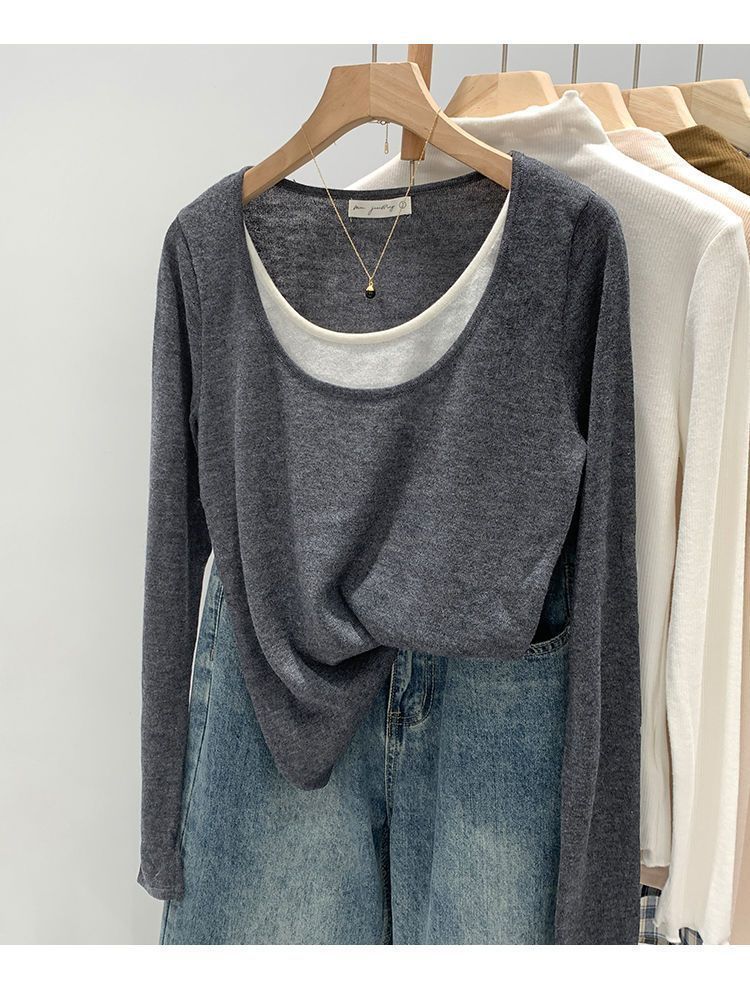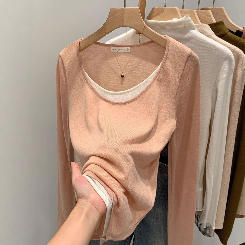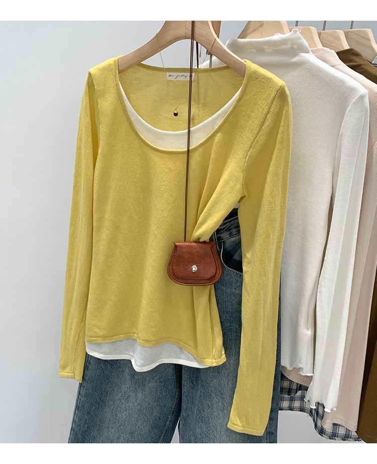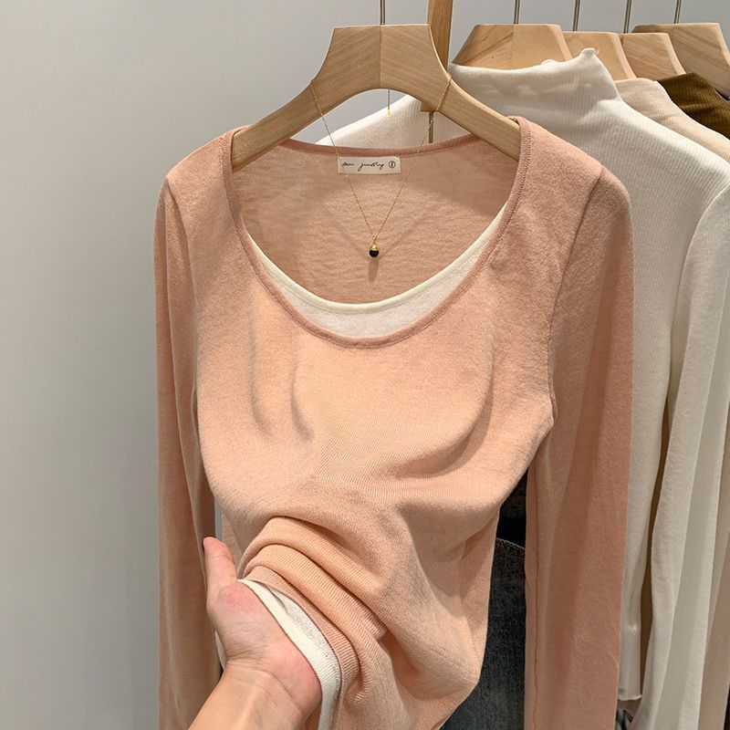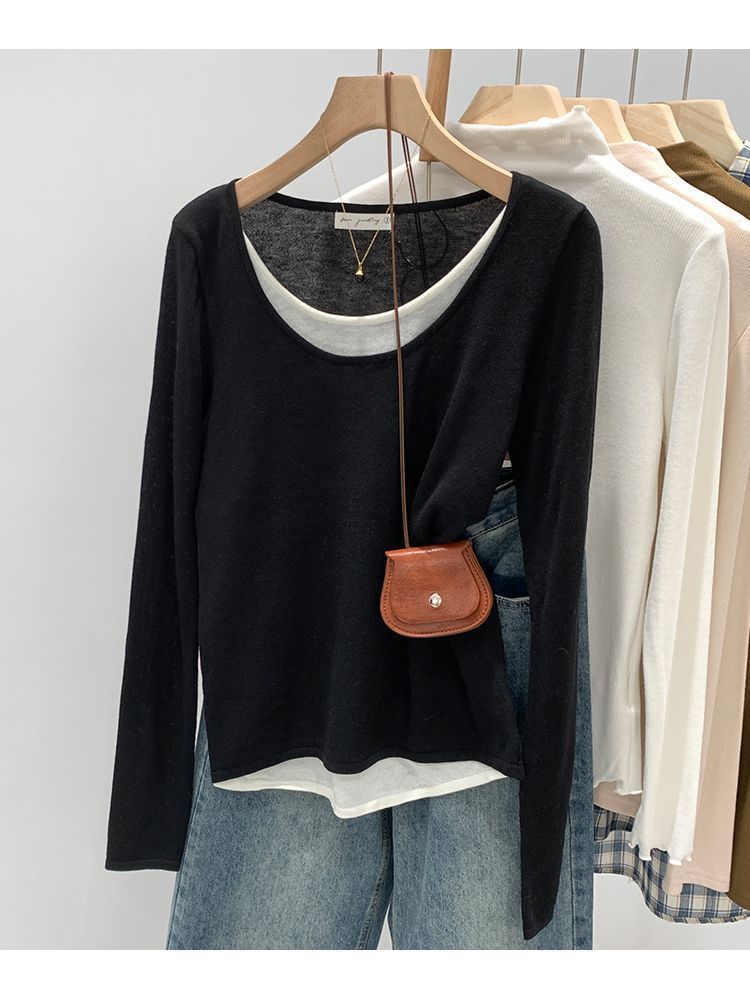 撞色假两件针织打底衫女春秋大码女装胖mm内搭宽松慵懒松弛感上衣