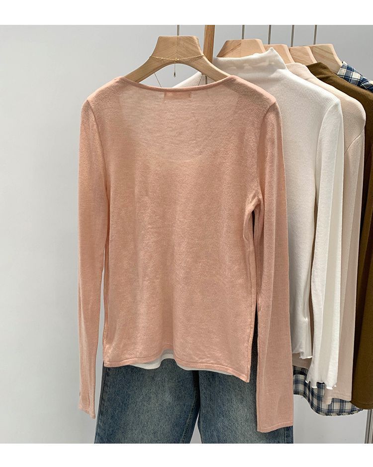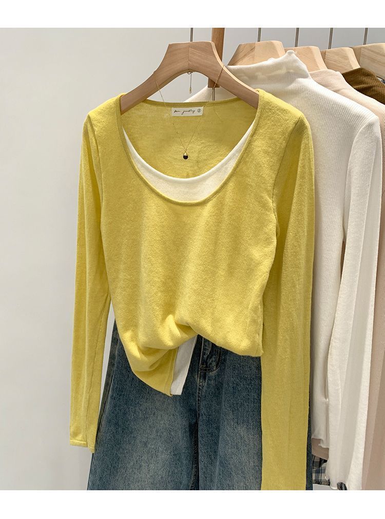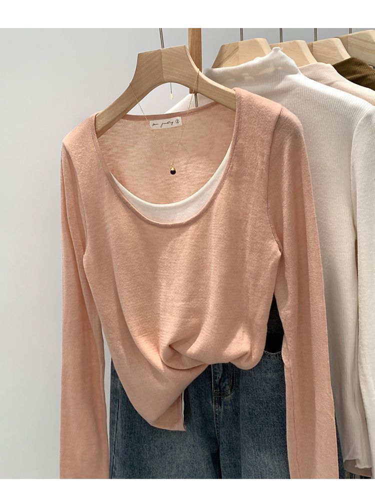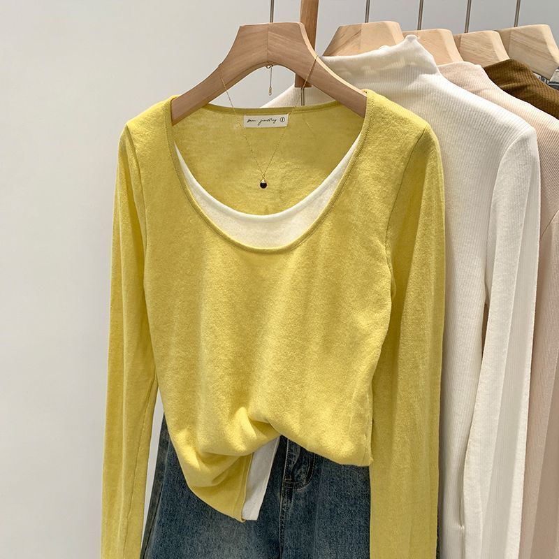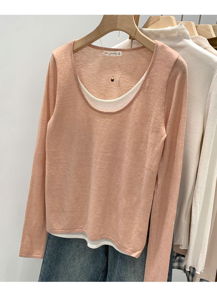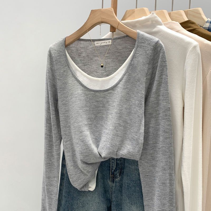 撞色假两件针织打底衫女春秋大码女装胖mm内搭宽松慵懒松弛感上衣