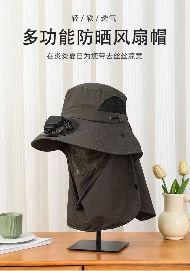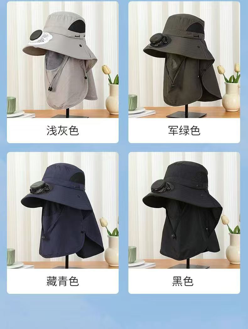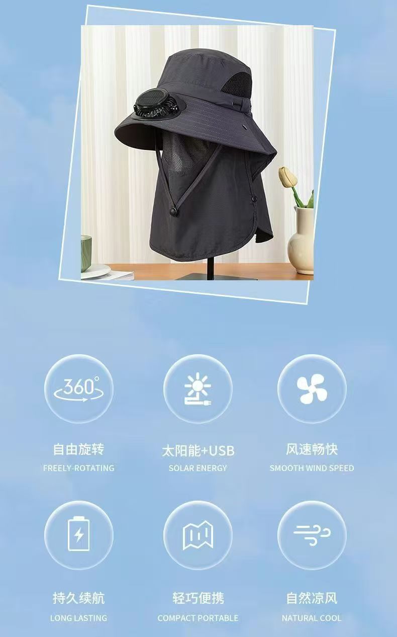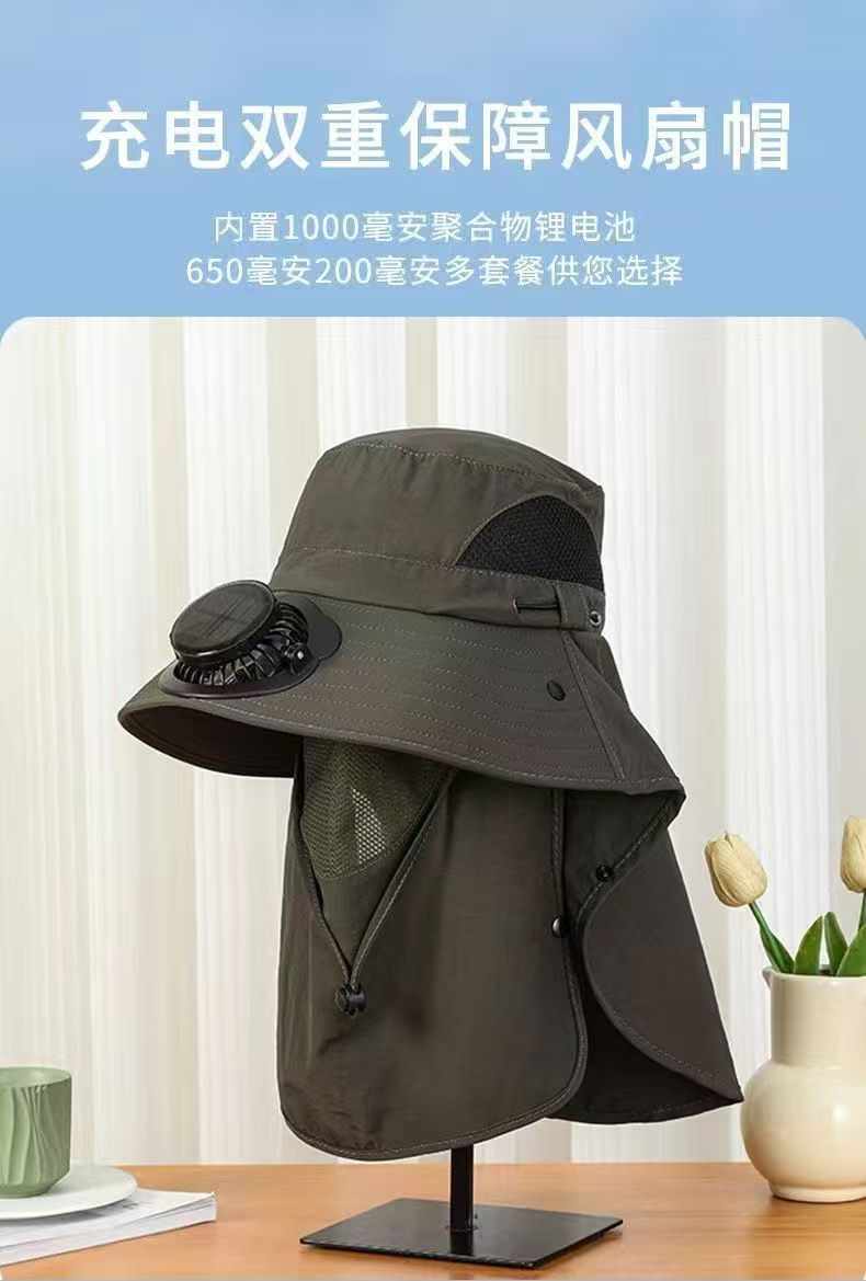 跨境男士钓鱼帽太阳能充电风扇帽带面罩户外出行大檐遮阳防晒帽子