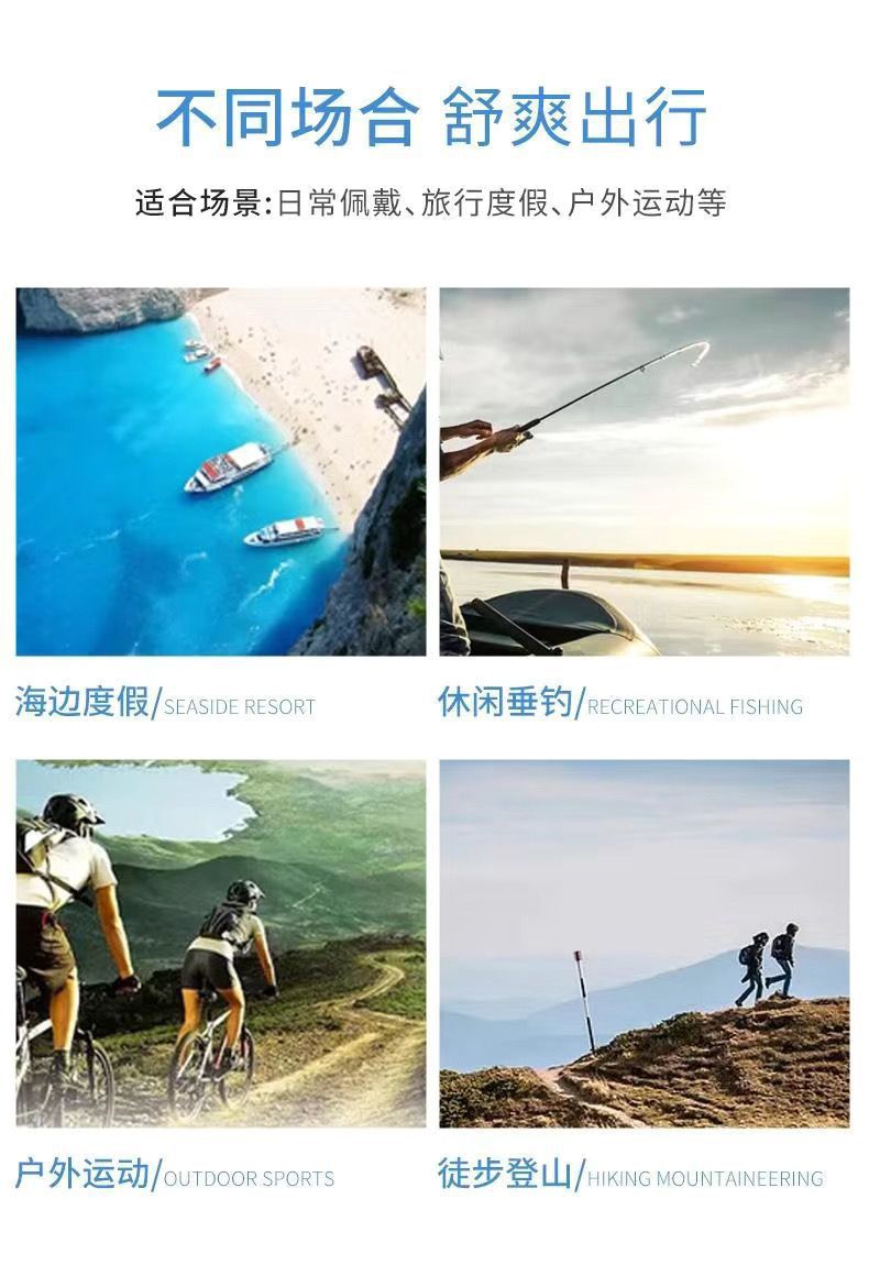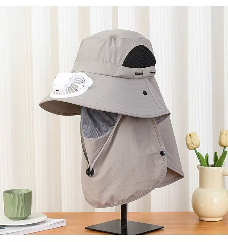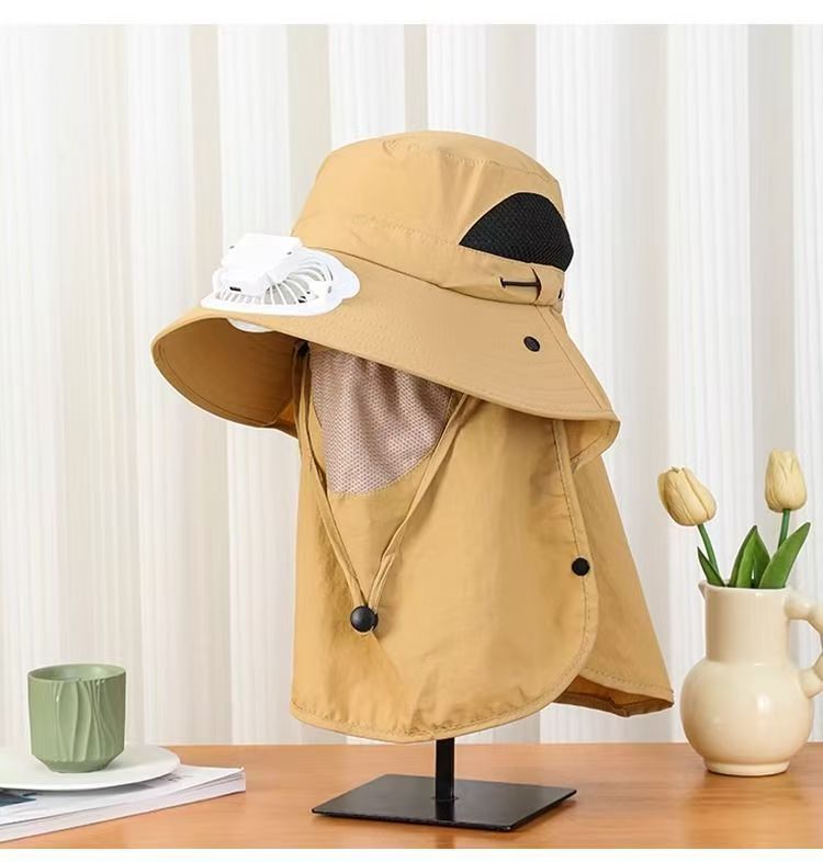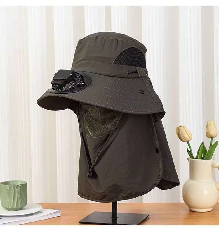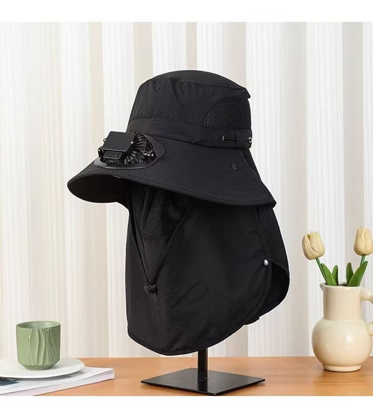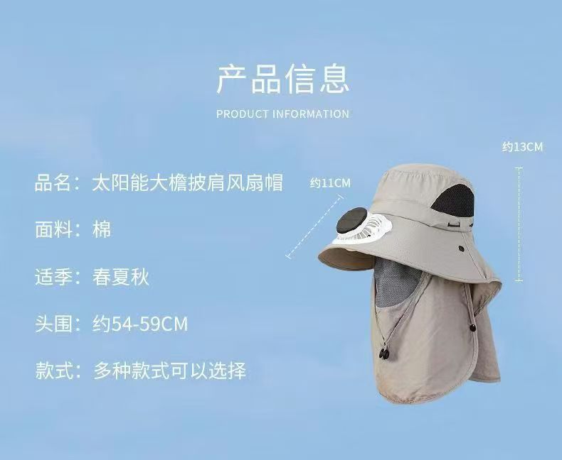 跨境男士钓鱼帽太阳能充电风扇帽带面罩户外出行大檐遮阳防晒帽子