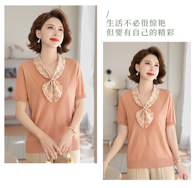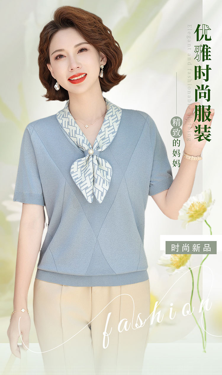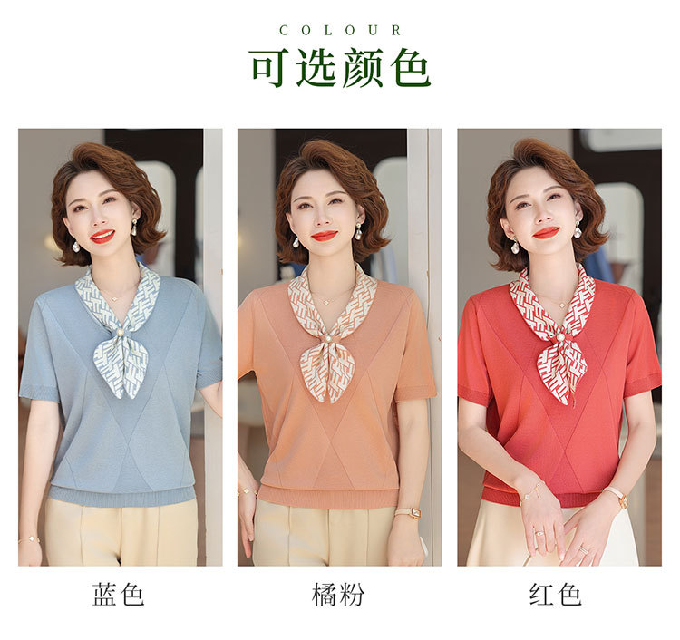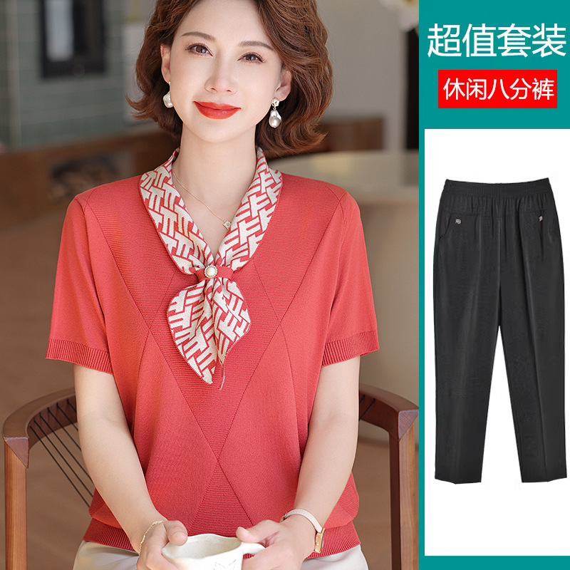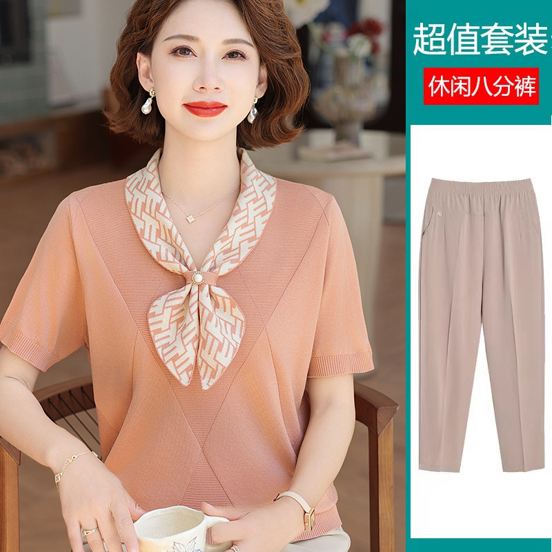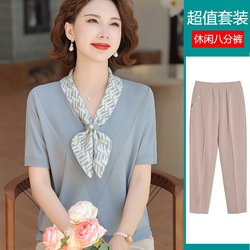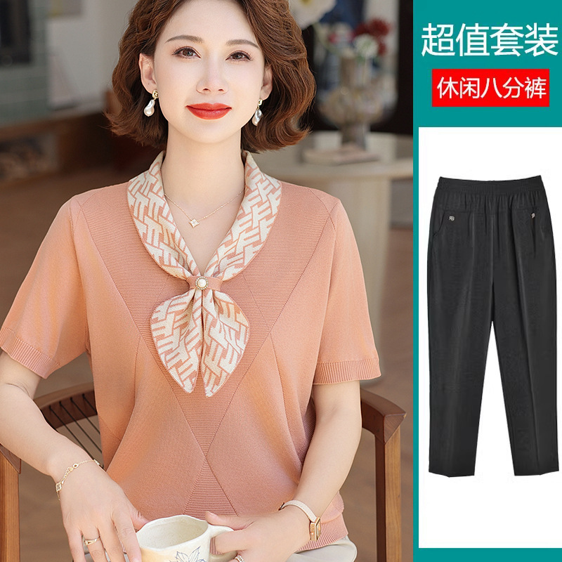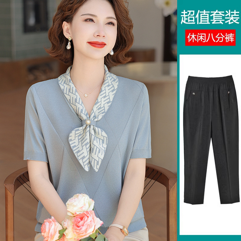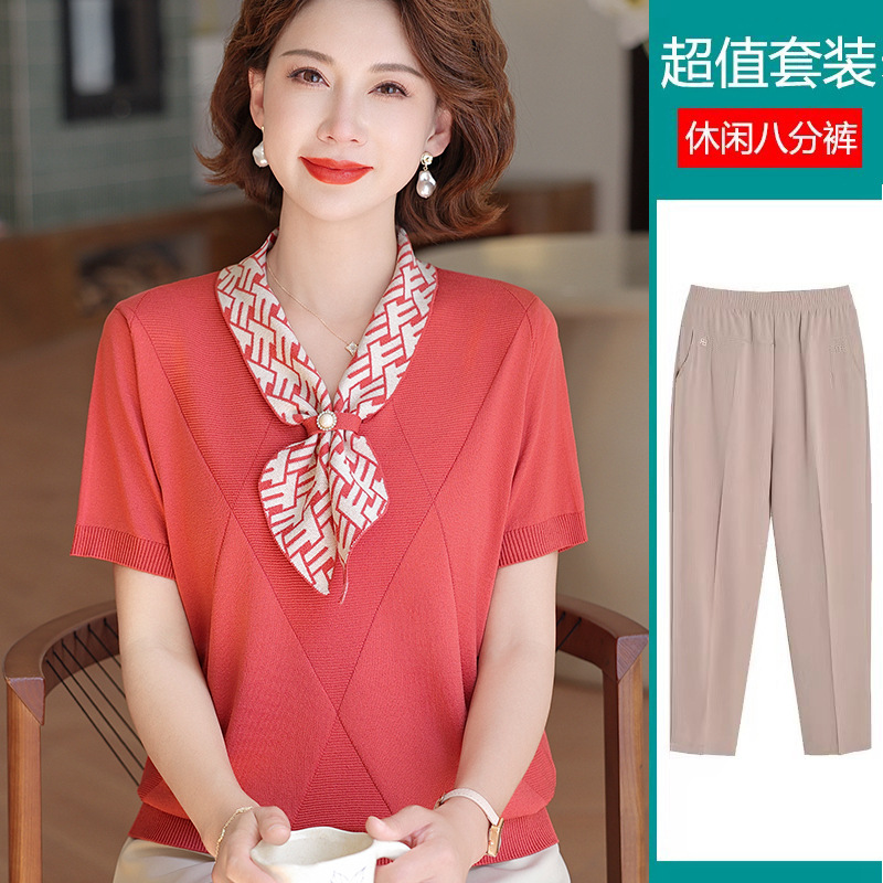 妈妈夏装短袖冰丝上衣40岁50中老年女装夏季薄款减龄T恤时尚套装