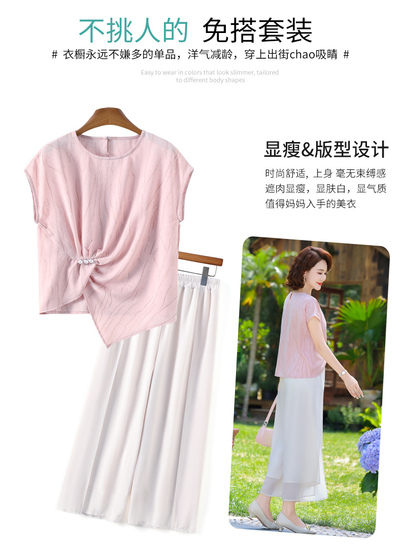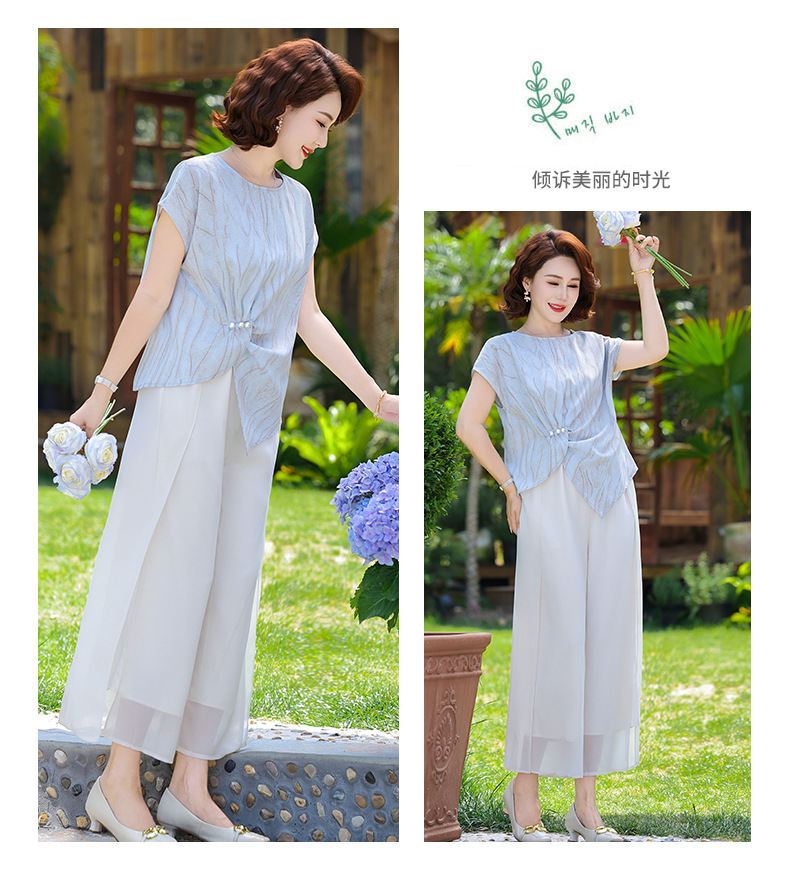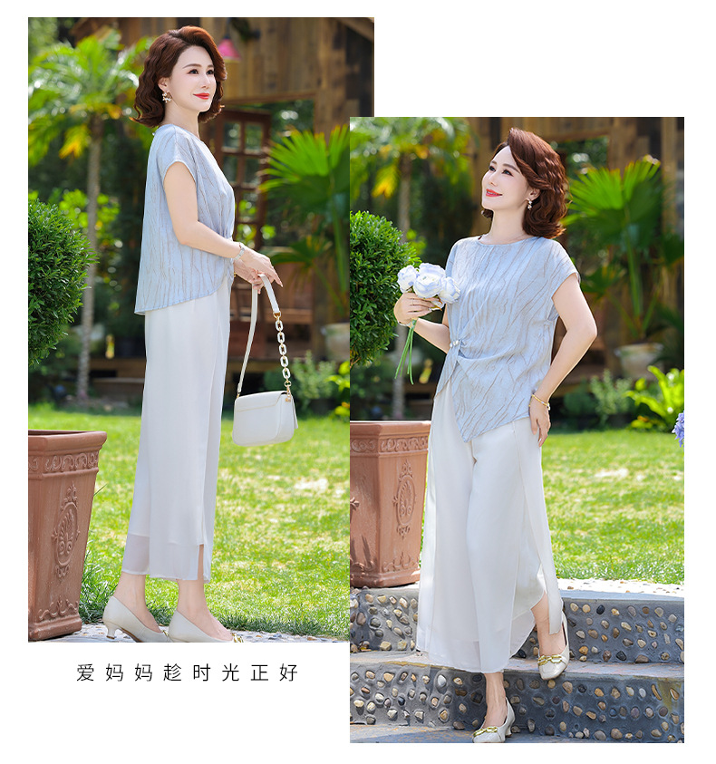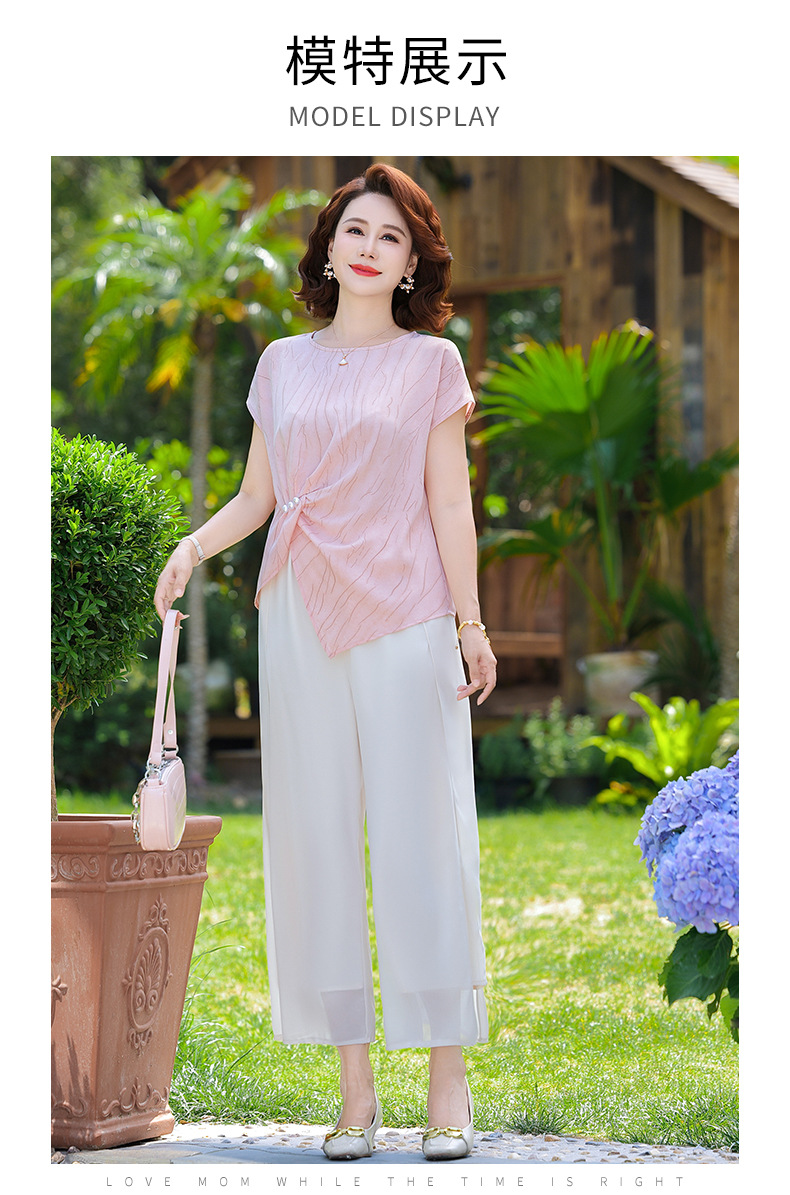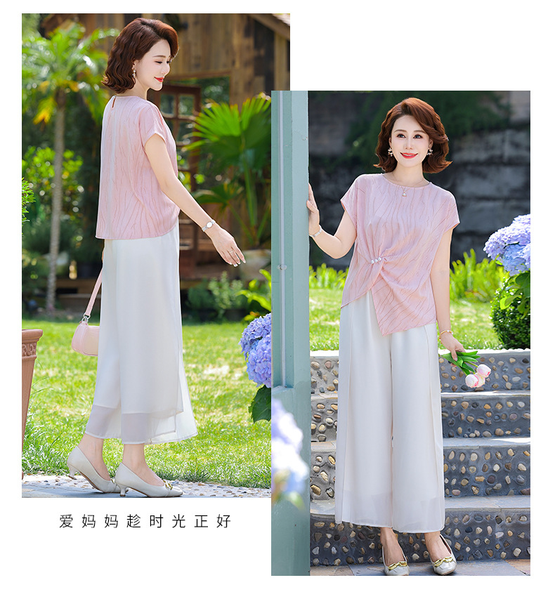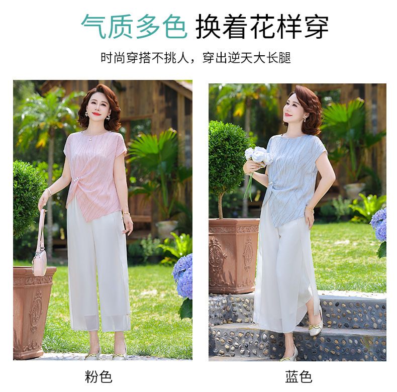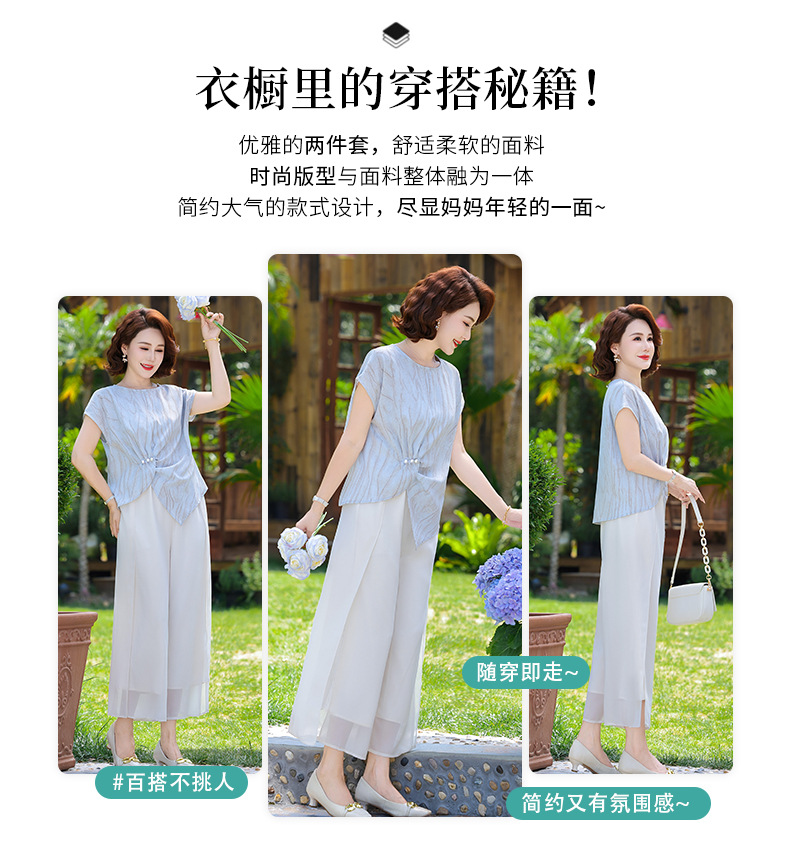 妈妈装夏季新款中老年短袖套装洋两件套收腰上衣时尚休闲百塔套装