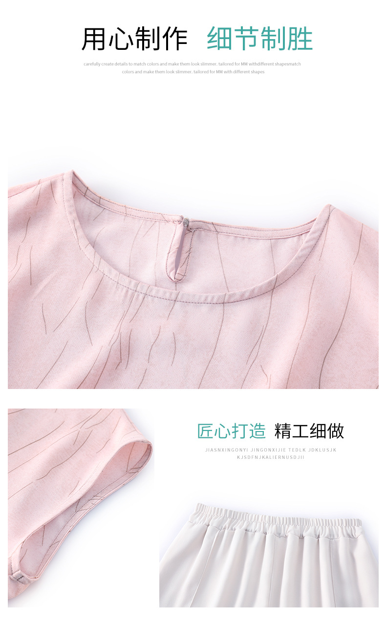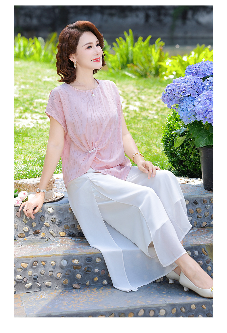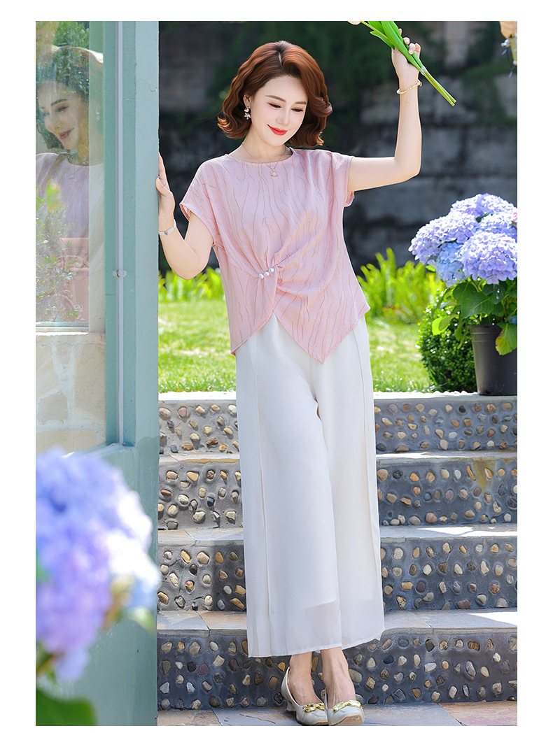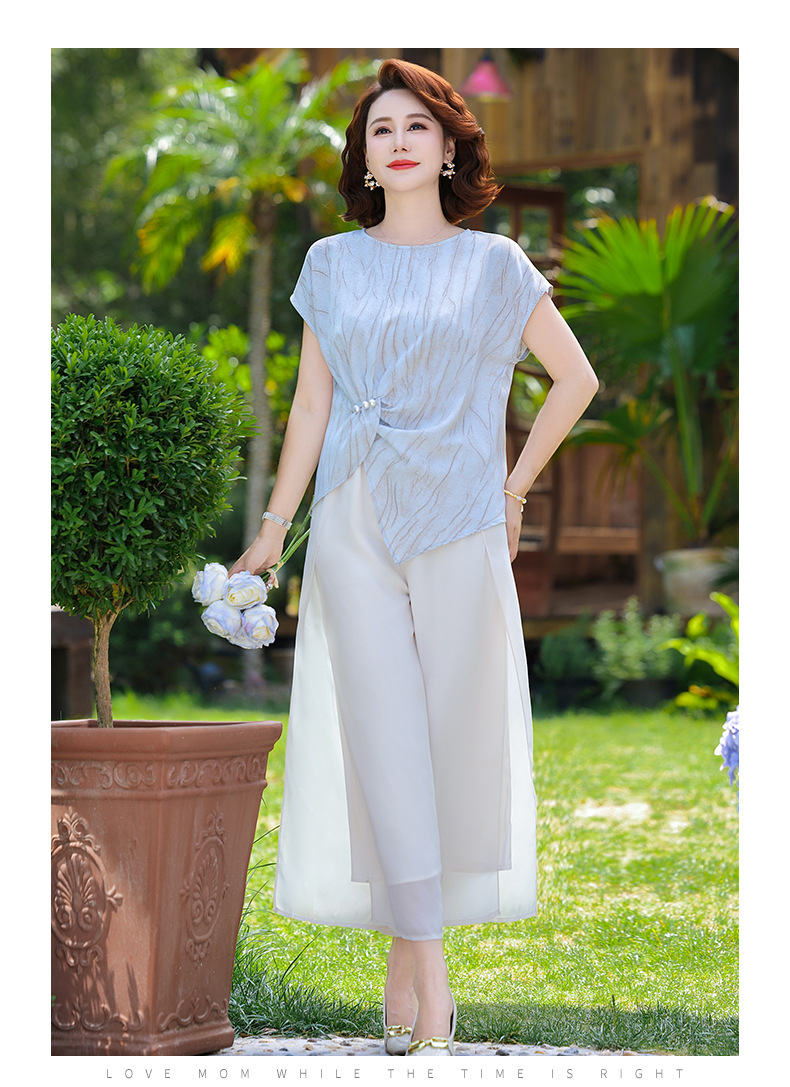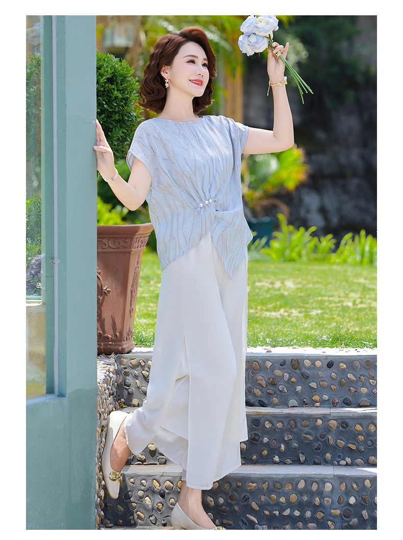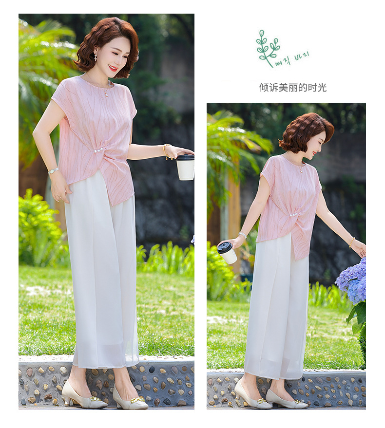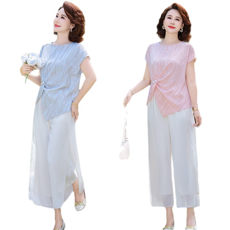 妈妈装夏季新款中老年短袖套装洋两件套收腰上衣时尚休闲百塔套装