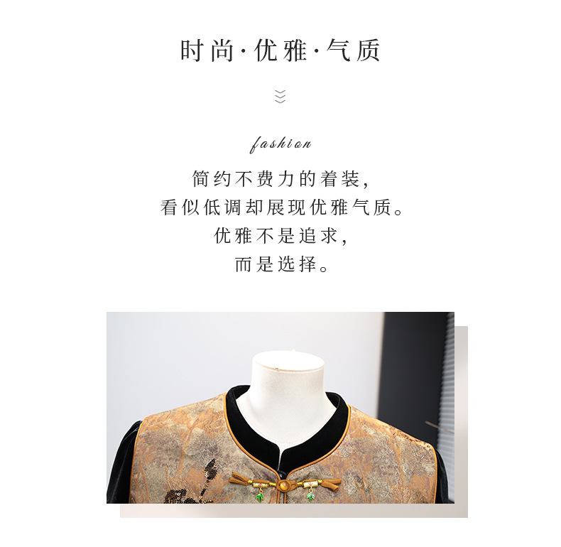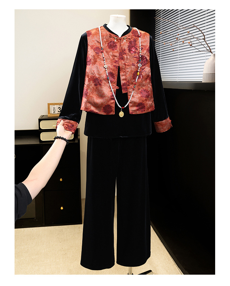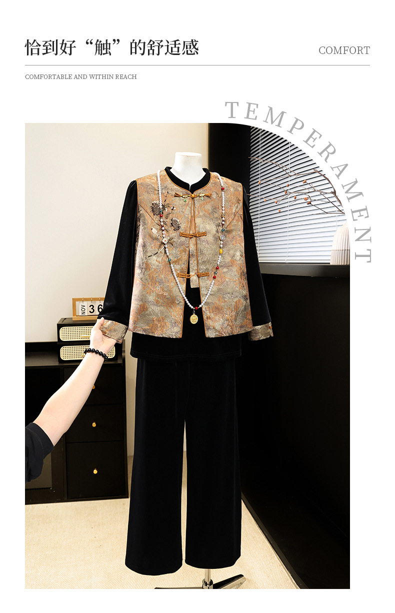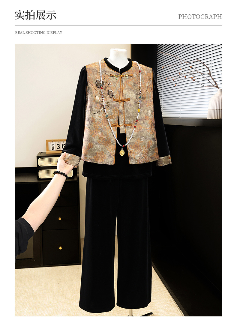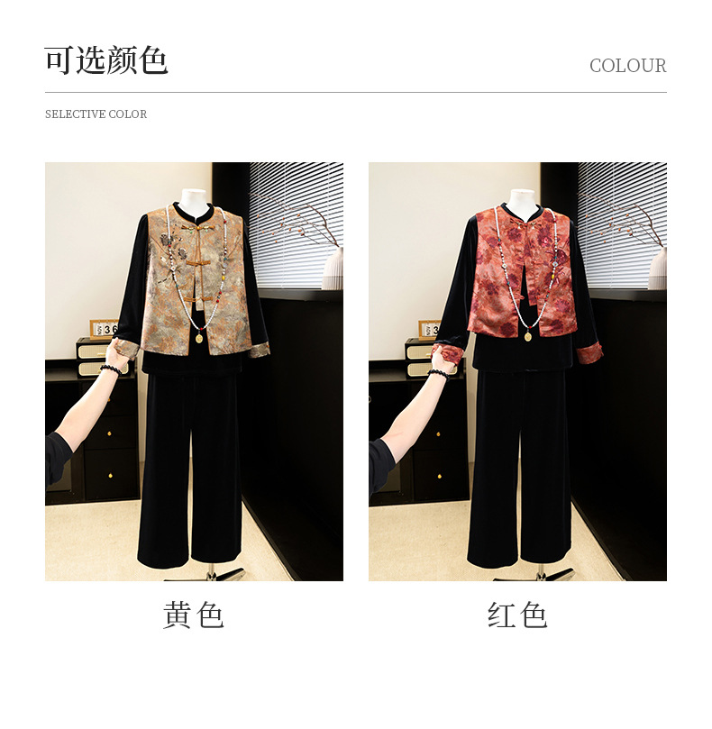 新中式国风妈妈春装金丝绒套装中老年人女春秋马甲外套高档三件套