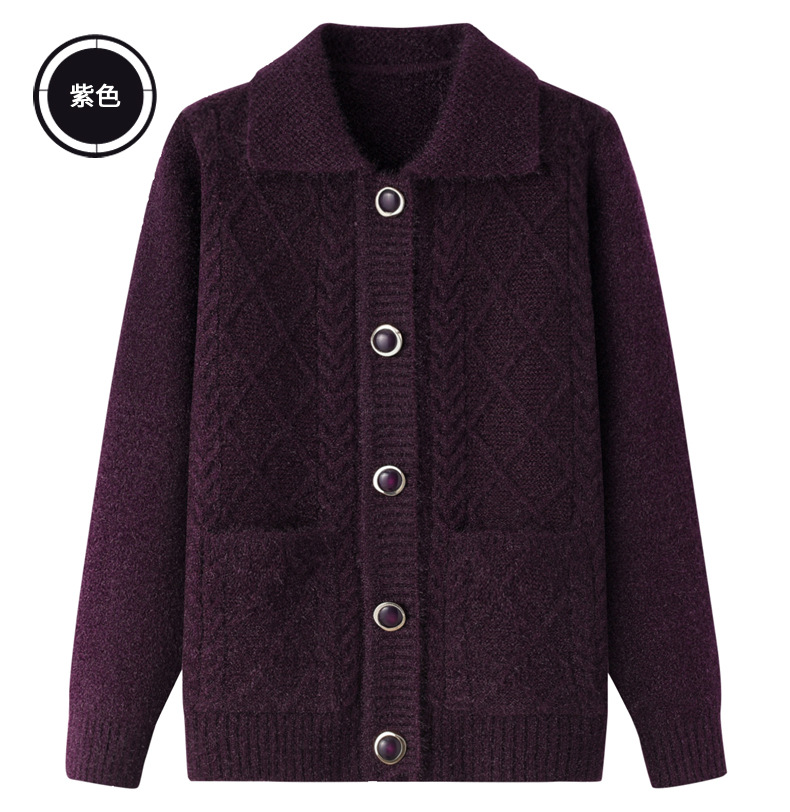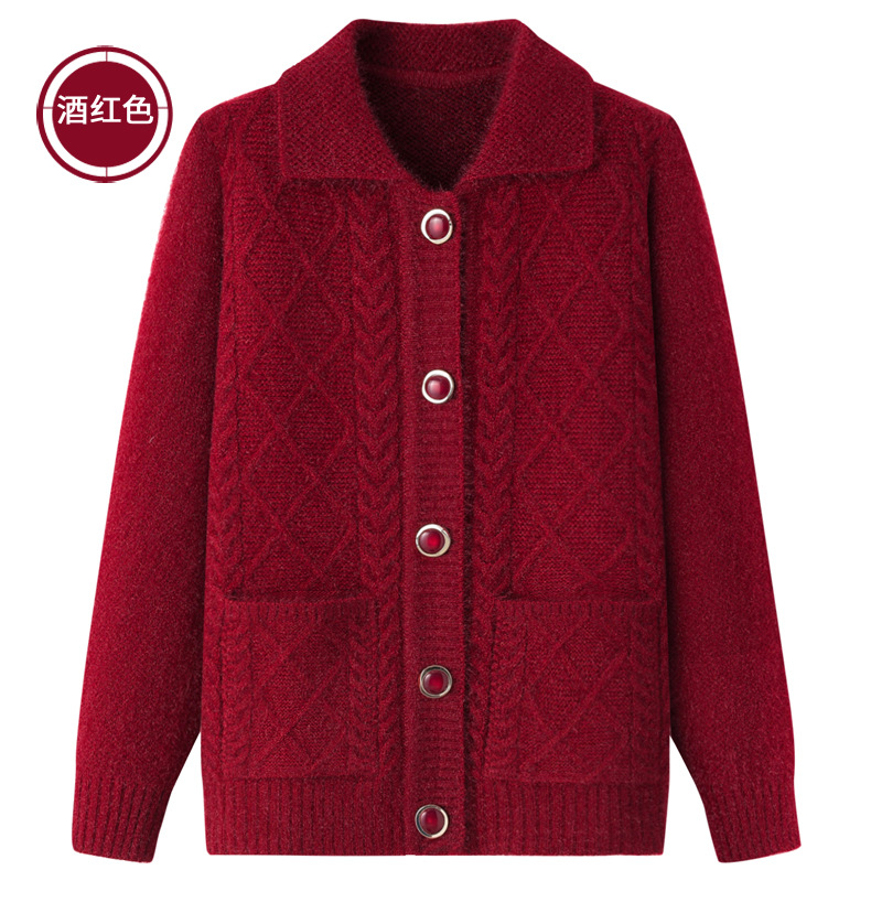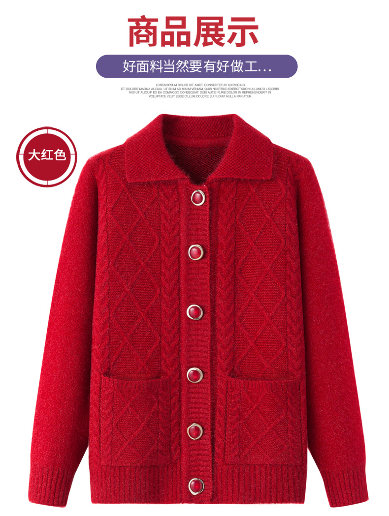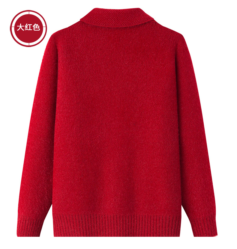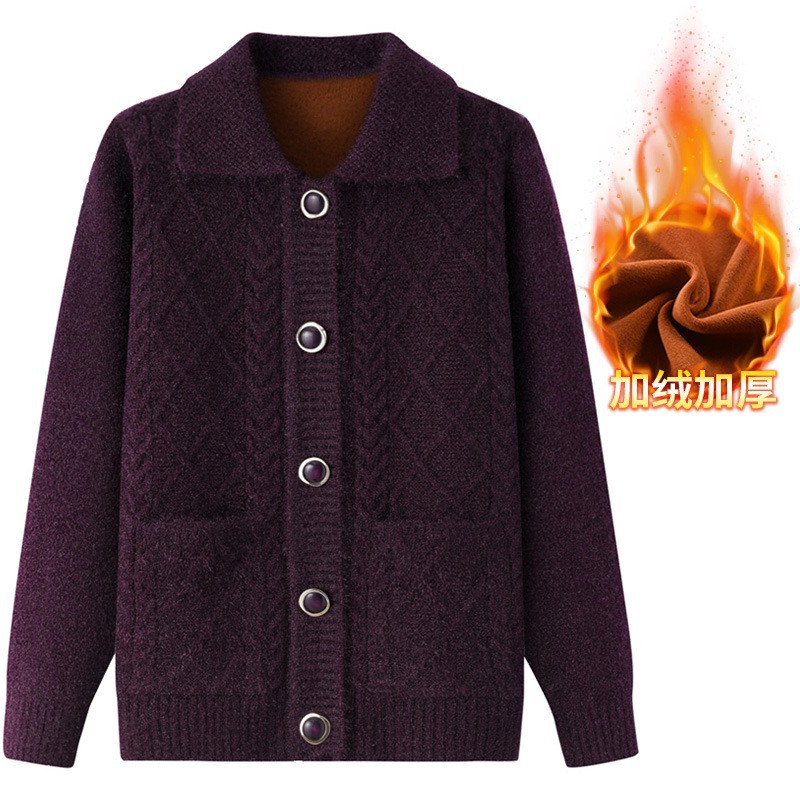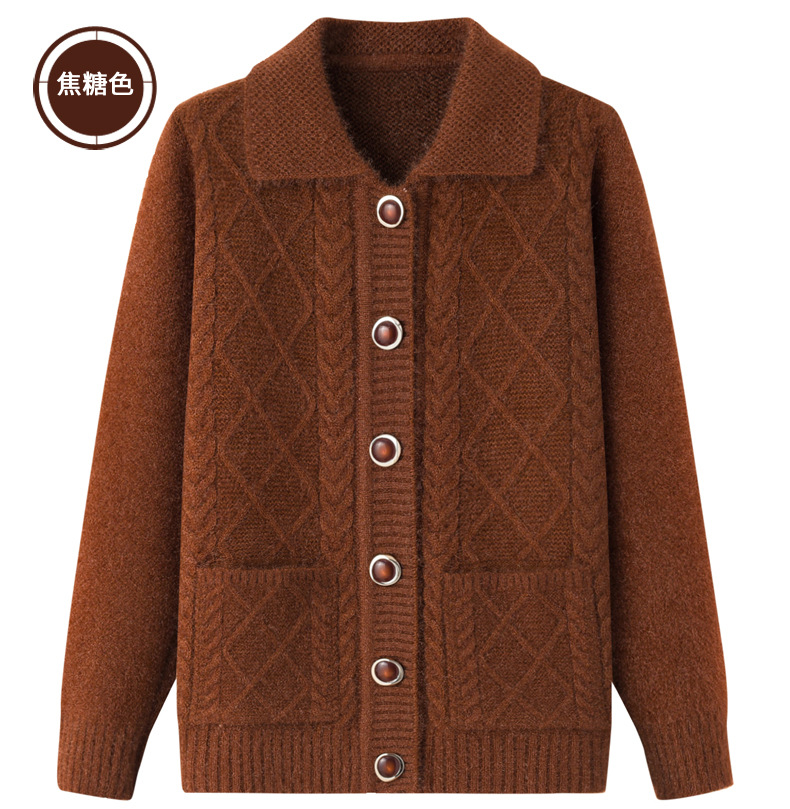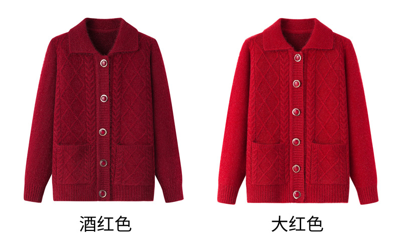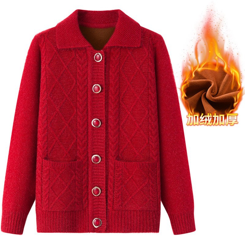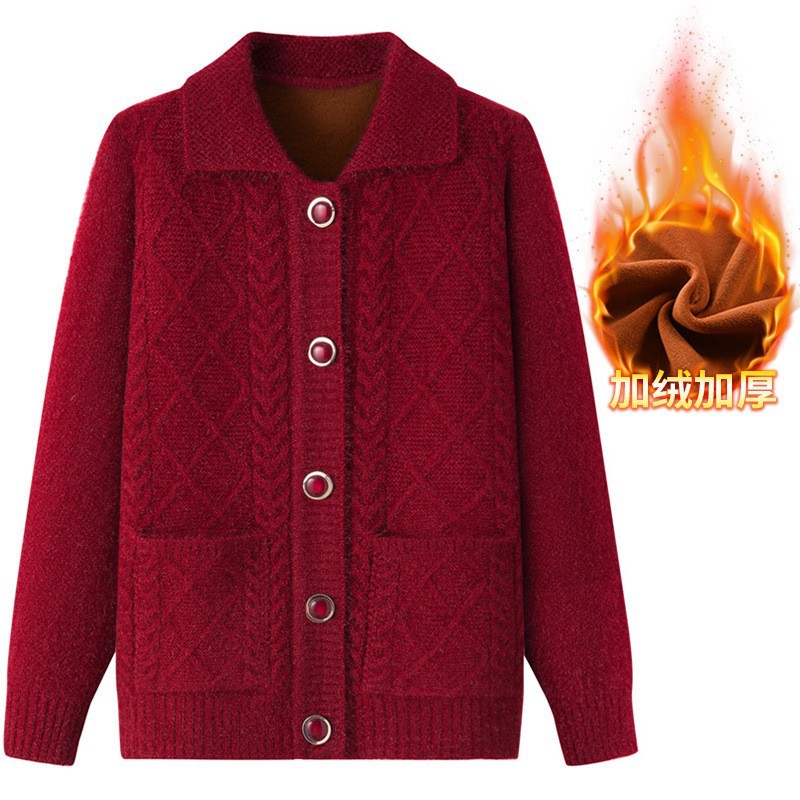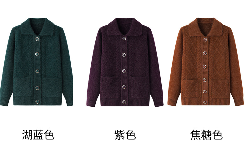 老年人秋冬外套女奶奶装加厚翻领妈妈装针织衫开衫中老年毛衣春装