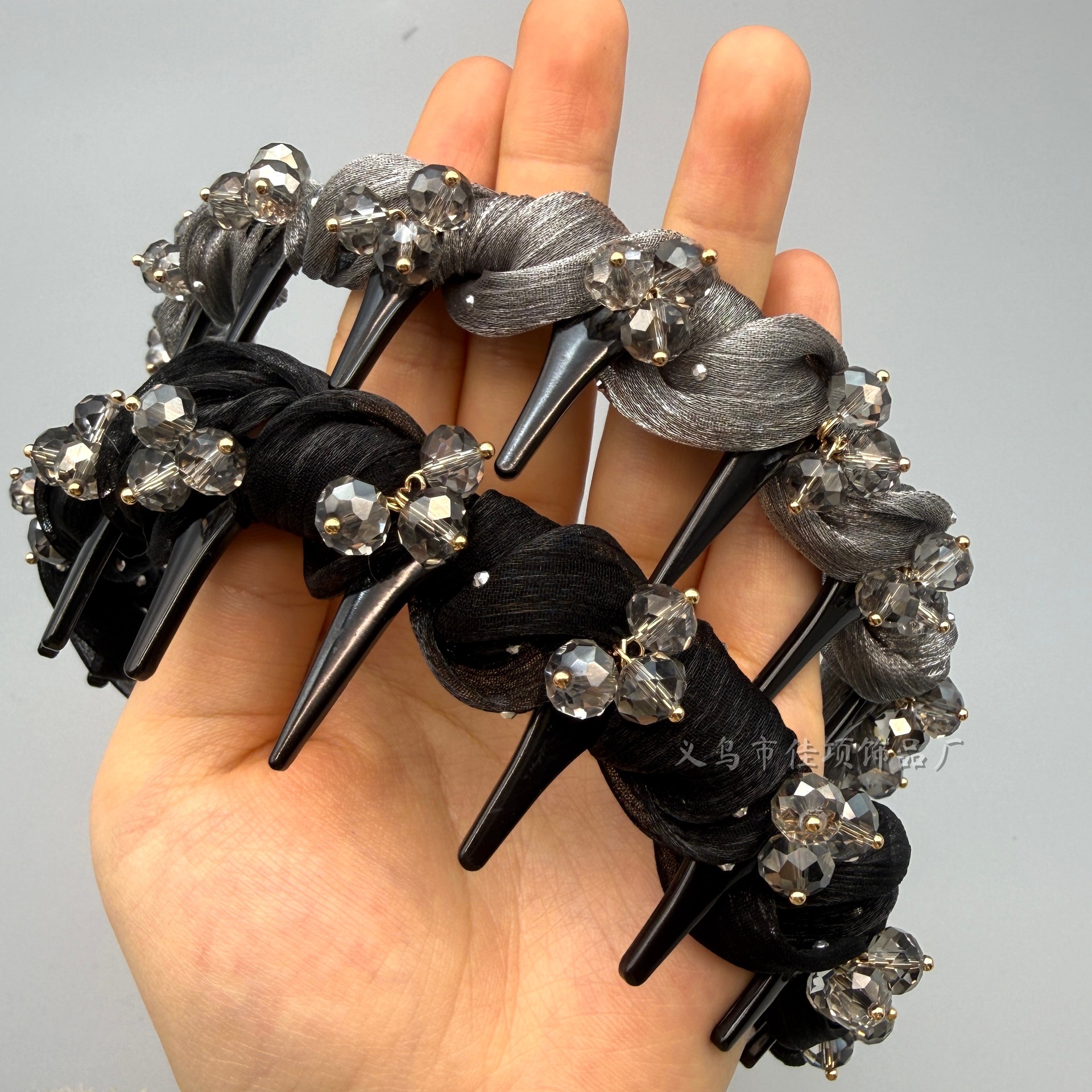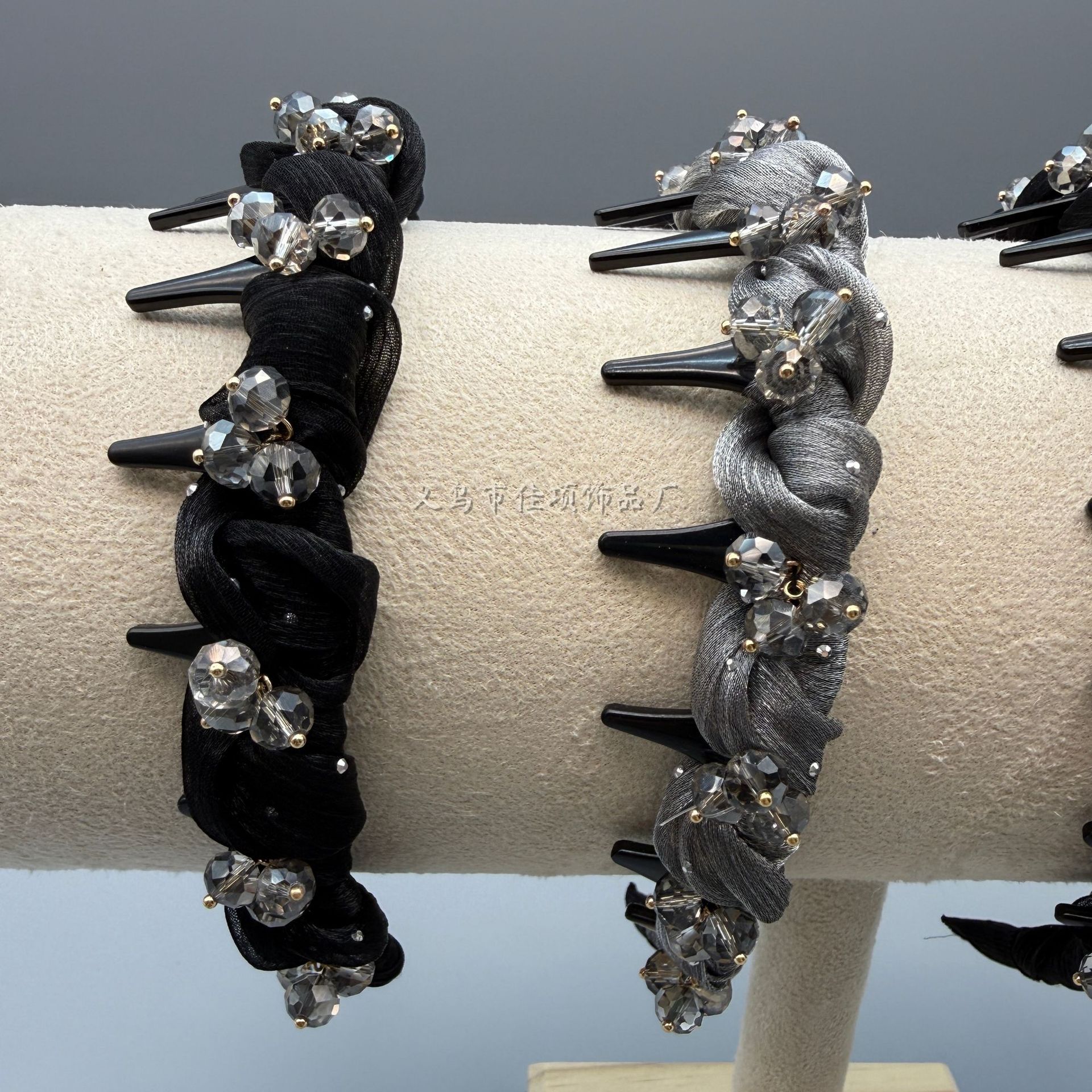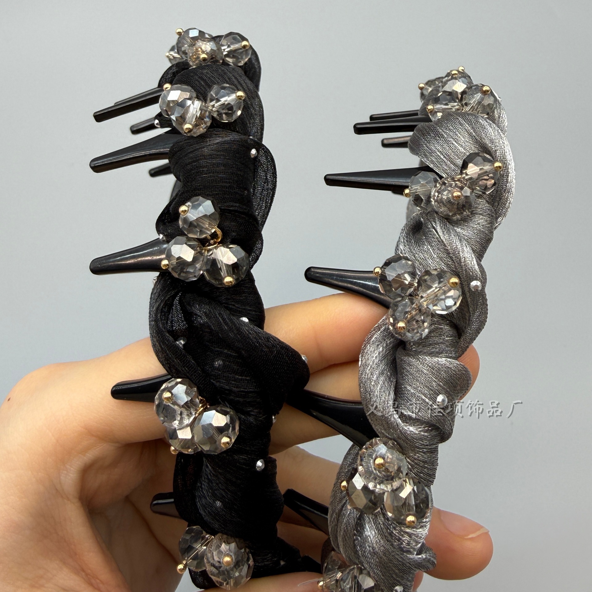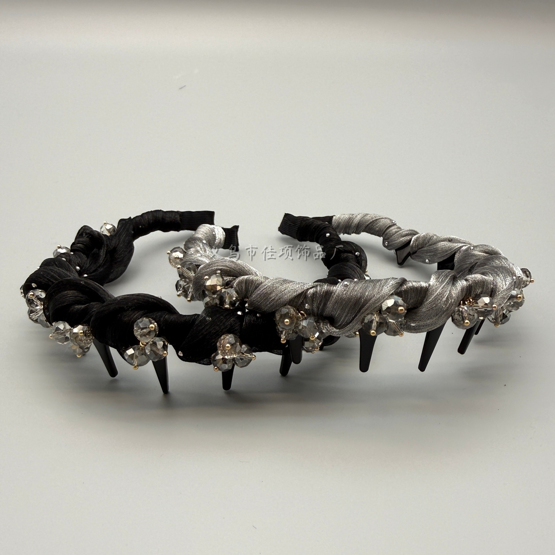 新款烫钻纱布水晶发箍轻奢蓬松气质带齿梳防滑设计感发饰头饰头箍